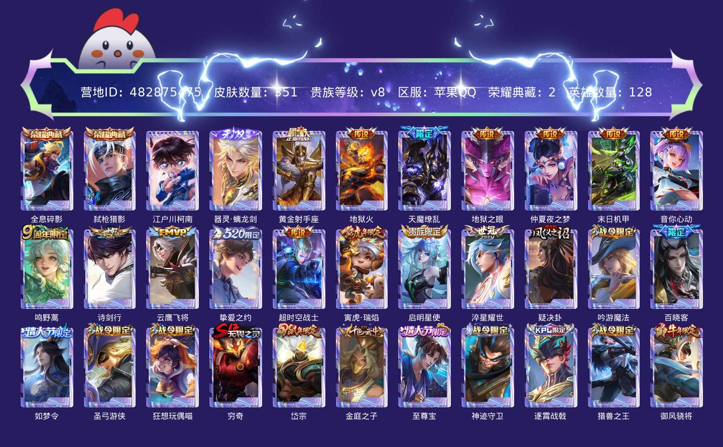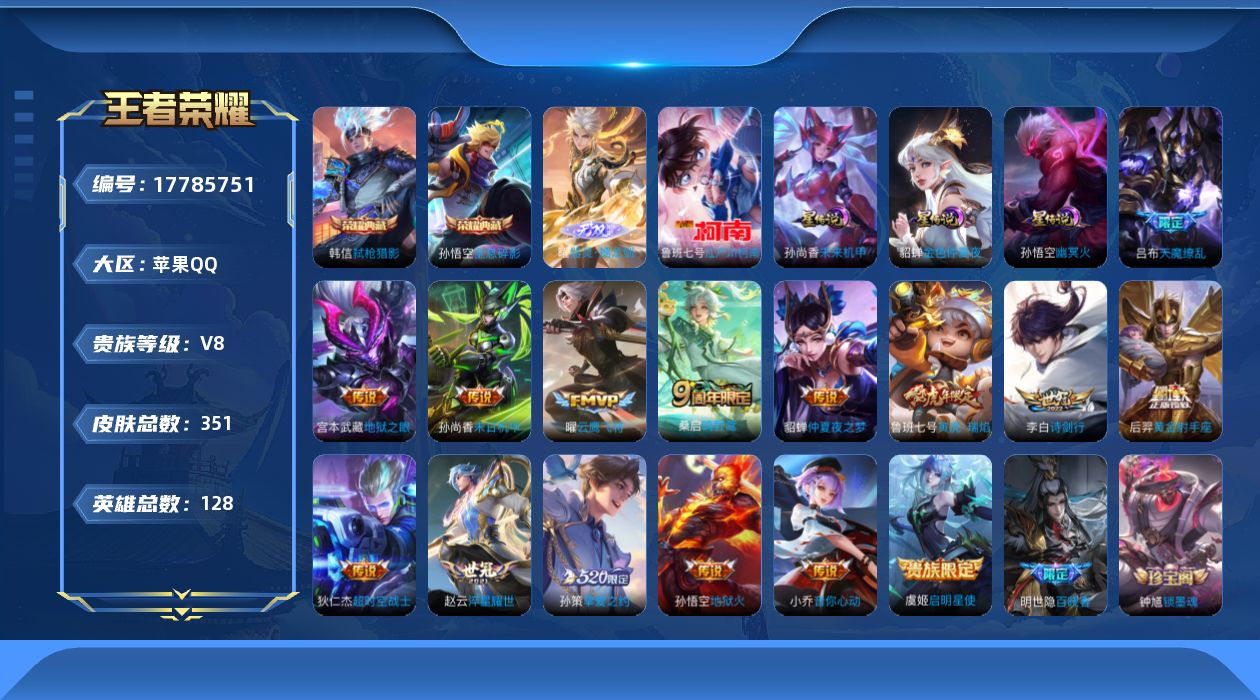 贵族等级:v8皮肤数:351传说品质15 情人节限定3 生肖限定5 荣耀典藏2 无双1 珍品传说1 英雄数:128