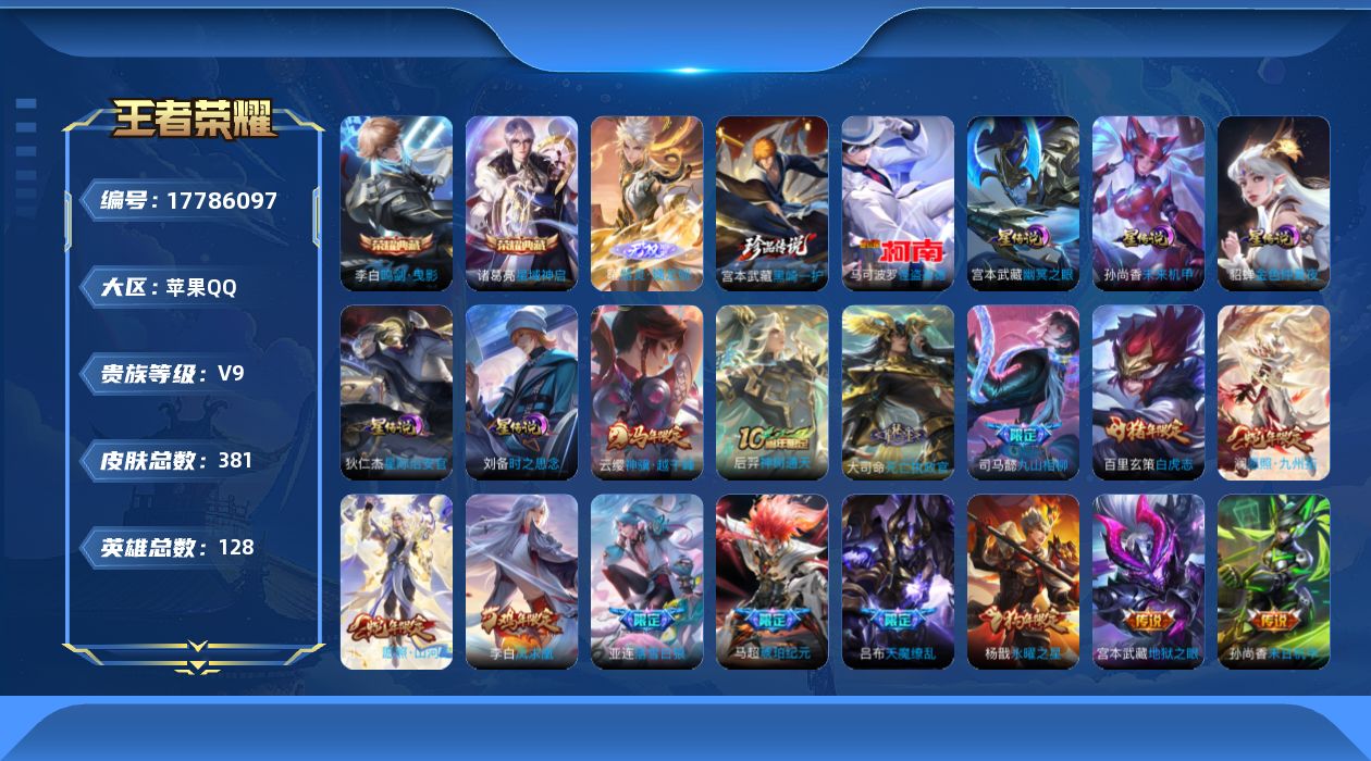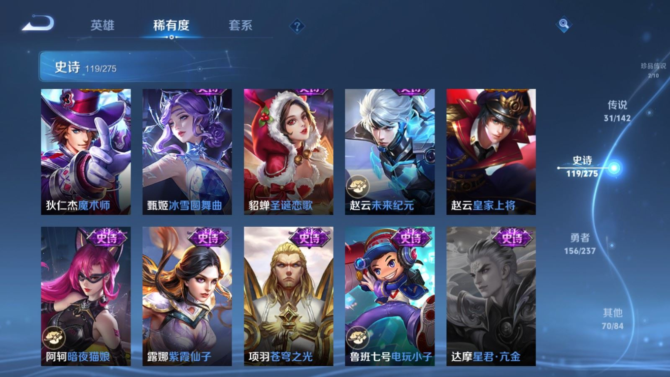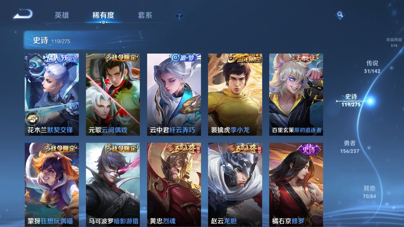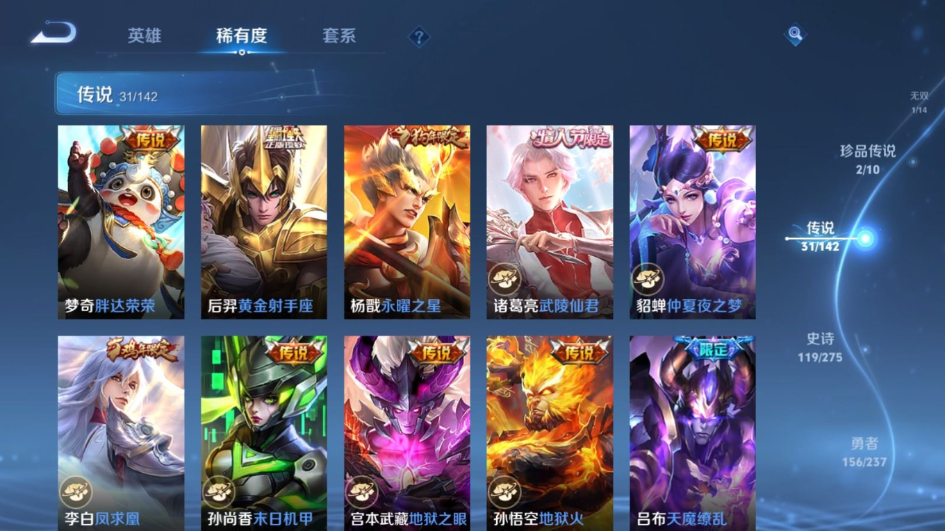 传说品质_后羿_黄金射手座传说品质_后羿_神树通天传说品质_司空震_愿照·山河定传说品质_澜_愿照·九州拓传说品质_诸葛亮_武陵仙君传说品质_孙悟空_地狱火传说品质_吕布_曦玄引传说品质_吕布_天魔缭乱传说品质_马超_琥珀纪元传说品质_杨戬_永曜之星传说品质_干将莫邪_久胜战神传说品质_宫本武藏_地狱之眼传说品质_花木兰_冠军飞将传说品质_貂蝉_仲夏夜之梦传说品质_李信_一念神魔传说品质_孙尚香_末日机甲传说品质_梦奇_胖达荣荣传说品质_司马懿_九山相柳传说品质_桑启_鸣野蒿传说品质_刘备_时之恋人传说品质_云缨_幻光神枪传说品质_云缨_神骥·越千峰传说品质_李白_凤求凰传说品质_大司命_死亡执政官传说品质_亚连_落雪白狼传说品质_曜_云鹰飞将传说品质_狄仁杰_超时空战士传说品质_达摩_黄金狮子座传说品质_虞姬_云霓雀翎传说品质_虞姬_启明星使传说品质_百里玄策_白虎志