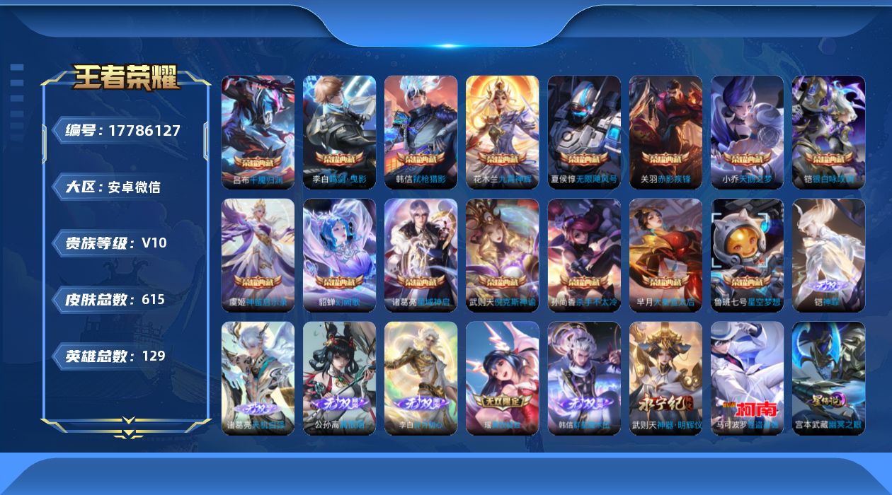 贵族等级:v10皮肤数:615生肖限定29 传说品质95 情人节限定10 荣耀典藏15 无双7 珍品传说1 英雄数:129