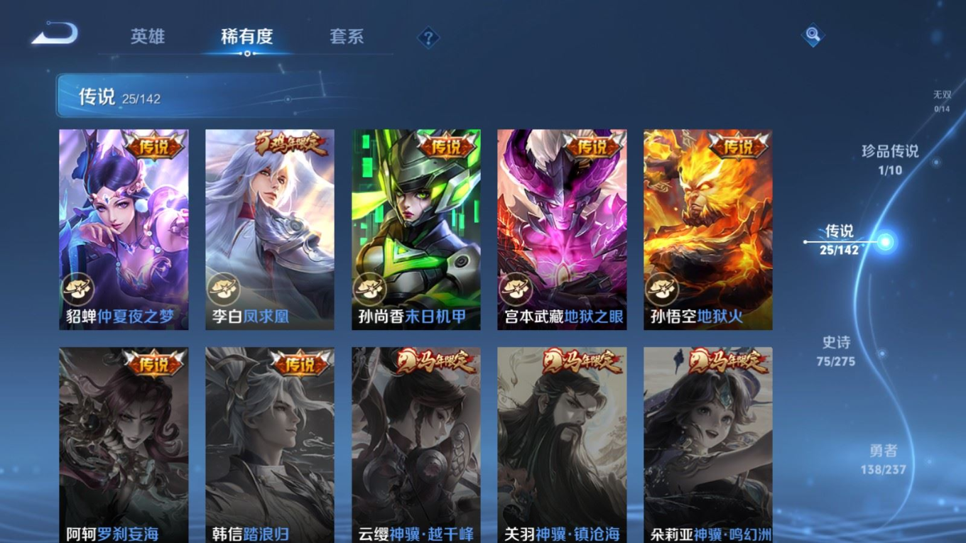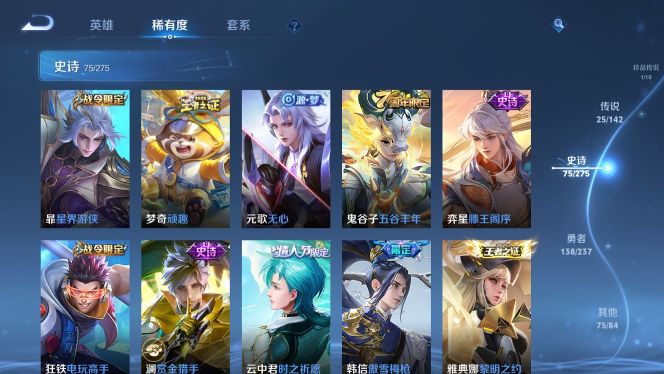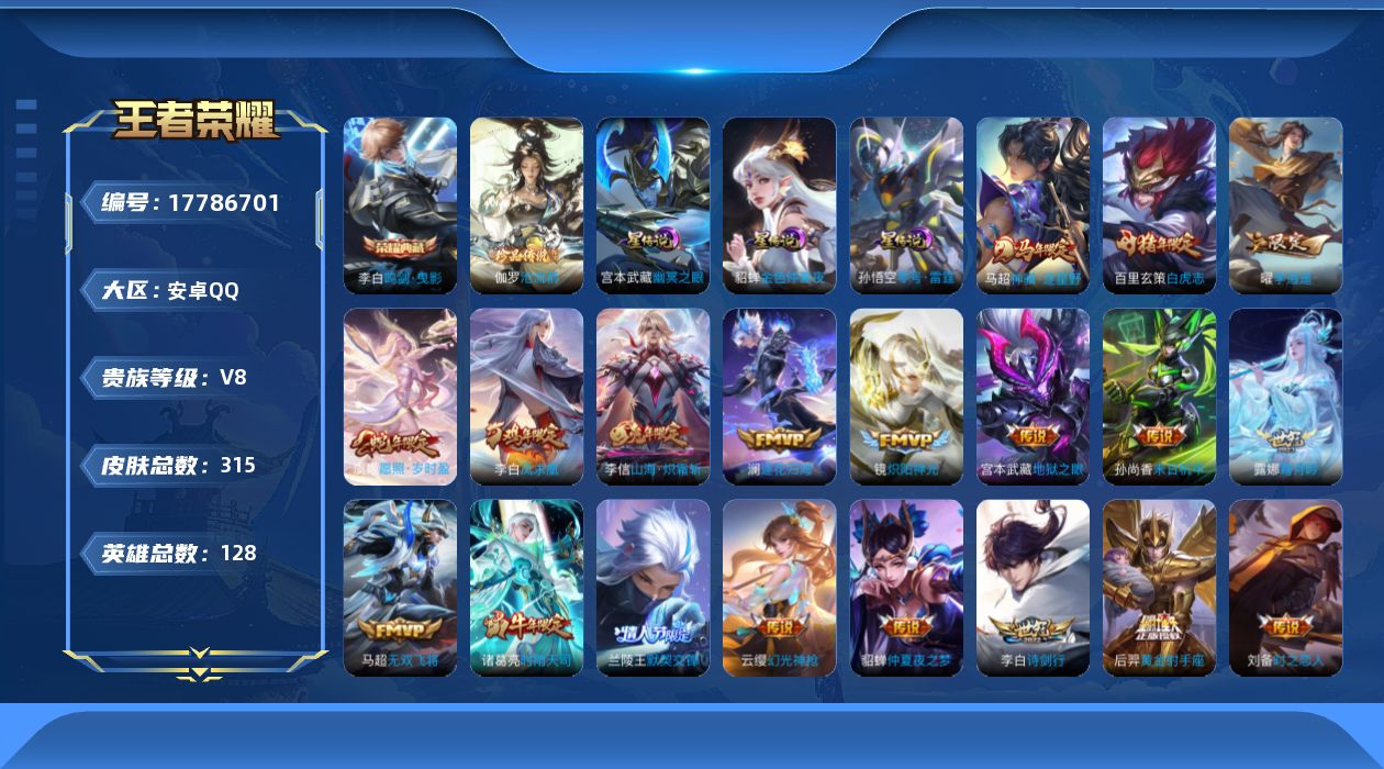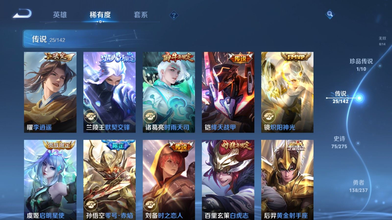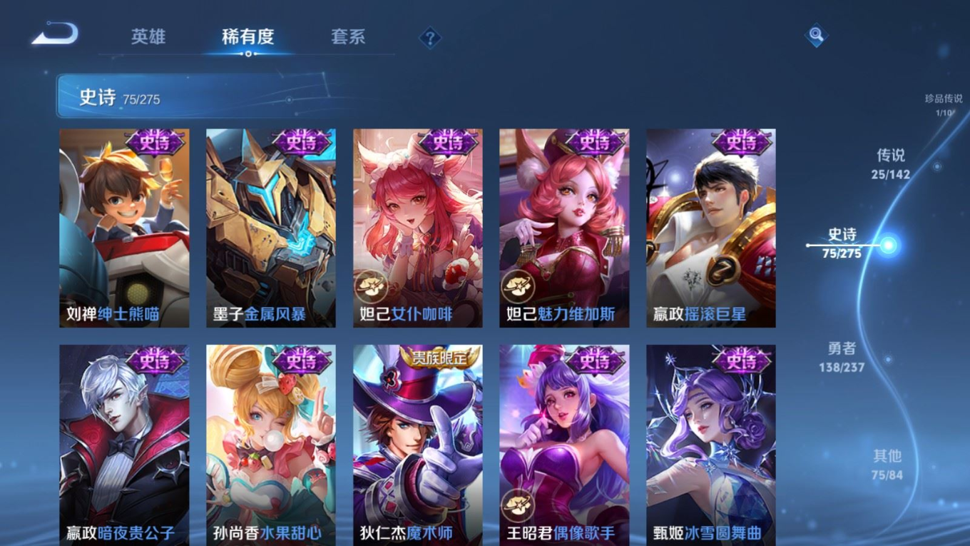 贵族等级:v8皮肤数:315传说品质25 生肖限定8 情人节限定4 荣耀典藏1 珍品传说1 英雄数:128