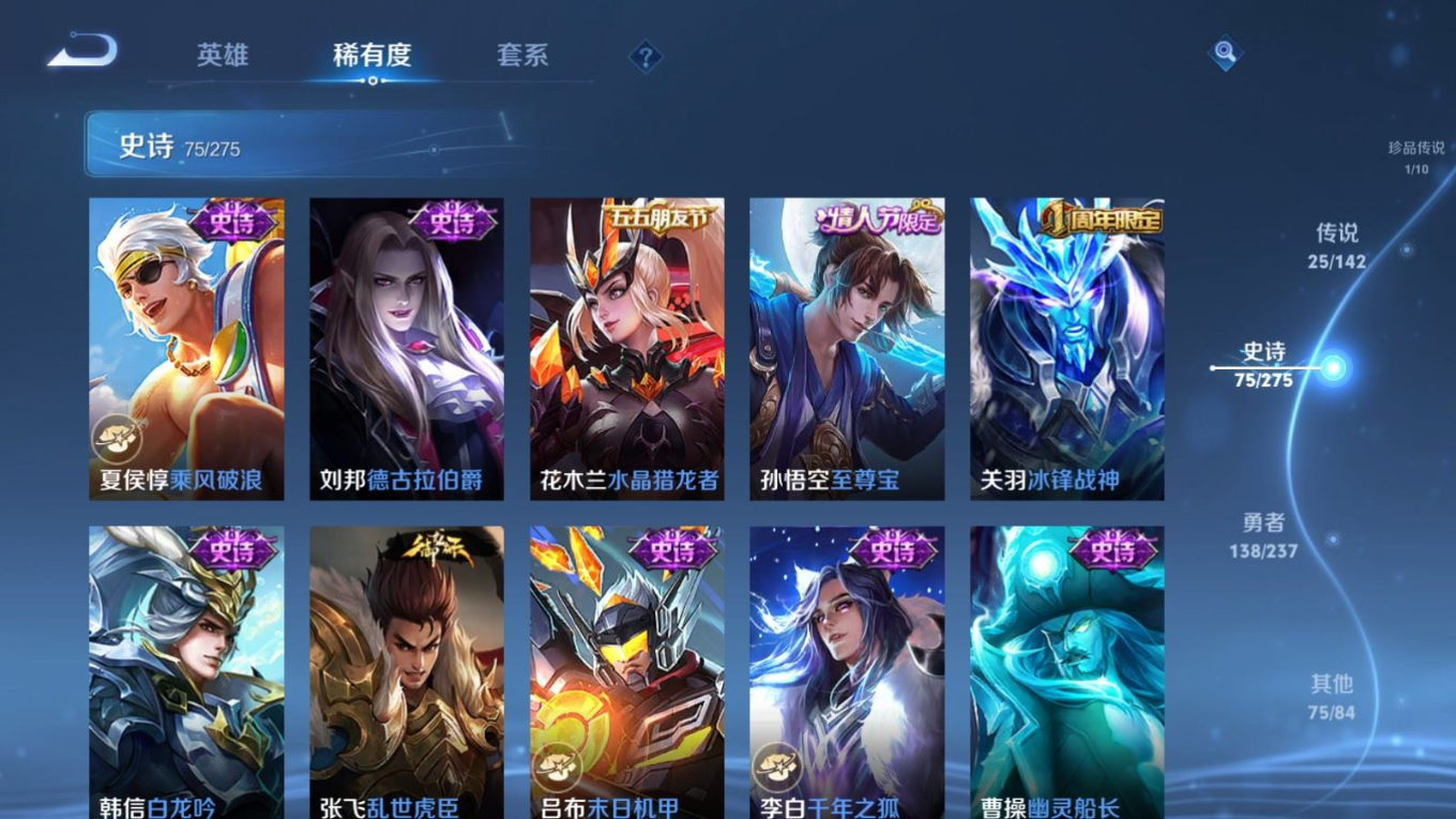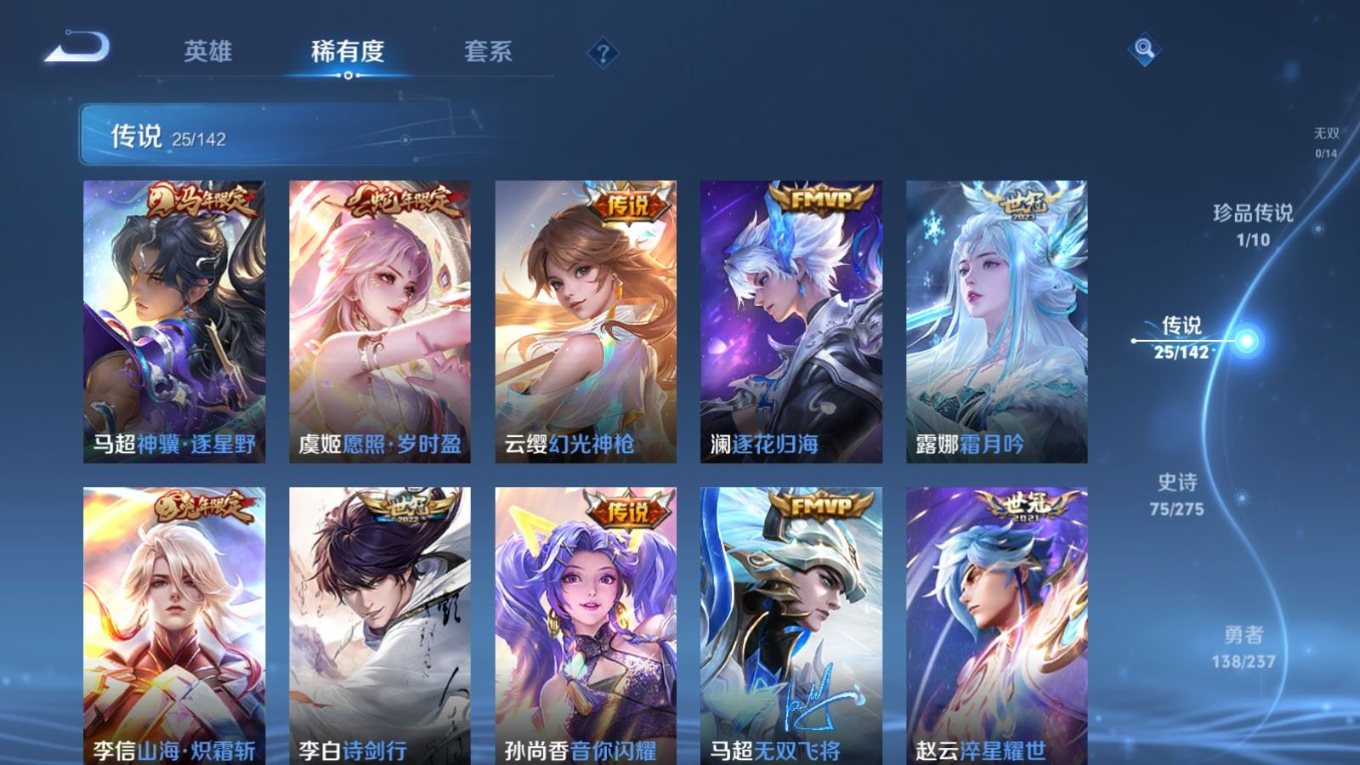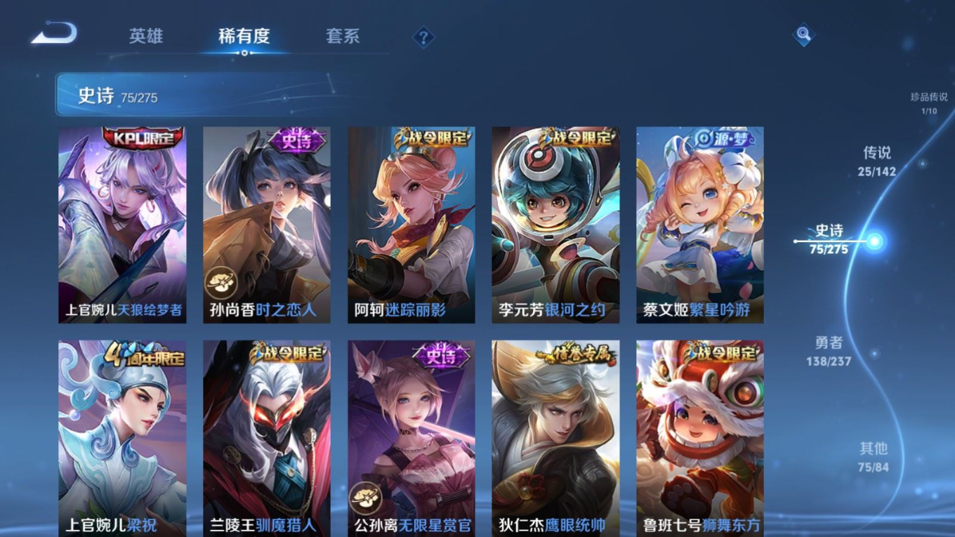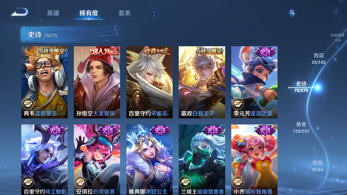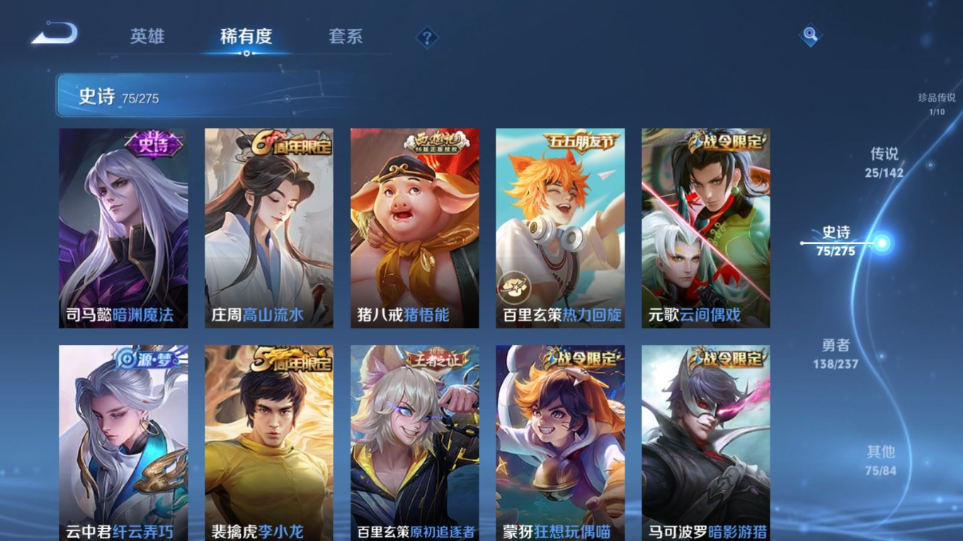 贵族等级:v8皮肤数:315传说品质25 生肖限定8 情人节限定4 荣耀典藏1 珍品传说1 英雄数:128