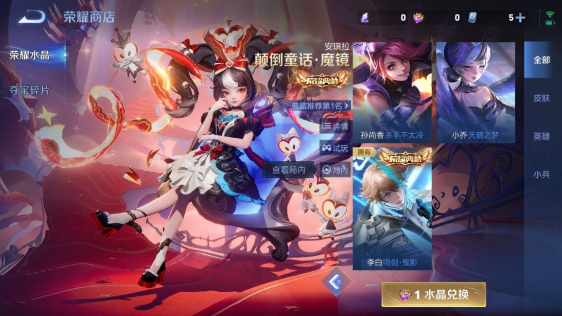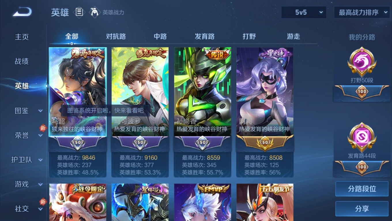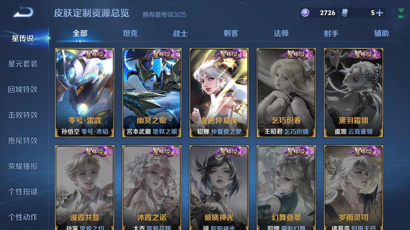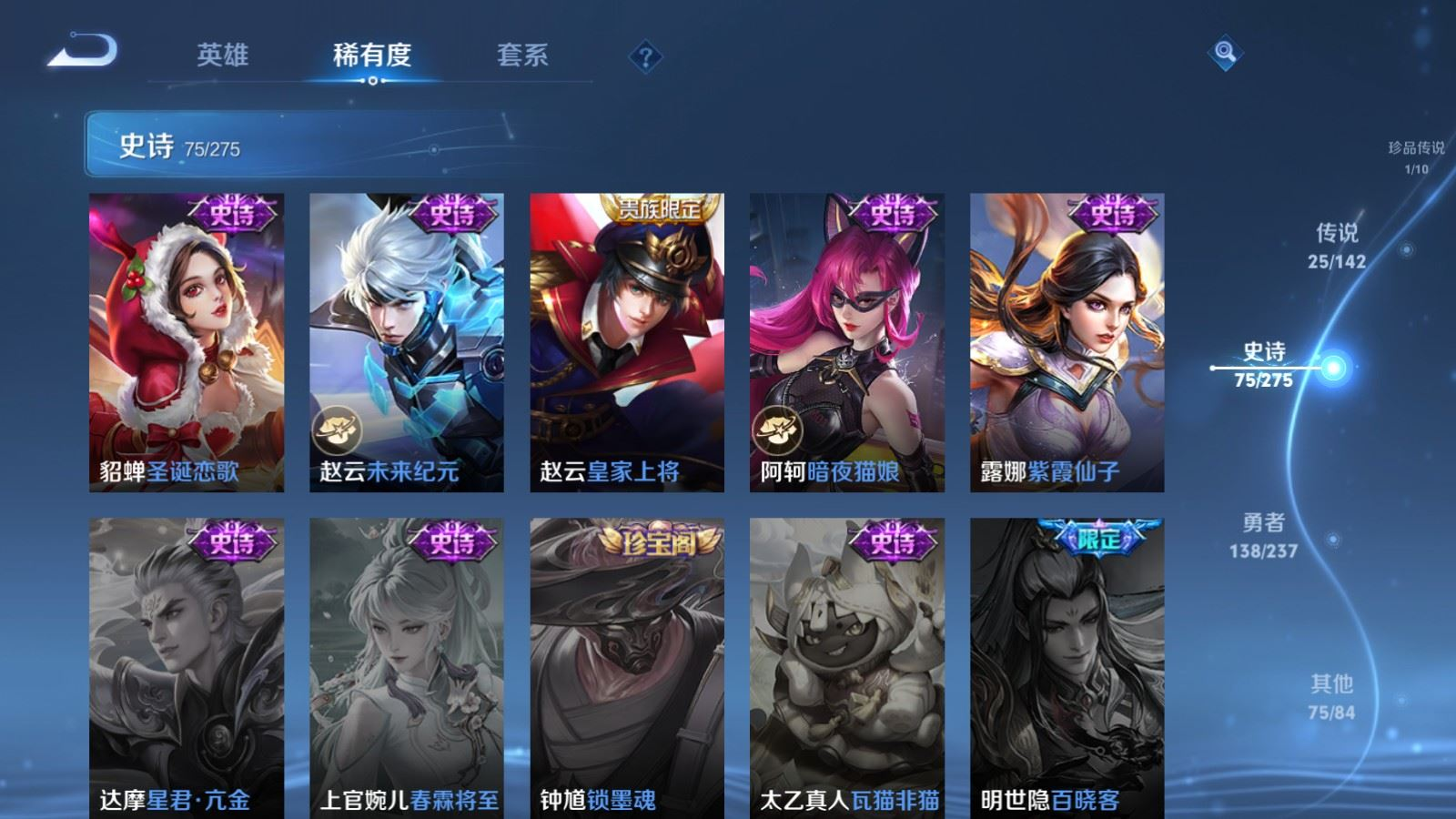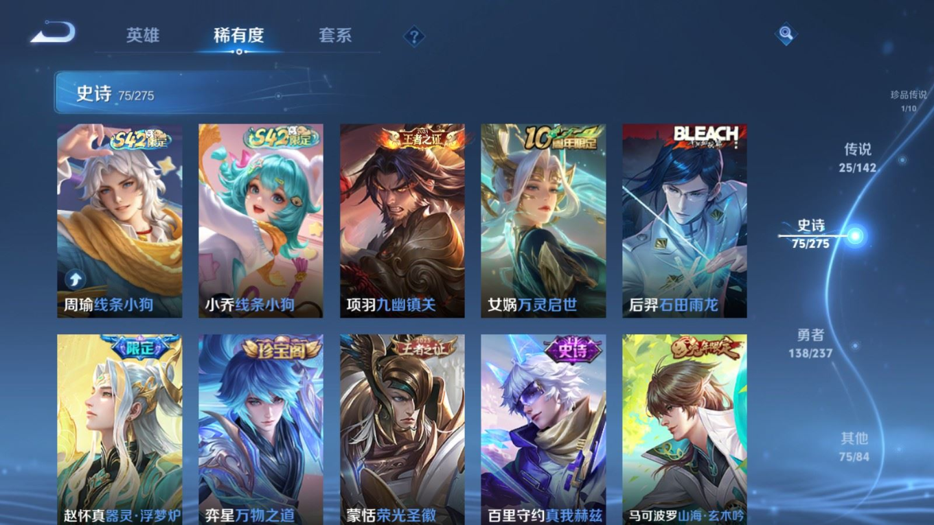 贵族等级:v8皮肤数:315传说品质25 生肖限定8 情人节限定4 荣耀典藏1 珍品传说1 英雄数:128