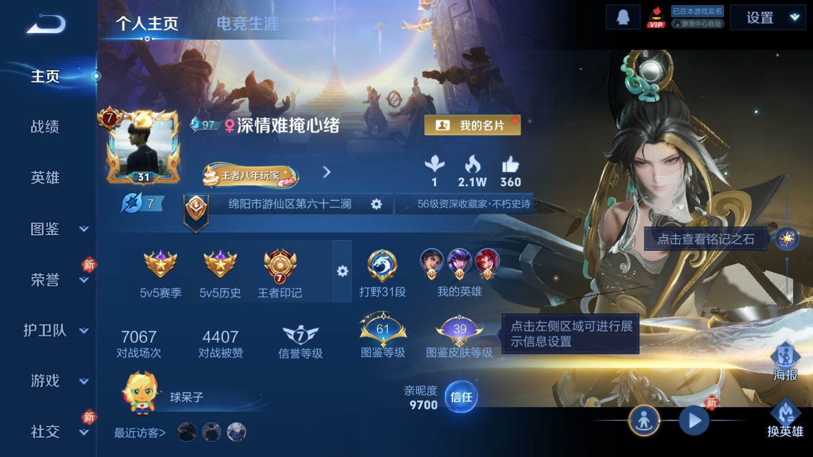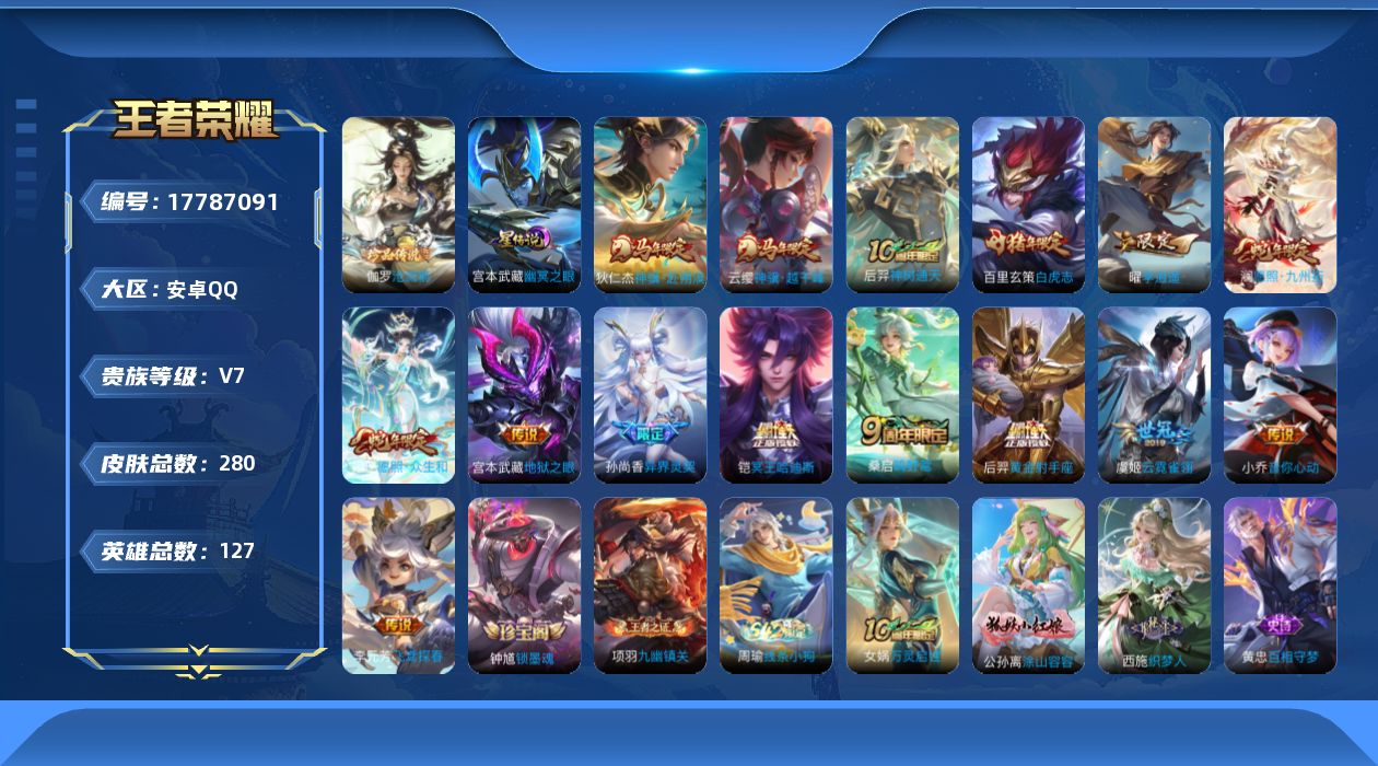 贵族等级:v7皮肤数:280传说品质15 生肖限定7 情人节限定2 珍品传说1 英雄数:127