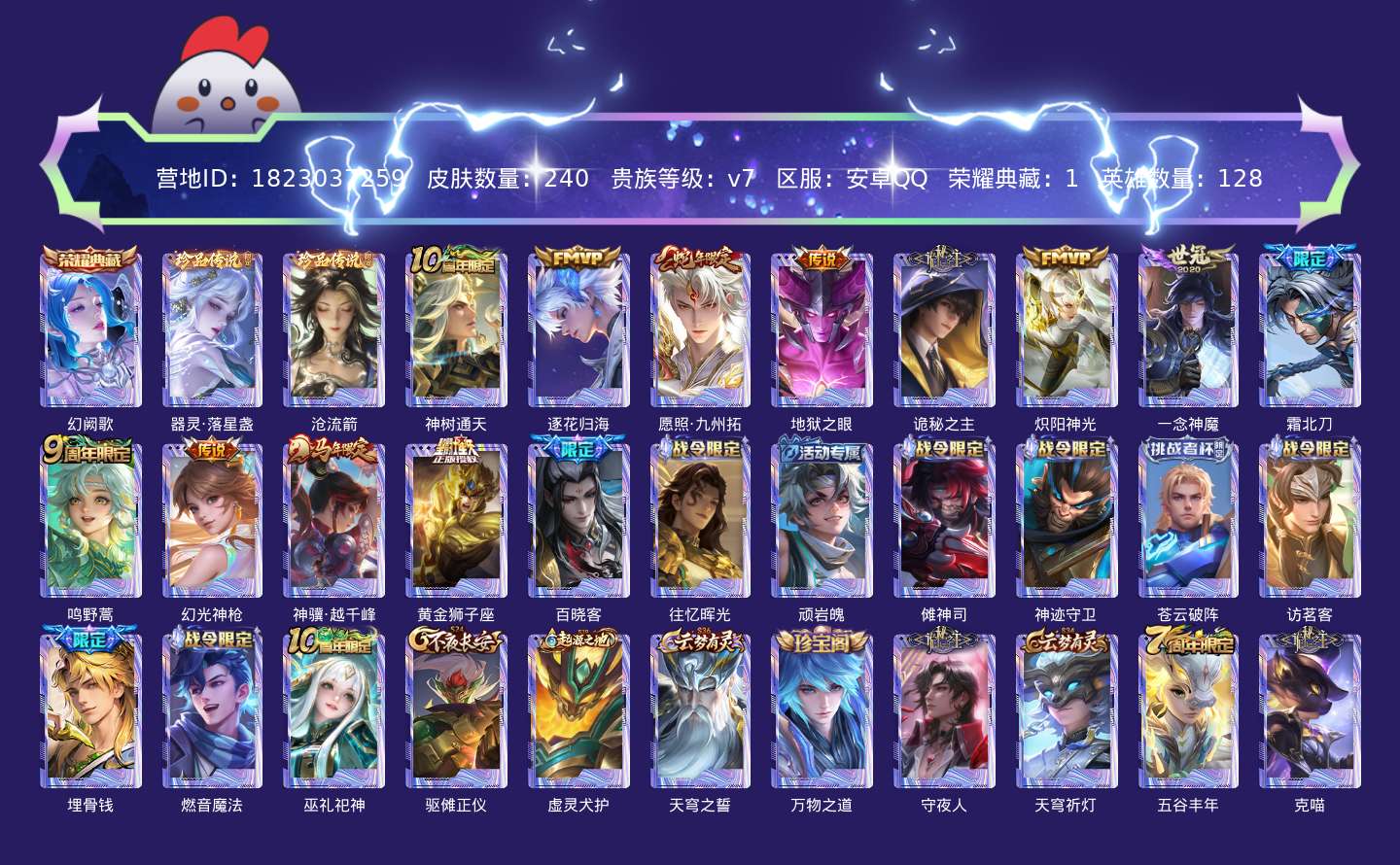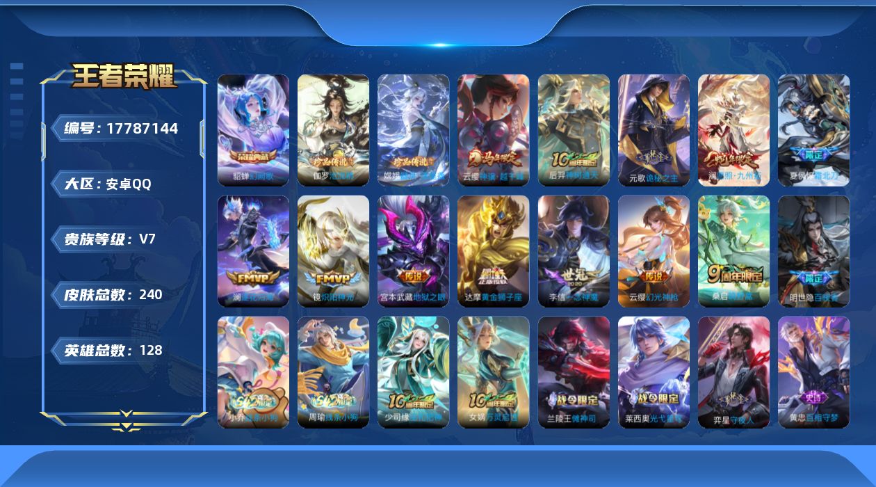 贵族等级:v7皮肤数:240传说品质12 生肖限定2 荣耀典藏1 珍品传说2 英雄数:128