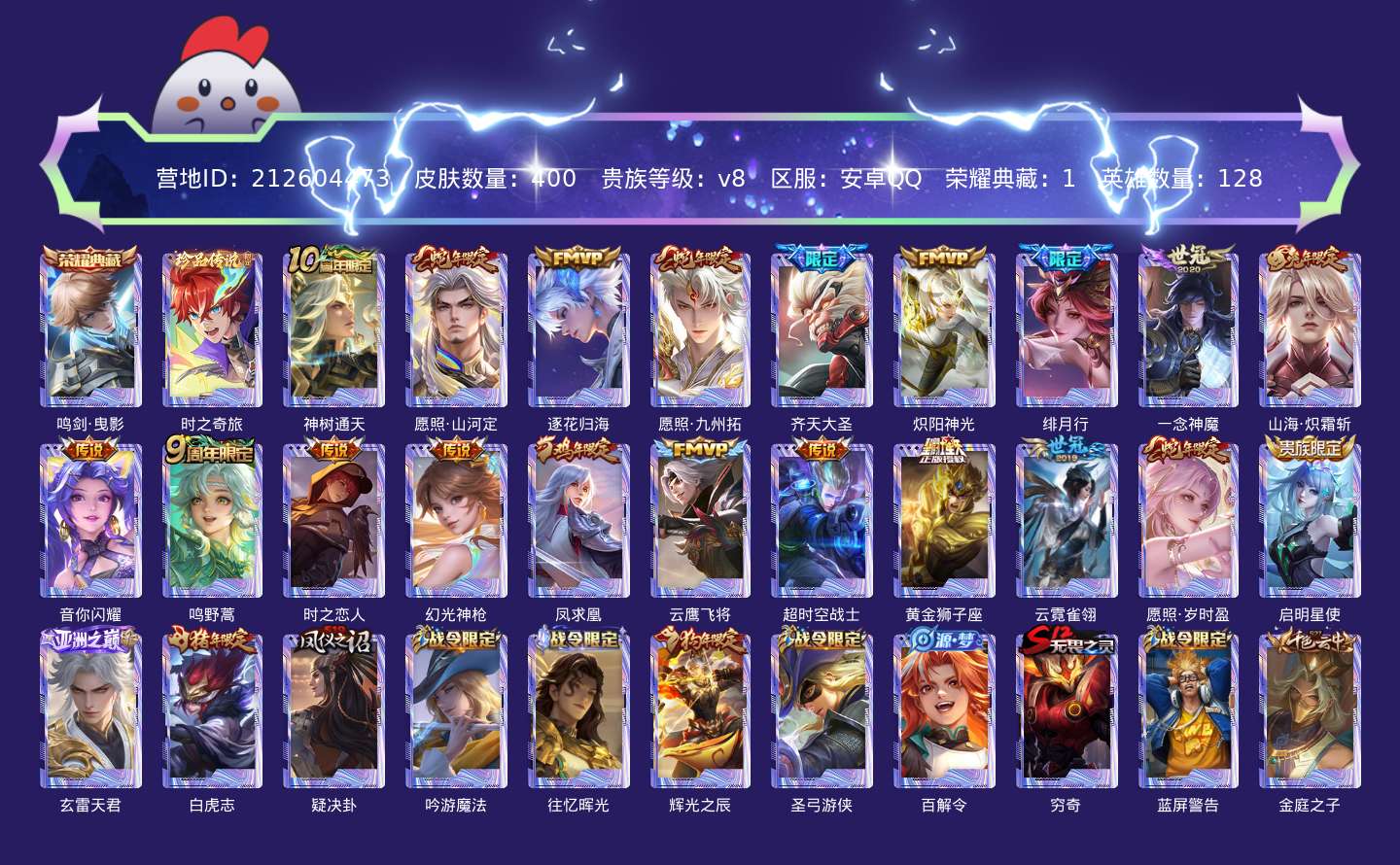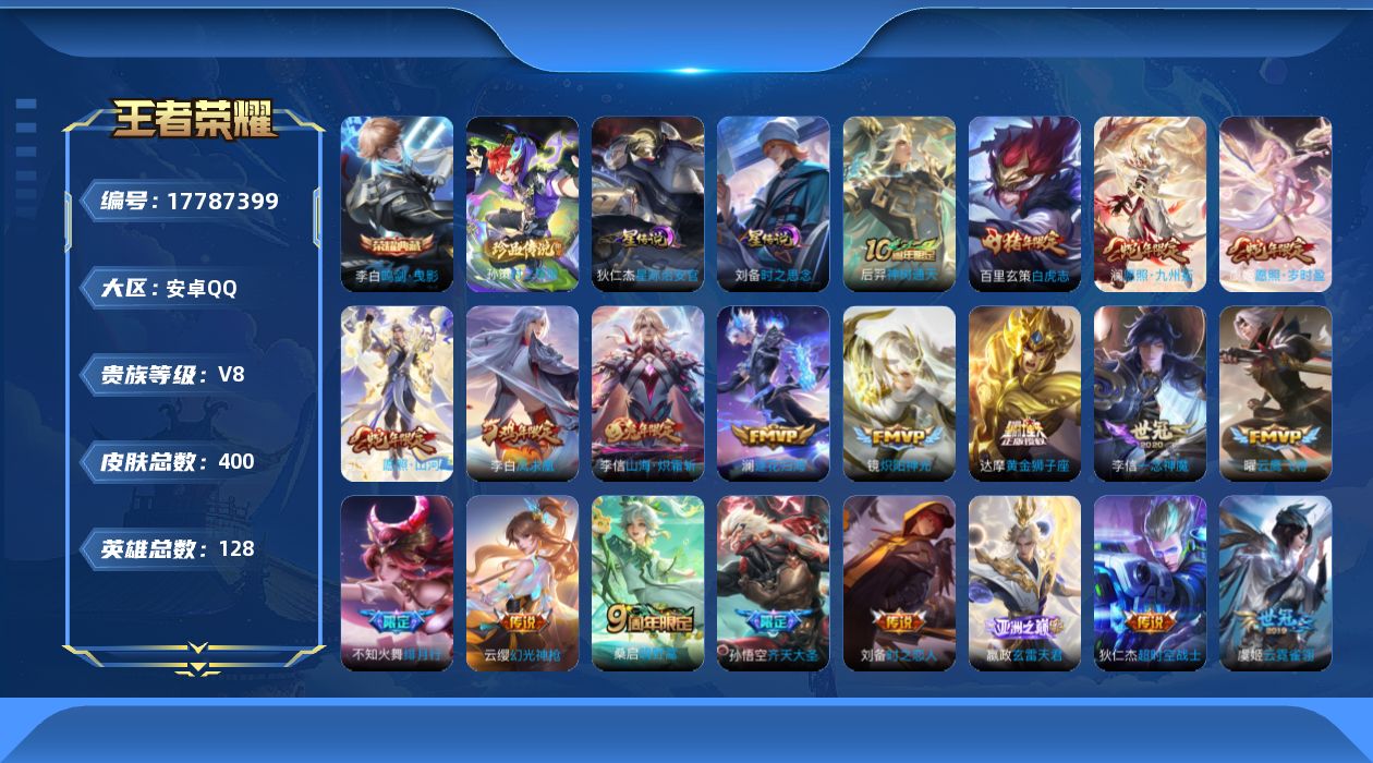 贵族等级:v8皮肤数:400生肖限定11 传说品质22 情人节限定1 荣耀典藏1 珍品传说1 英雄数:128