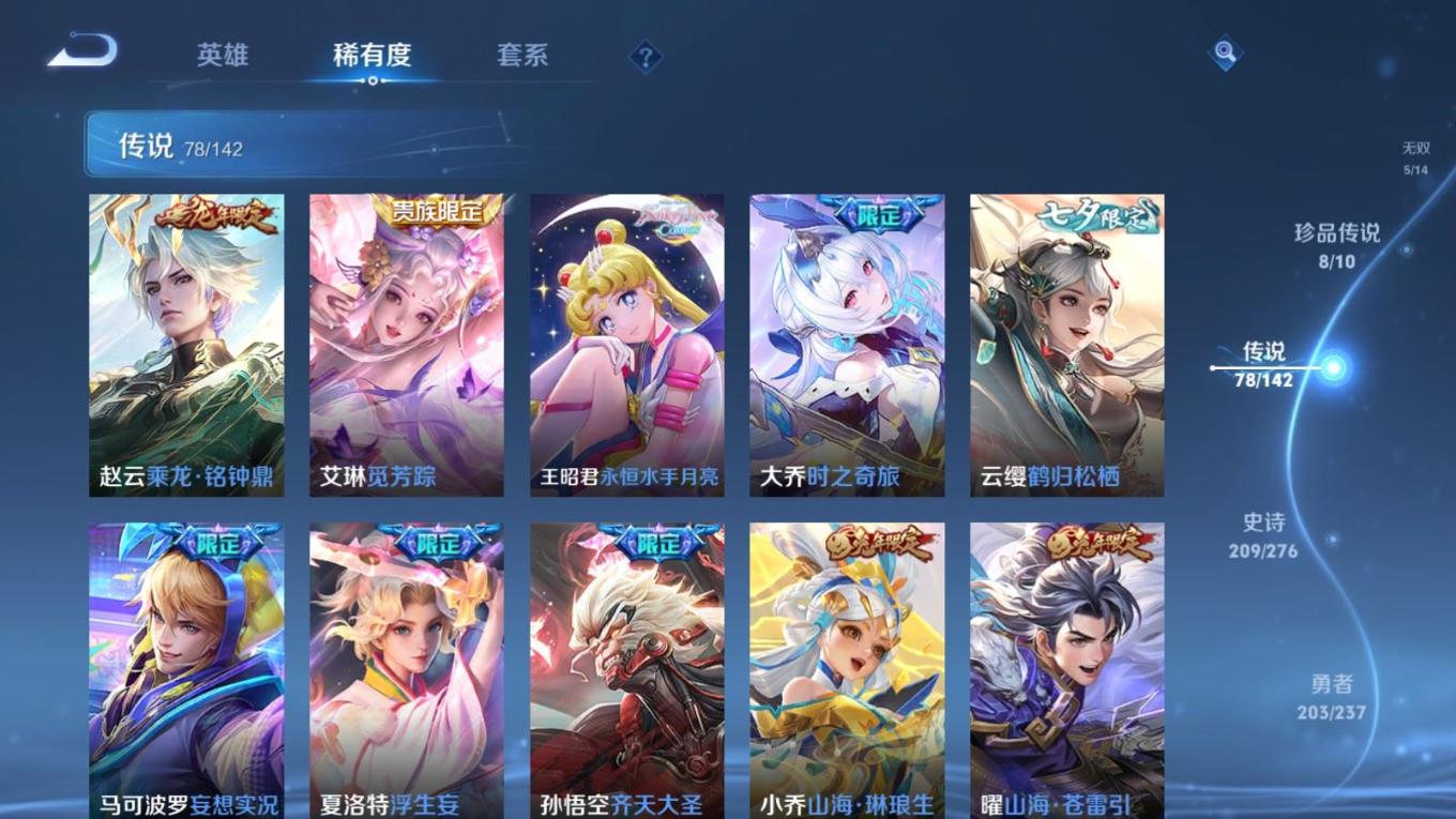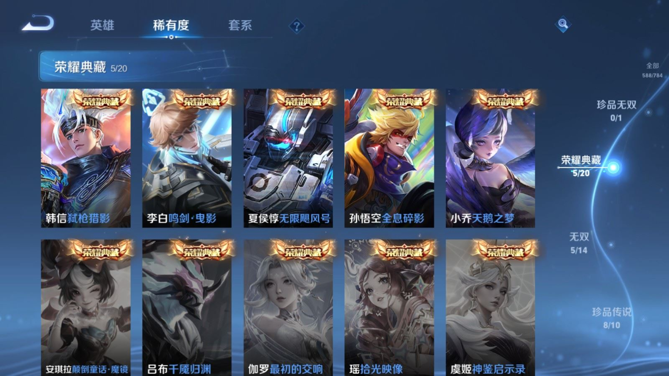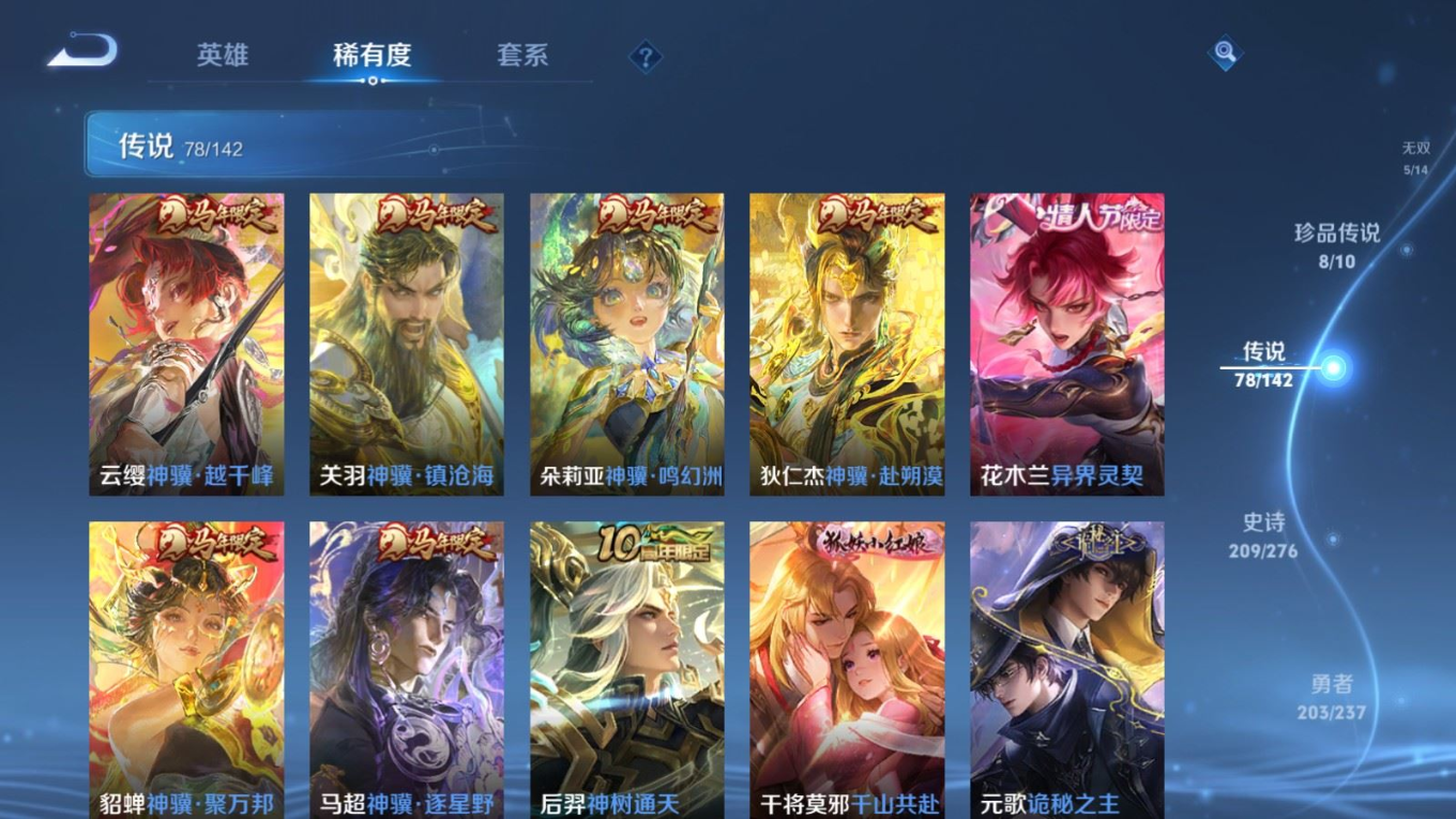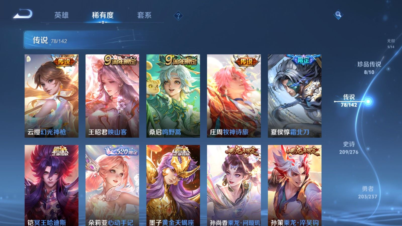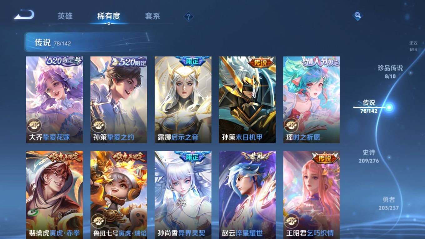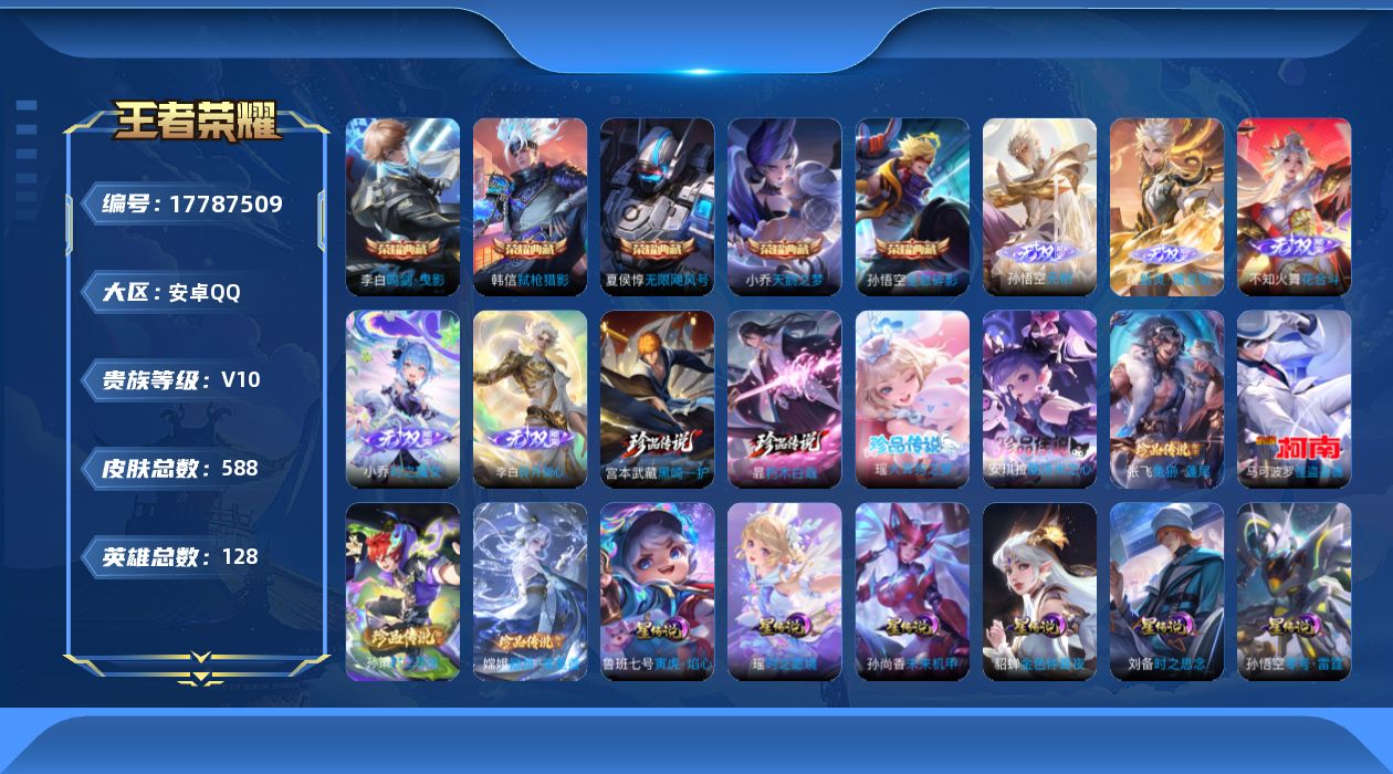 贵族等级:v10皮肤数:588传说品质78 情人节限定11 生肖限定35 荣耀典藏5 无双5 珍品传说8 英雄数:128