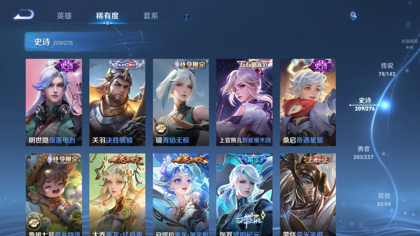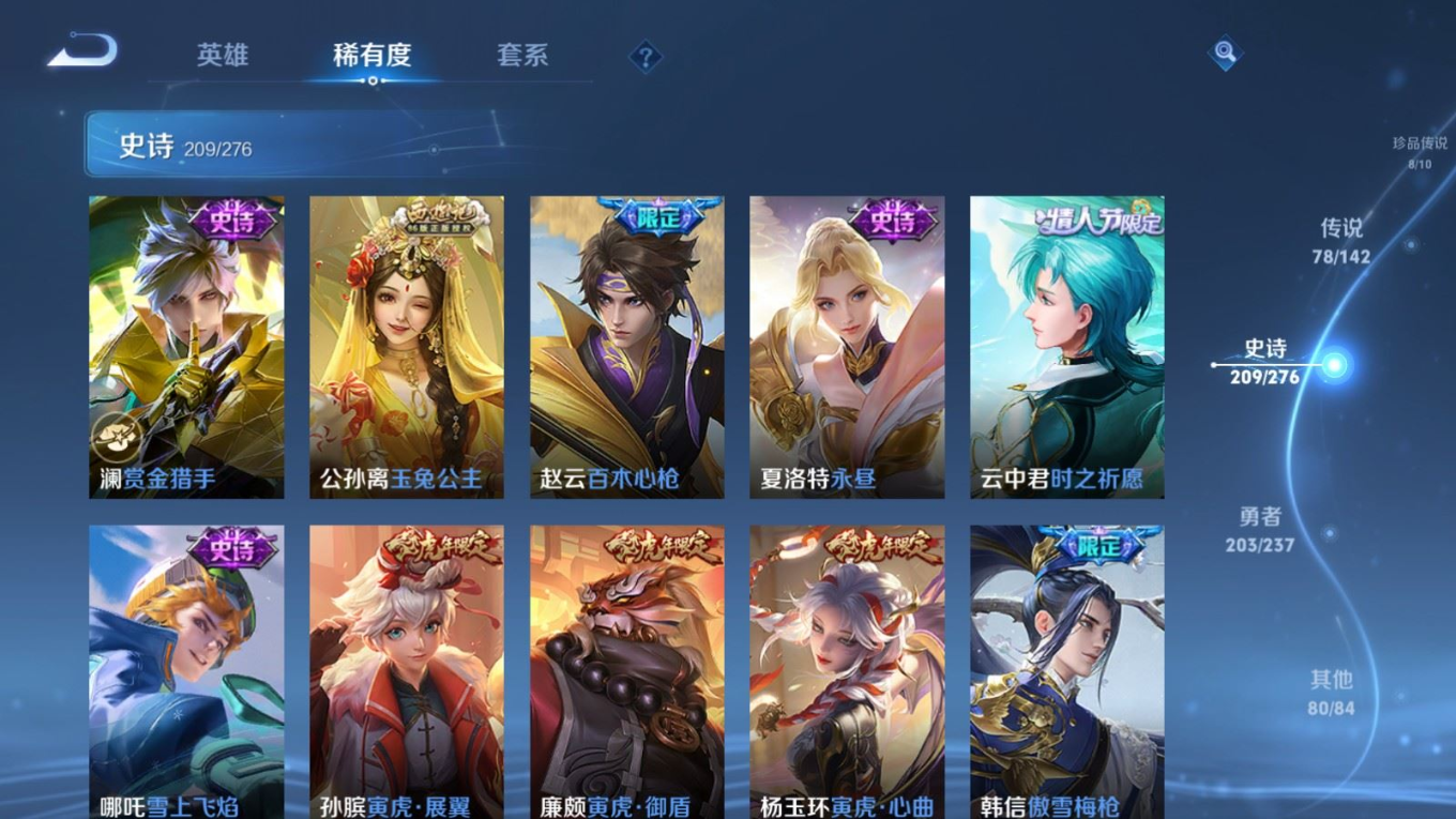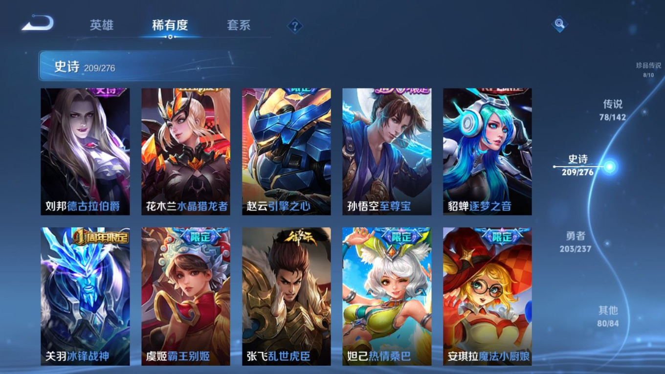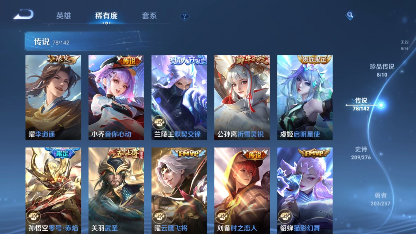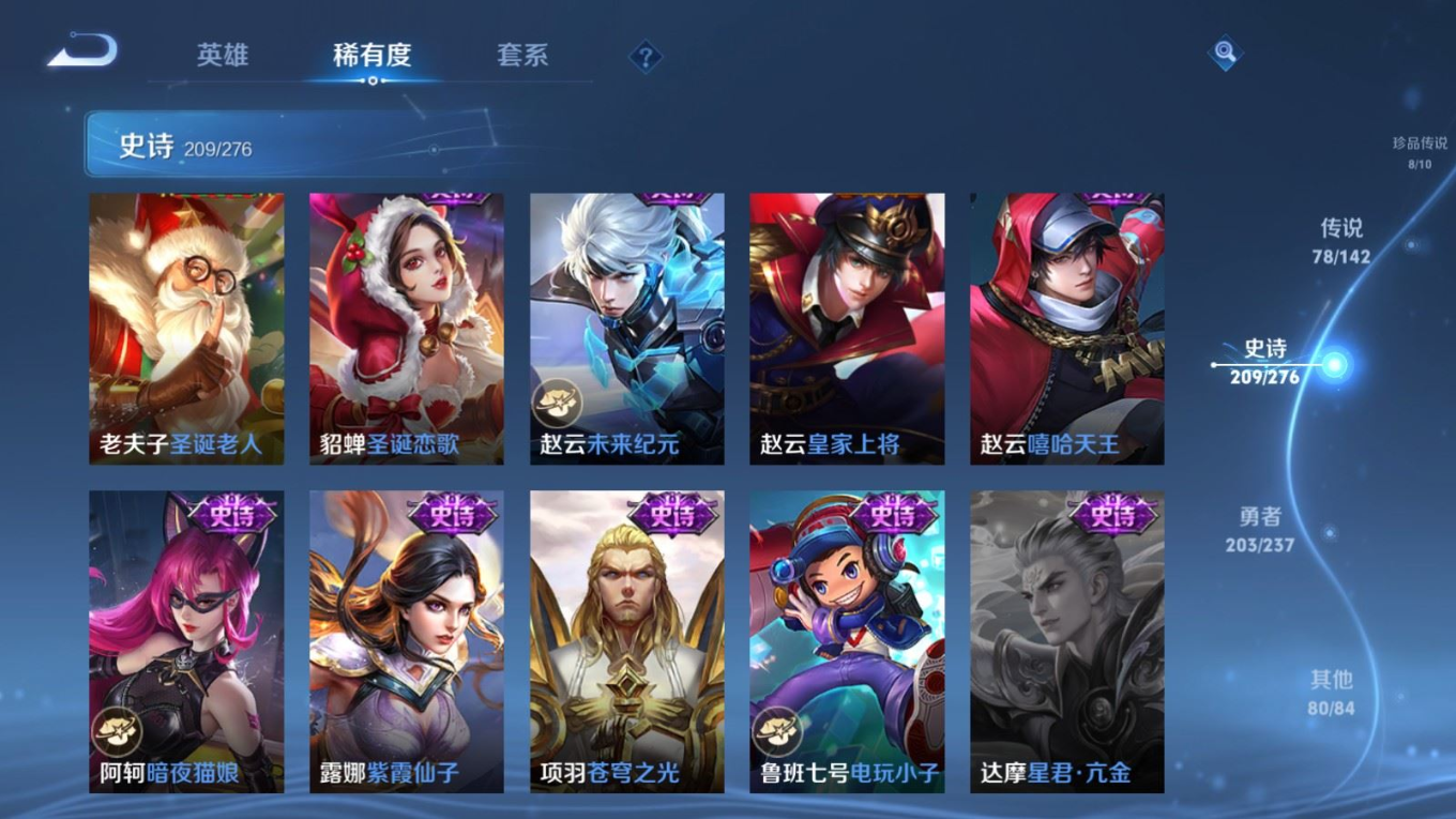 贵族等级:v10皮肤数:588传说品质78 情人节限定11 生肖限定35 荣耀典藏5 无双5 珍品传说8 英雄数:128