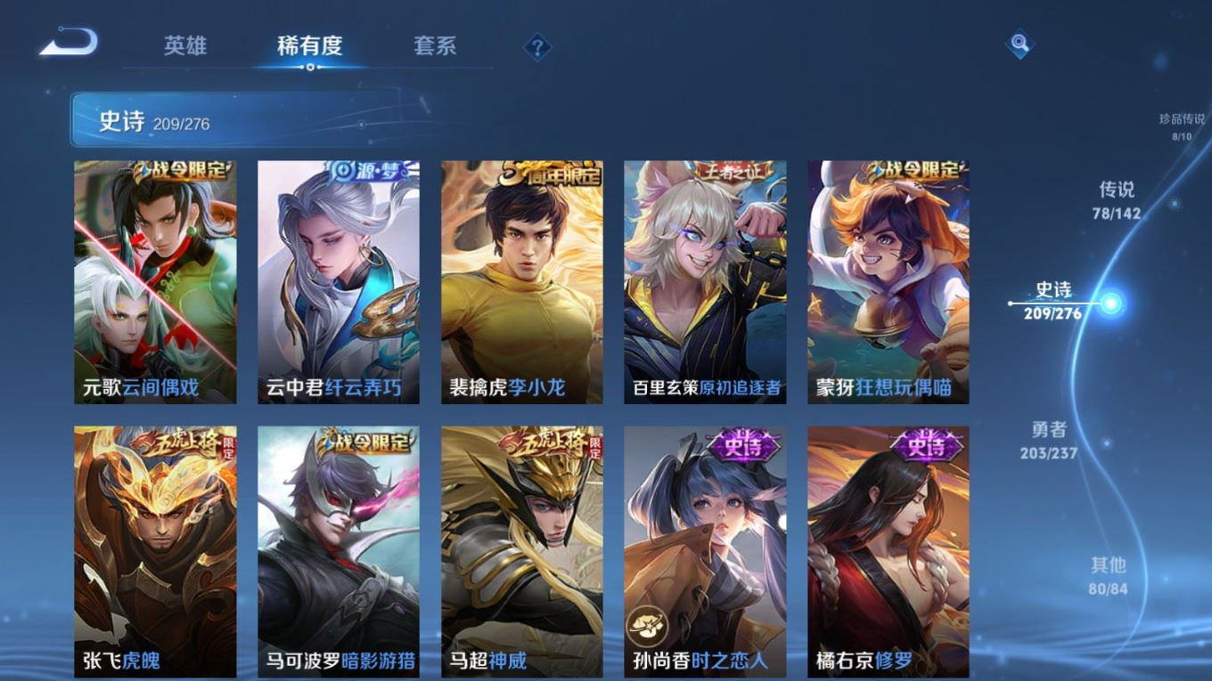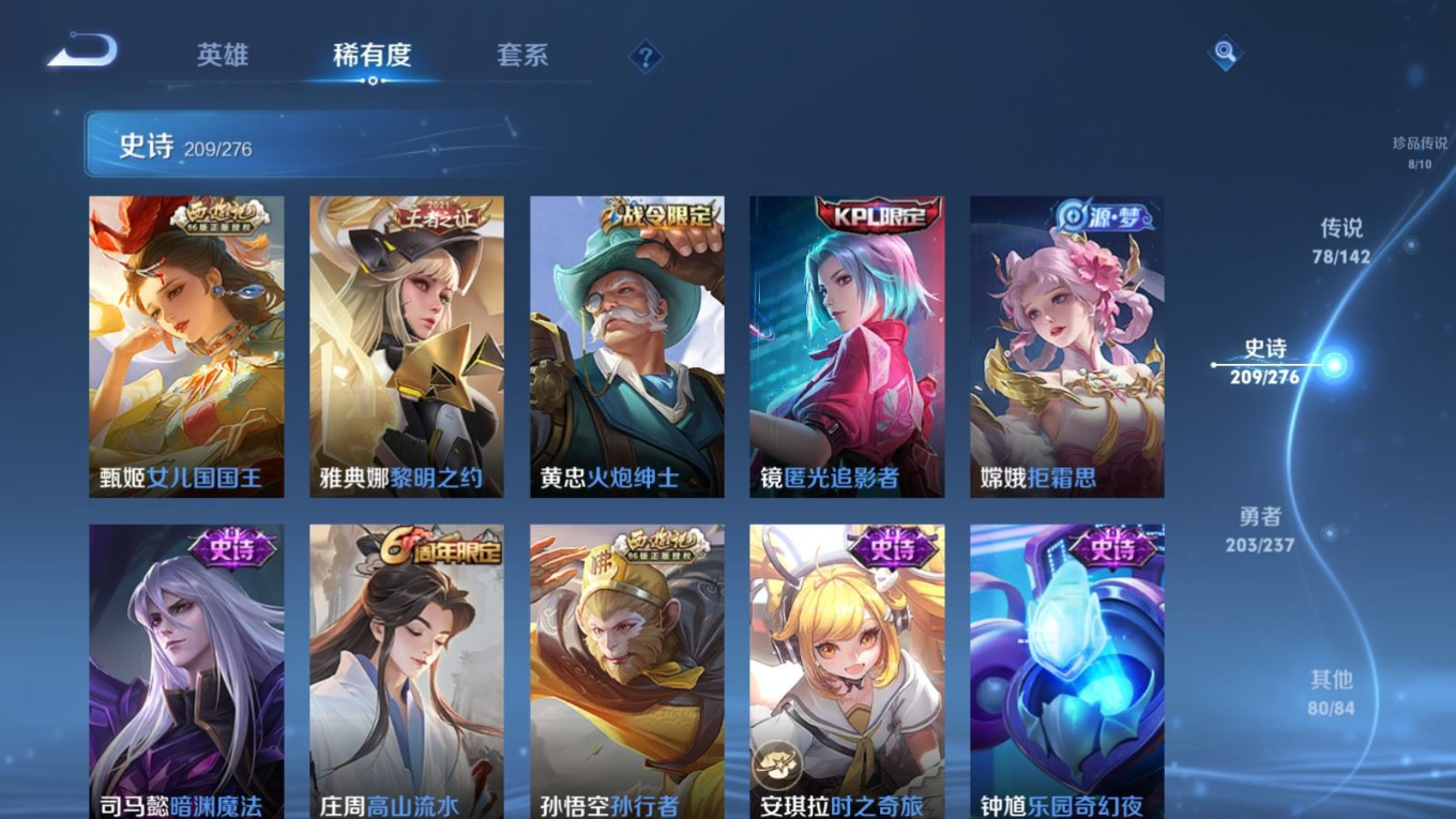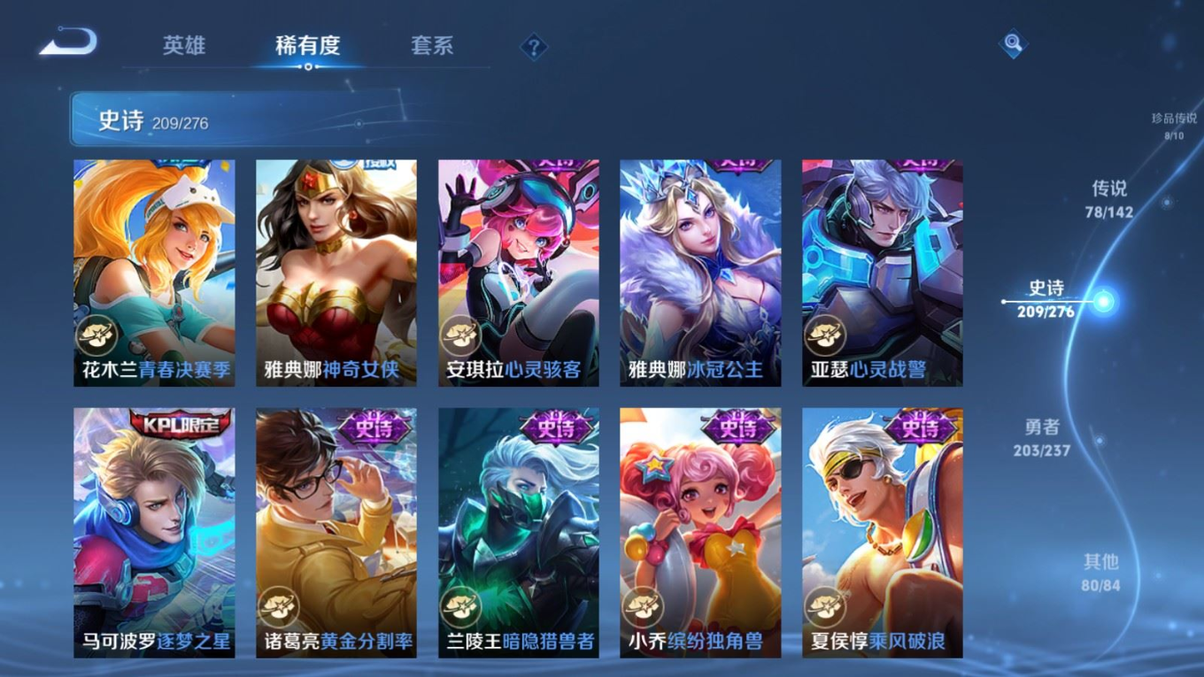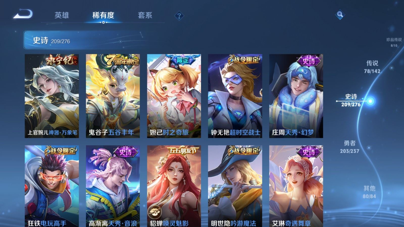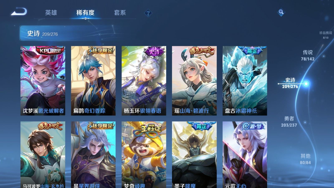贵族等级:v10皮肤数:588传说品质78 情人节限定11 生肖限定35 荣耀典藏5 无双5 珍品传说8 英雄数:128