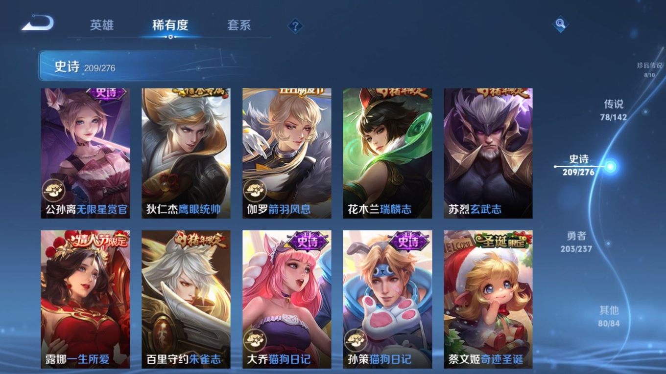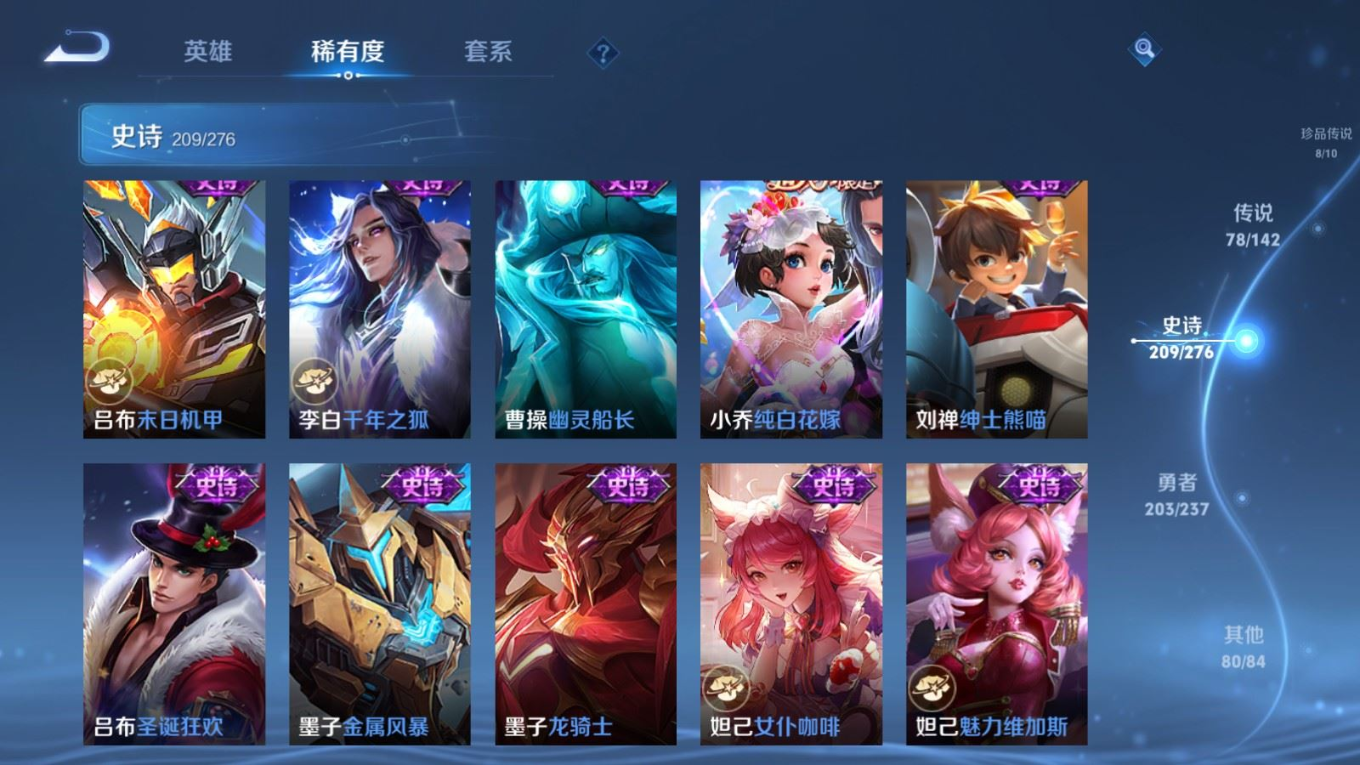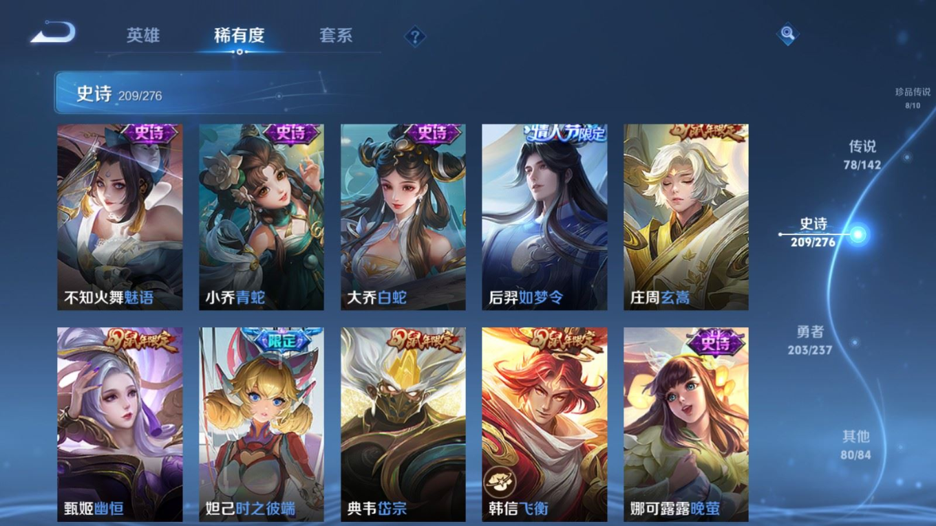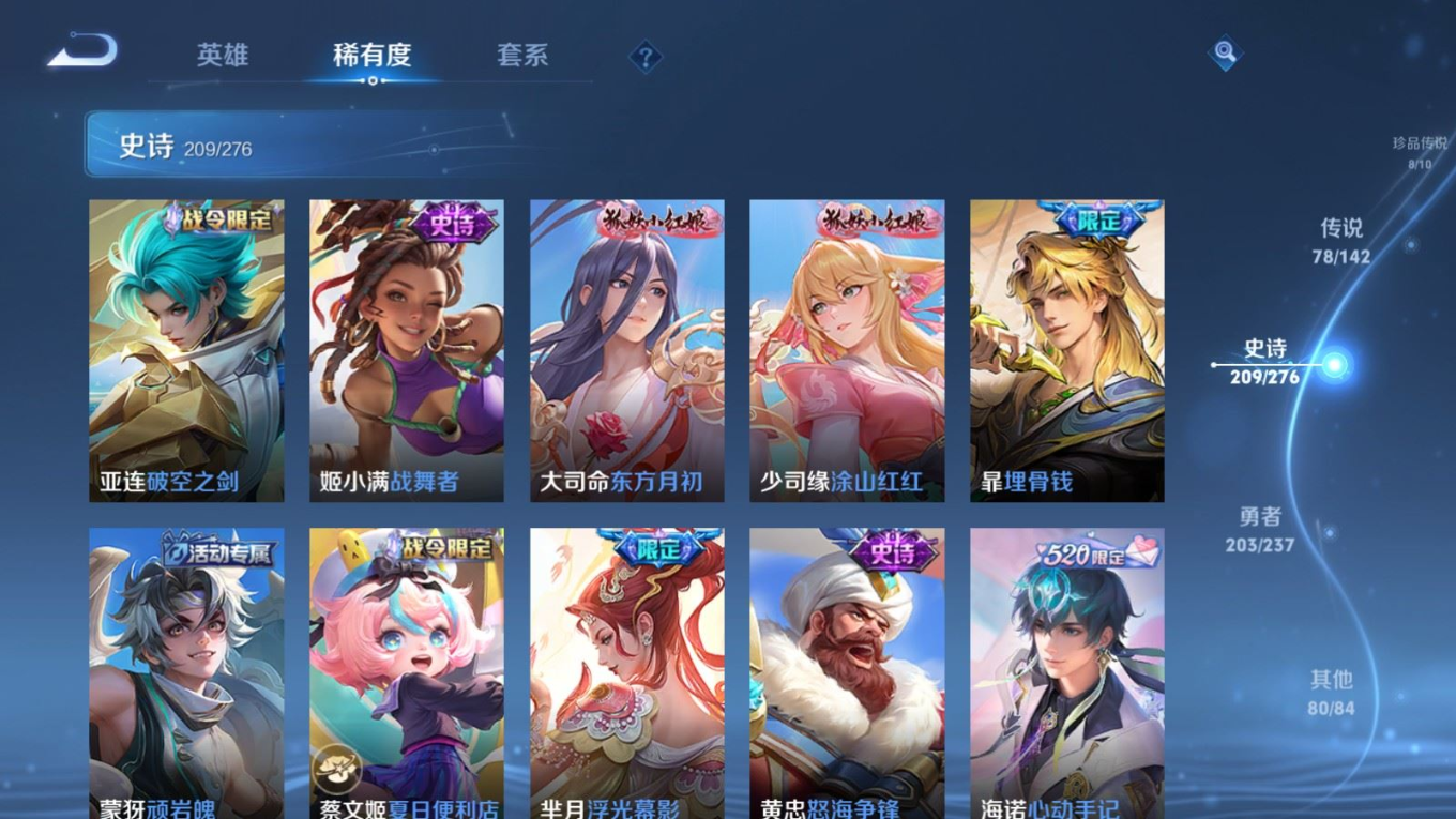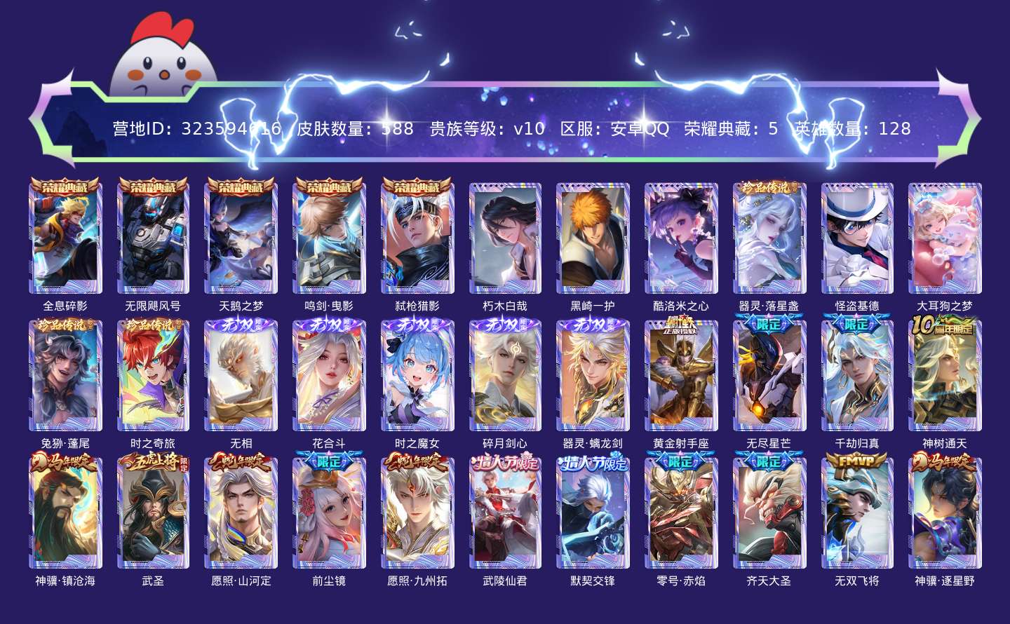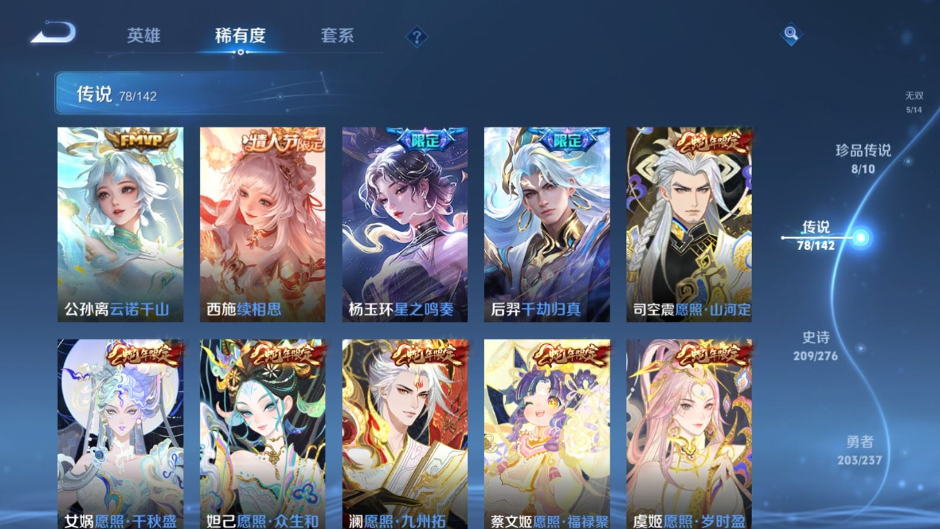 贵族等级:v10皮肤数:588传说品质78 情人节限定11 生肖限定35 荣耀典藏5 无双5 珍品传说8 英雄数:128