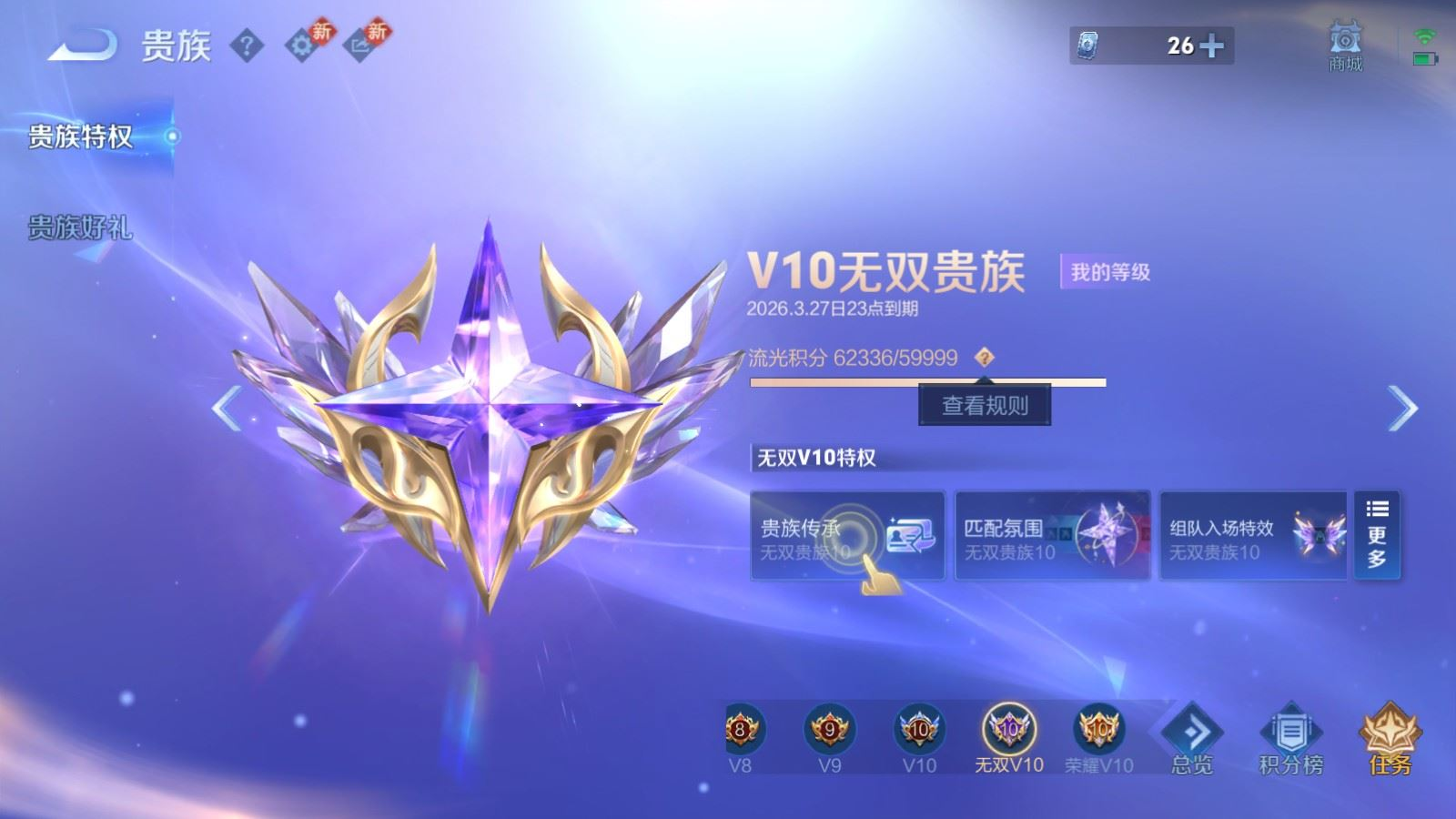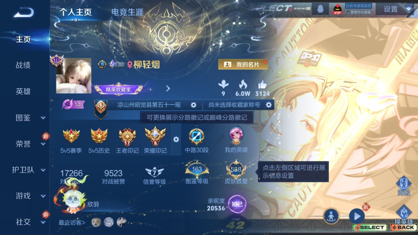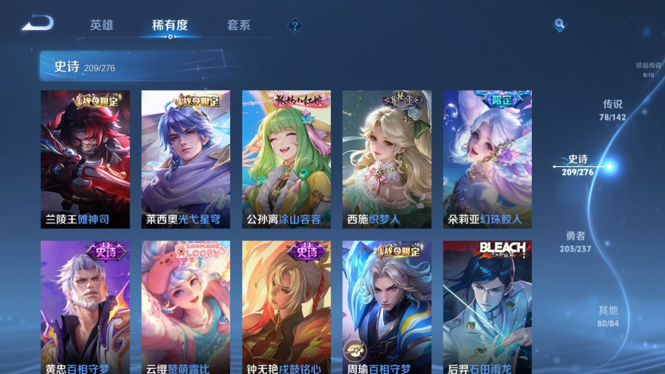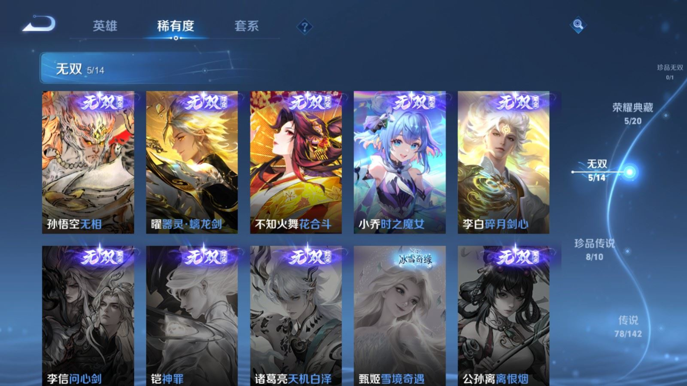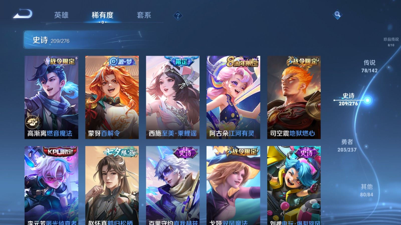 贵族等级:v10皮肤数:588传说品质78 情人节限定11 生肖限定35 荣耀典藏5 无双5 珍品传说8 英雄数:128