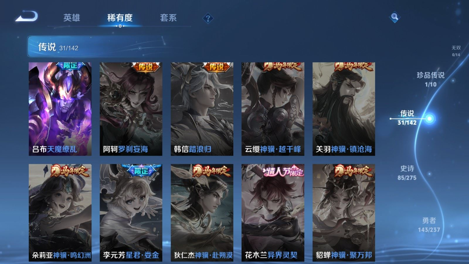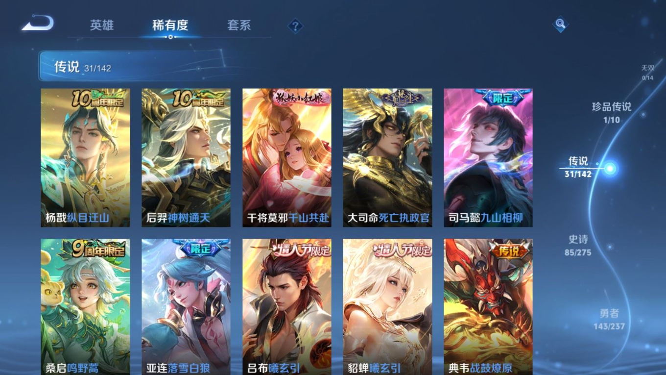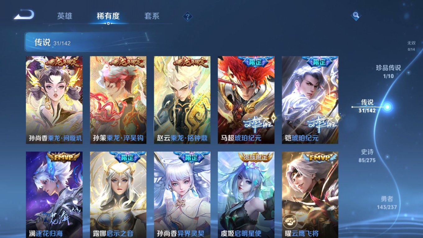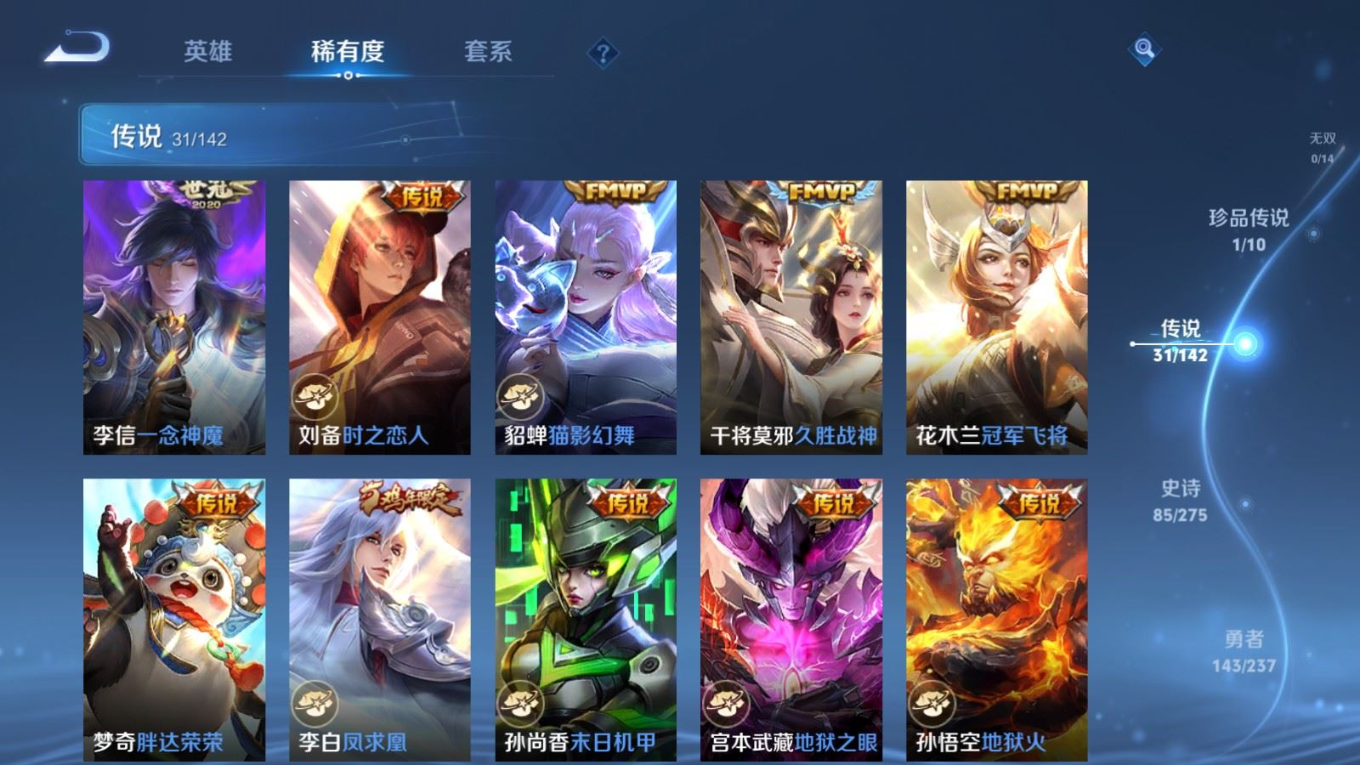 传说品质_后羿_神树通天传说品质_澜_逐花归海传说品质_典韦_战鼓燎原传说品质_孙悟空_地狱火传说品质_吕布_曦玄引传说品质_吕布_天魔缭乱传说品质_马超_琥珀纪元传说品质_杨戬_纵目迁山传说品质_干将莫邪_千山共赴传说品质_干将莫邪_久胜战神传说品质_宫本武藏_地狱之眼传说品质_花木兰_冠军飞将传说品质_貂蝉_猫影幻舞传说品质_貂蝉_曦玄引传说品质_李信_一念神魔传说品质_孙尚香_末日机甲传说品质_孙尚香_乘龙·问璇玑传说品质_孙尚香_异界灵契传说品质_梦奇_胖达荣荣传说品质_司马懿_九山相柳传说品质_桑启_鸣野蒿传说品质_露娜_启示之音传说品质_刘备_时之恋人传说品质_李白_凤求凰传说品质_大司命_死亡执政官传说品质_亚连_落雪白狼传说品质_曜_云鹰飞将传说品质_孙策_乘龙·淬吴钩传说品质_铠_琥珀纪元传说品质_虞姬_启明星使传说品质_赵云_乘龙·铭钟鼎