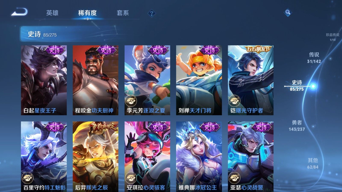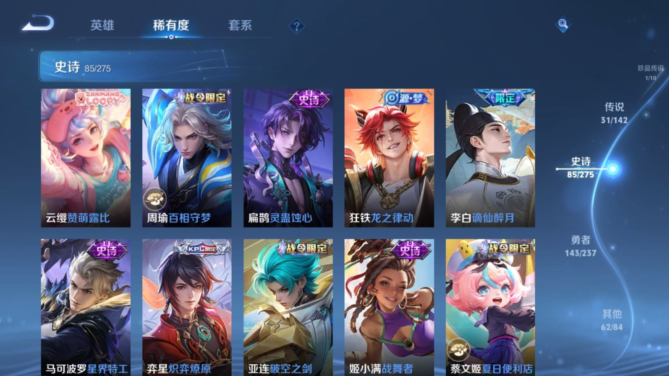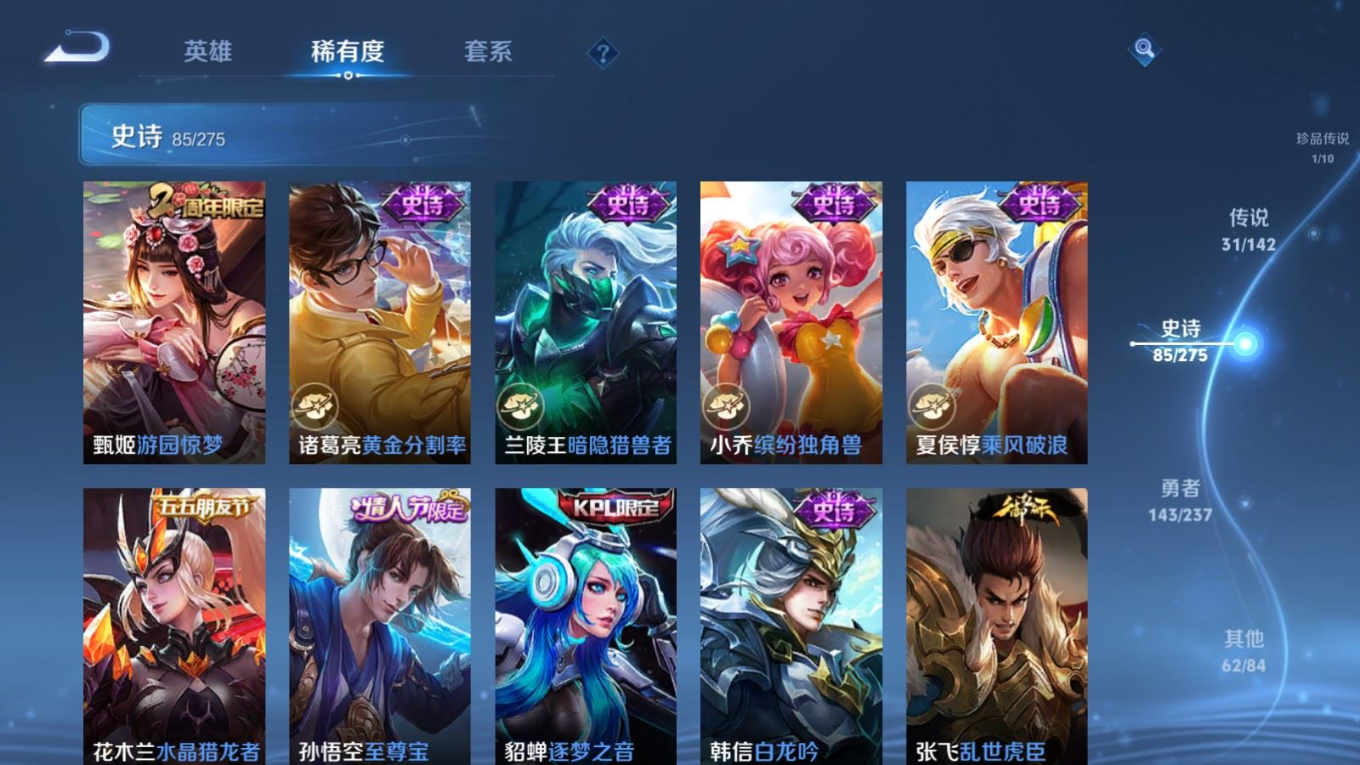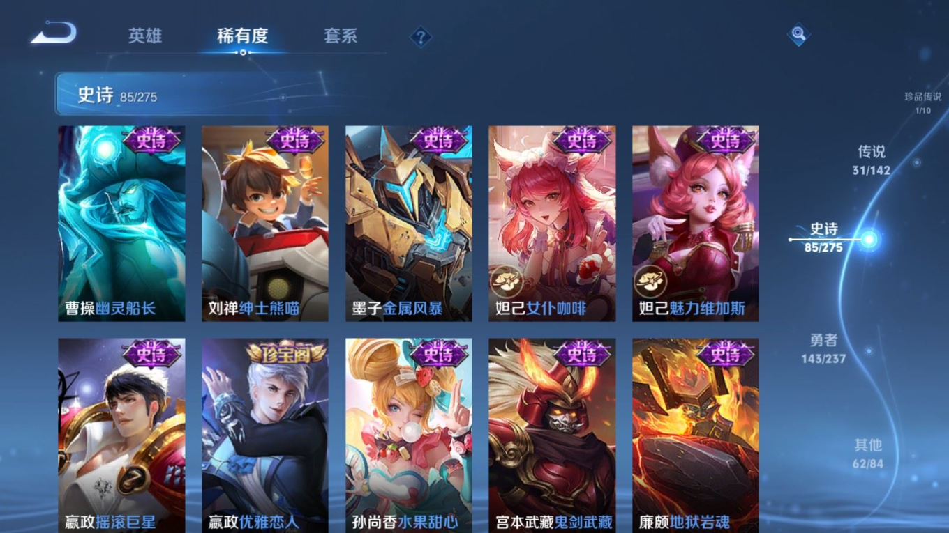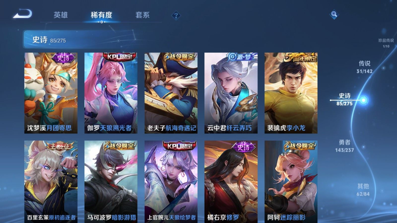 传说品质_后羿_神树通天传说品质_澜_逐花归海传说品质_典韦_战鼓燎原传说品质_孙悟空_地狱火传说品质_吕布_曦玄引传说品质_吕布_天魔缭乱传说品质_马超_琥珀纪元传说品质_杨戬_纵目迁山传说品质_干将莫邪_千山共赴传说品质_干将莫邪_久胜战神传说品质_宫本武藏_地狱之眼传说品质_花木兰_冠军飞将传说品质_貂蝉_猫影幻舞传说品质_貂蝉_曦玄引传说品质_李信_一念神魔传说品质_孙尚香_末日机甲传说品质_孙尚香_乘龙·问璇玑传说品质_孙尚香_异界灵契传说品质_梦奇_胖达荣荣传说品质_司马懿_九山相柳传说品质_桑启_鸣野蒿传说品质_露娜_启示之音传说品质_刘备_时之恋人传说品质_李白_凤求凰传说品质_大司命_死亡执政官传说品质_亚连_落雪白狼传说品质_曜_云鹰飞将传说品质_孙策_乘龙·淬吴钩传说品质_铠_琥珀纪元传说品质_虞姬_启明星使传说品质_赵云_乘龙·铭钟鼎