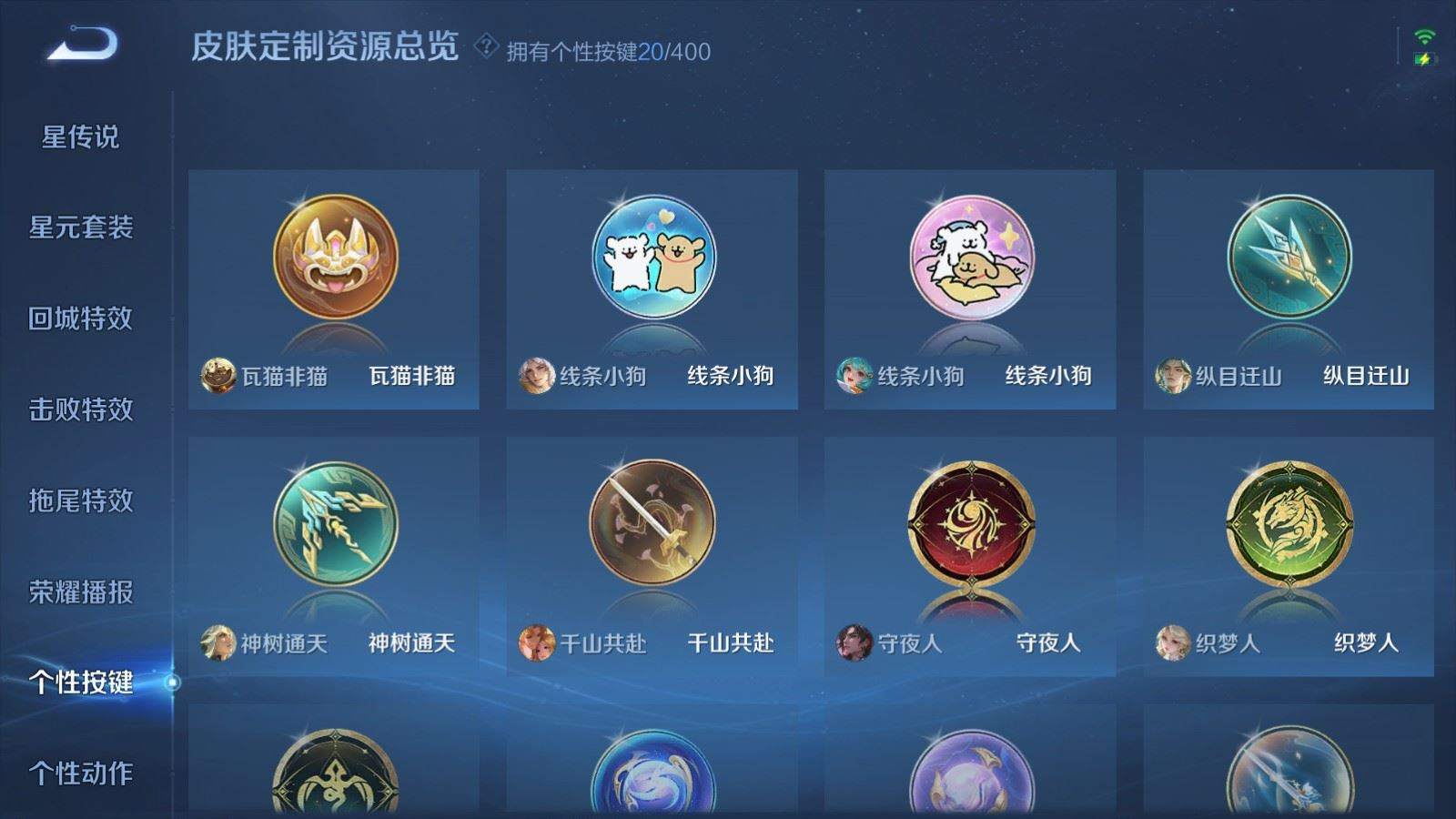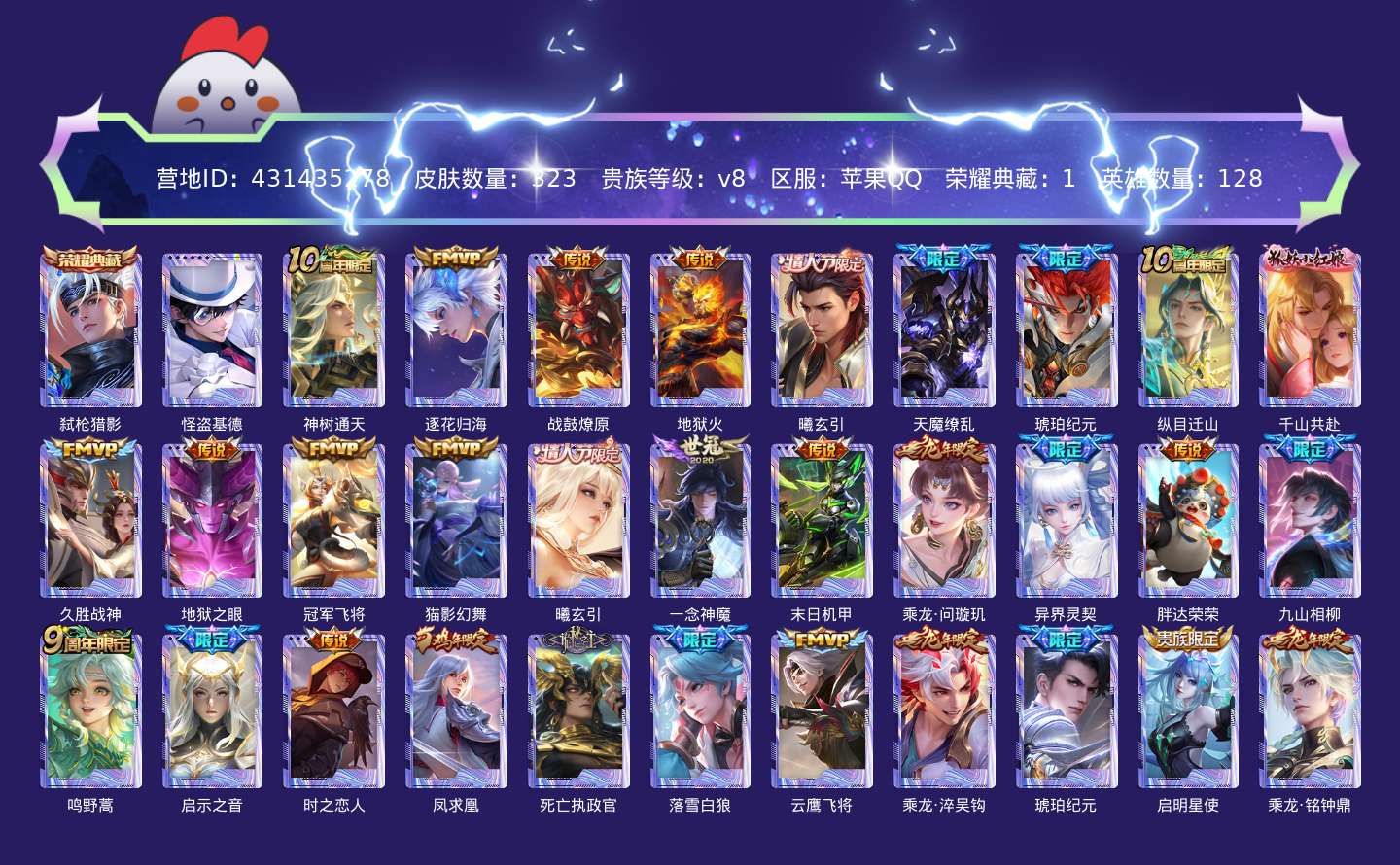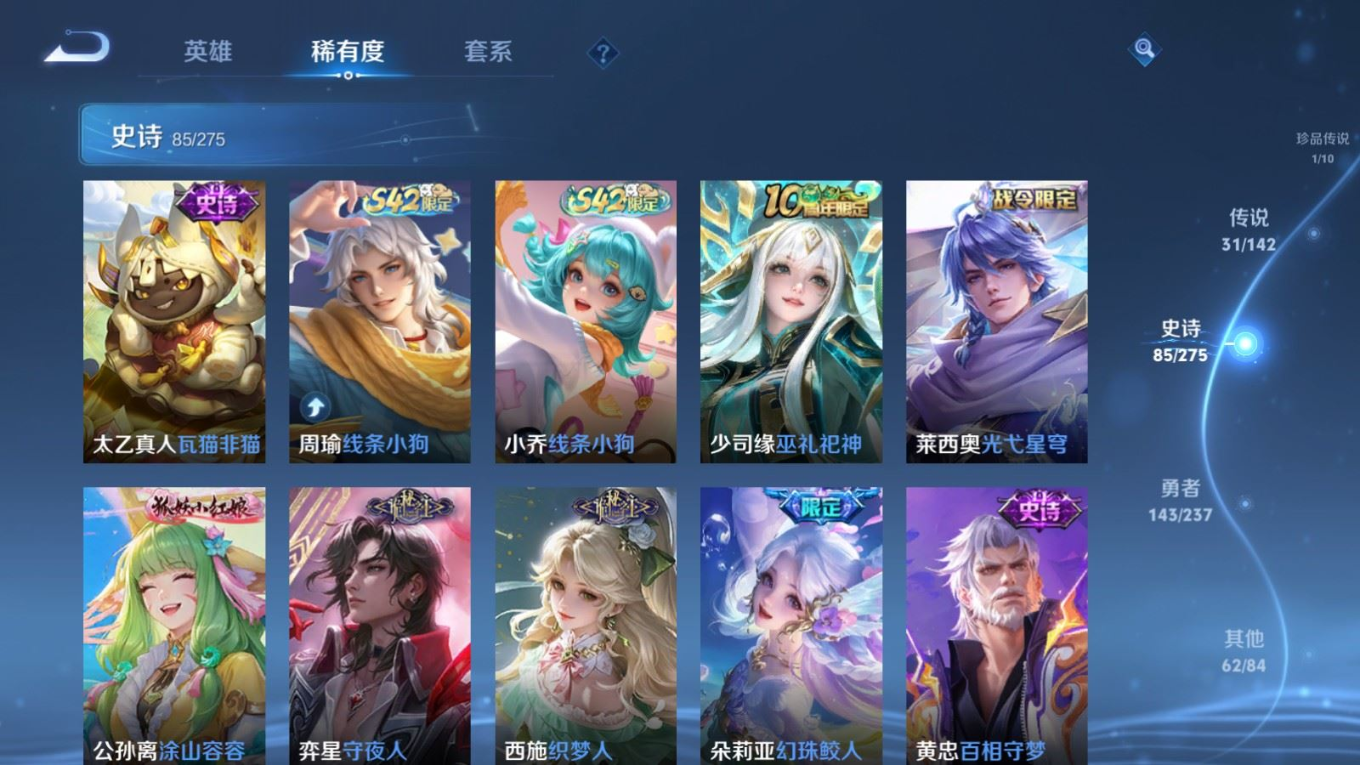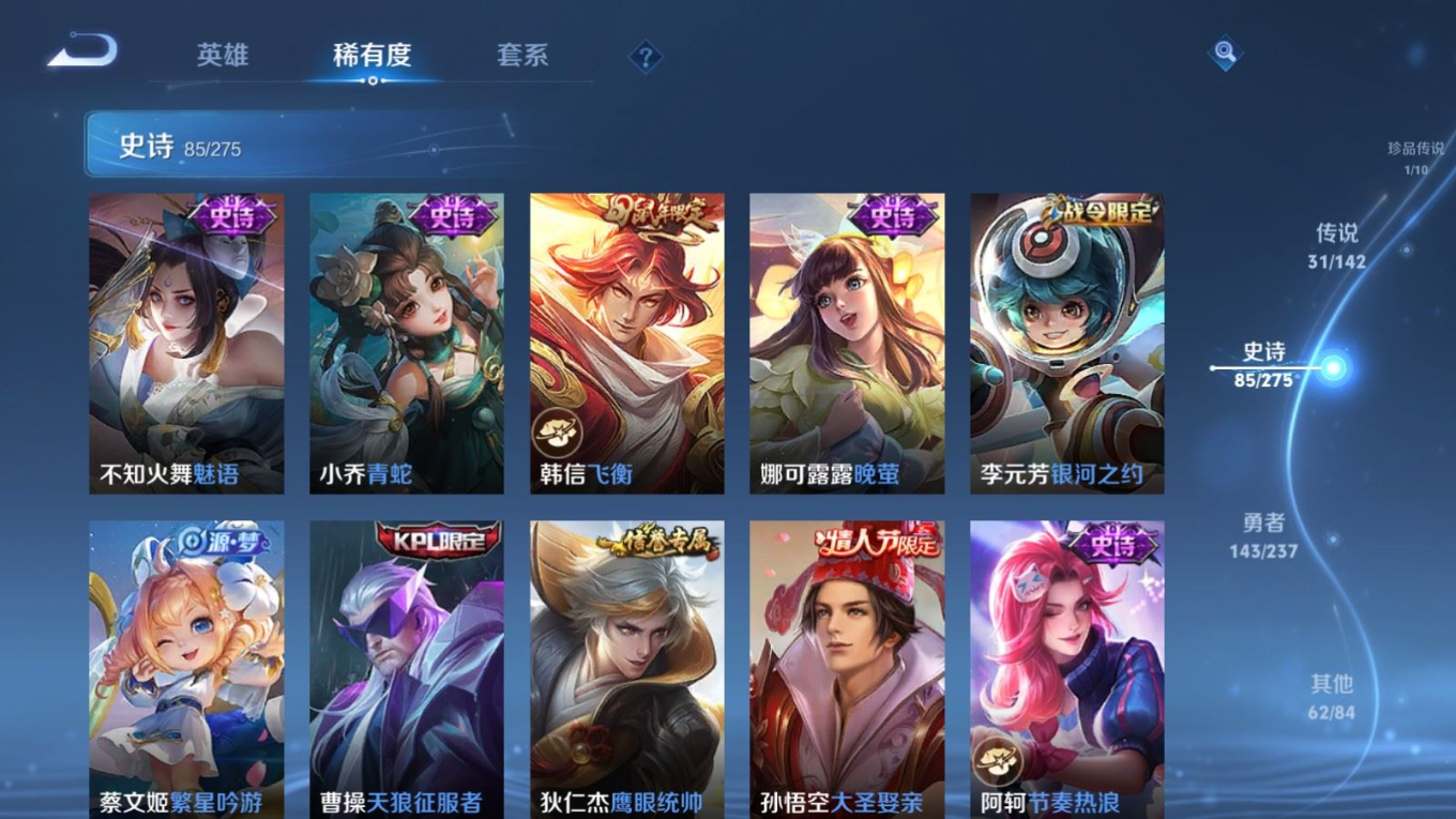 传说品质_后羿_神树通天传说品质_澜_逐花归海传说品质_典韦_战鼓燎原传说品质_孙悟空_地狱火传说品质_吕布_曦玄引传说品质_吕布_天魔缭乱传说品质_马超_琥珀纪元传说品质_杨戬_纵目迁山传说品质_干将莫邪_千山共赴传说品质_干将莫邪_久胜战神传说品质_宫本武藏_地狱之眼传说品质_花木兰_冠军飞将传说品质_貂蝉_猫影幻舞传说品质_貂蝉_曦玄引传说品质_李信_一念神魔传说品质_孙尚香_末日机甲传说品质_孙尚香_乘龙·问璇玑传说品质_孙尚香_异界灵契传说品质_梦奇_胖达荣荣传说品质_司马懿_九山相柳传说品质_桑启_鸣野蒿传说品质_露娜_启示之音传说品质_刘备_时之恋人传说品质_李白_凤求凰传说品质_大司命_死亡执政官传说品质_亚连_落雪白狼传说品质_曜_云鹰飞将传说品质_孙策_乘龙·淬吴钩传说品质_铠_琥珀纪元传说品质_虞姬_启明星使传说品质_赵云_乘龙·铭钟鼎