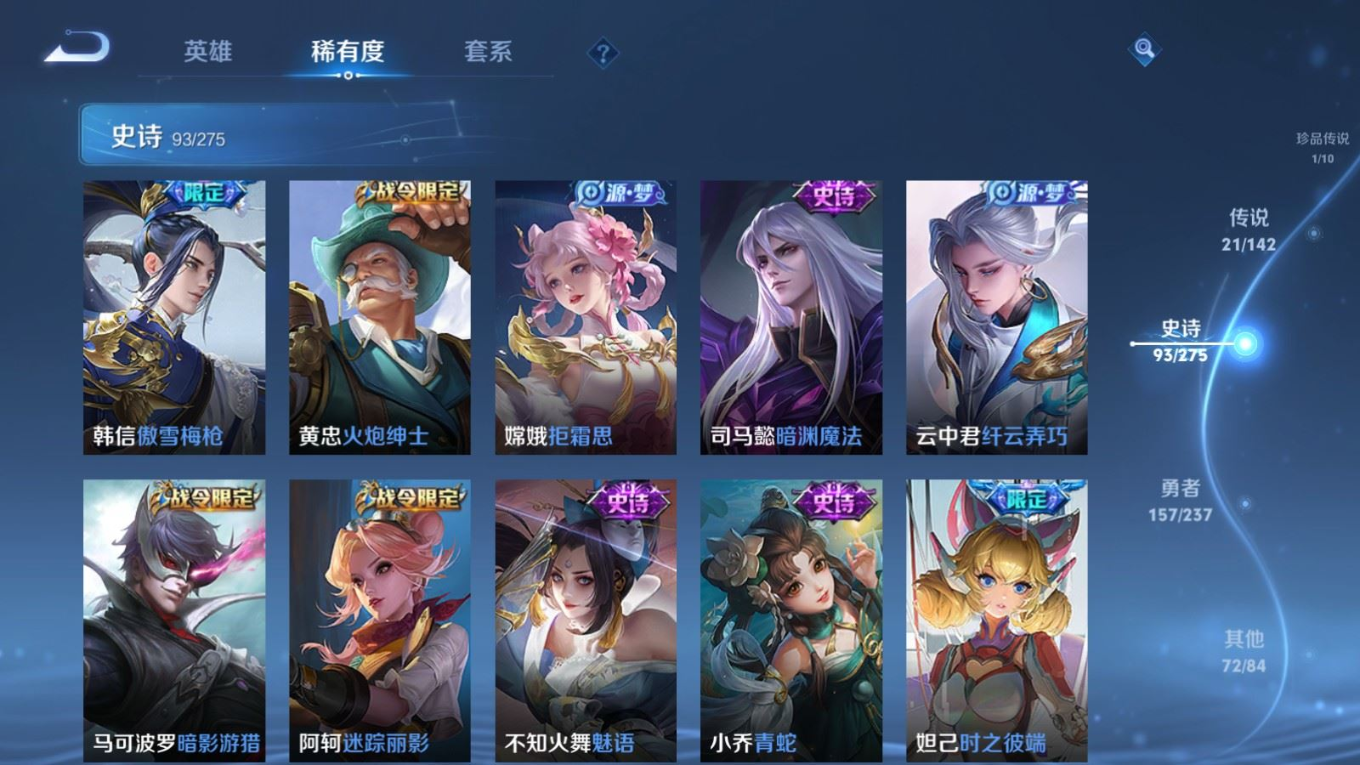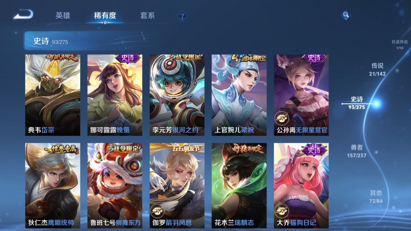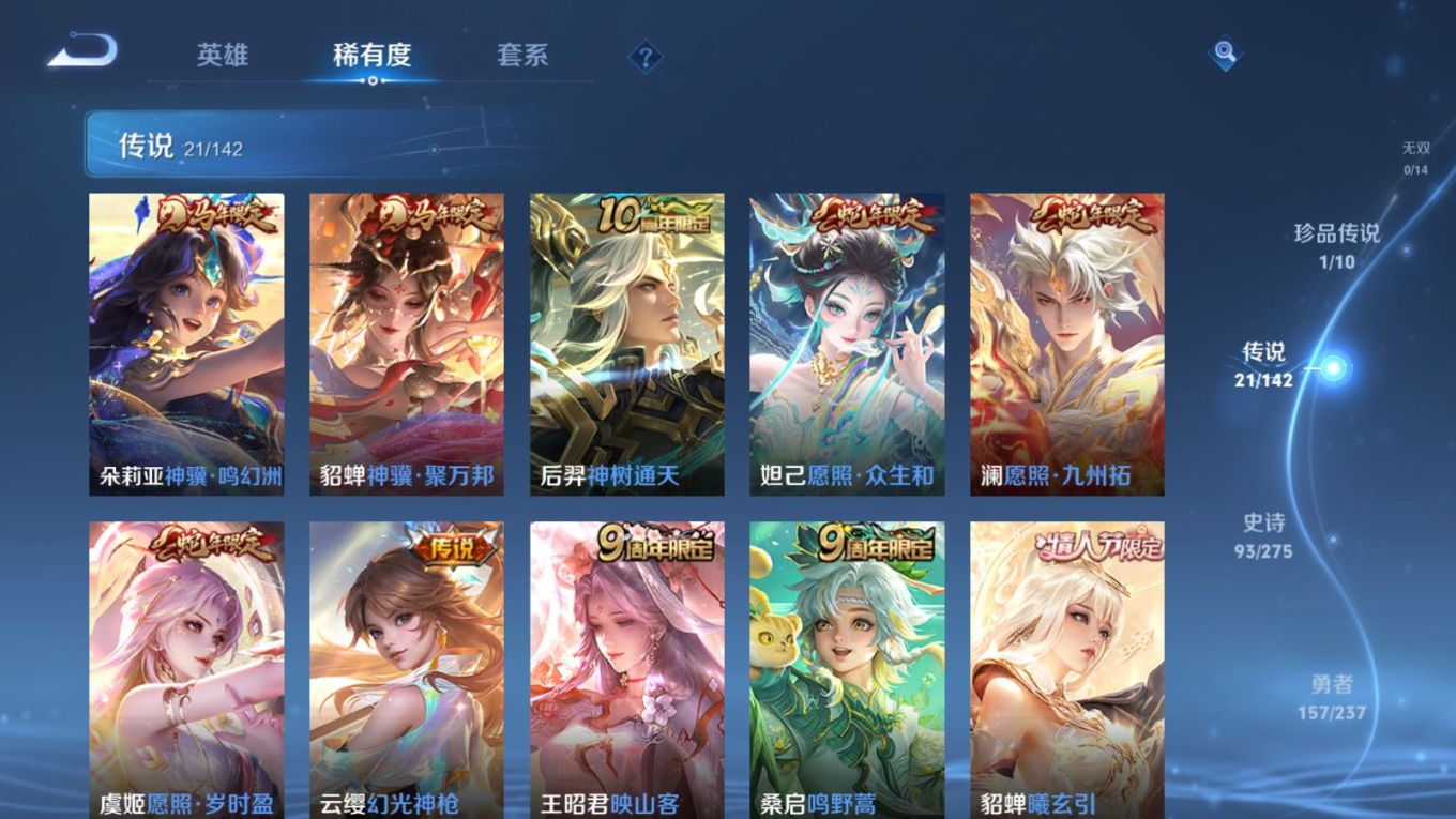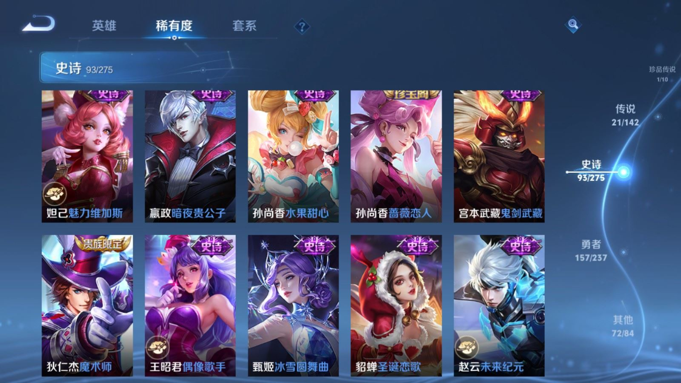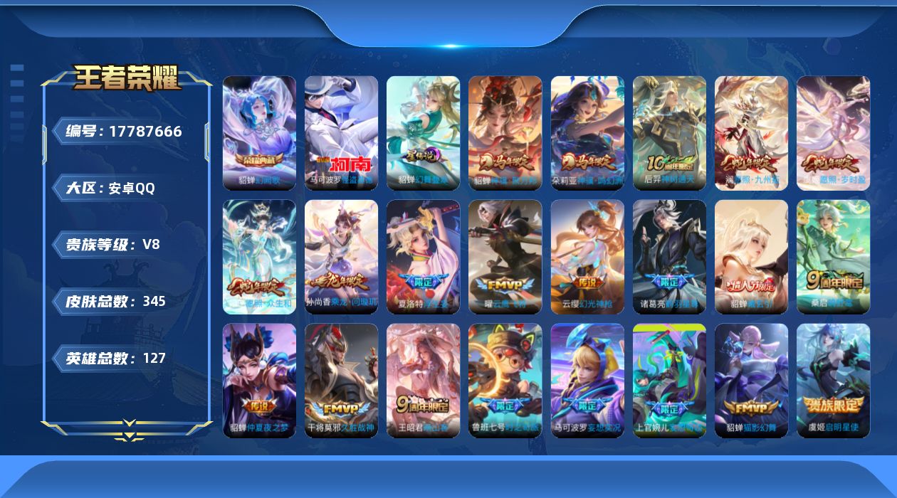 贵族等级:v8皮肤数:345传说品质21 生肖限定9 情人节限定1 荣耀典藏1 珍品传说1 英雄数:127