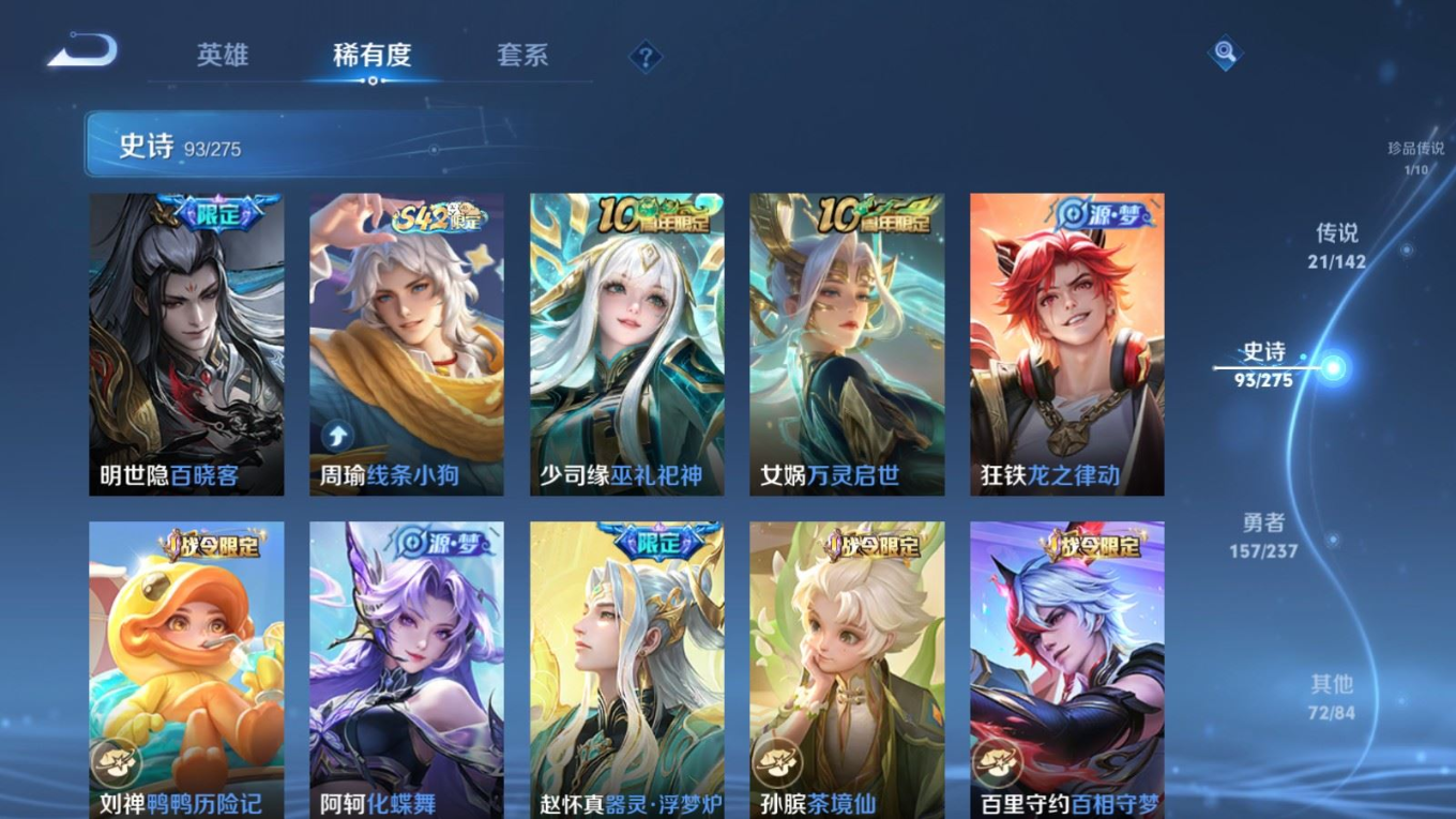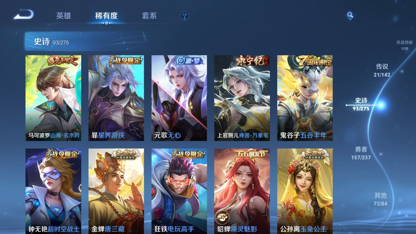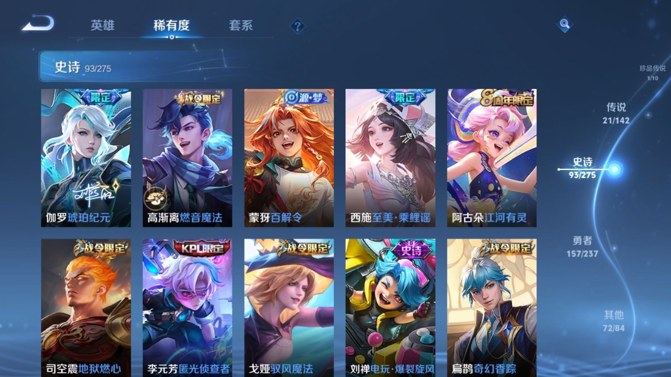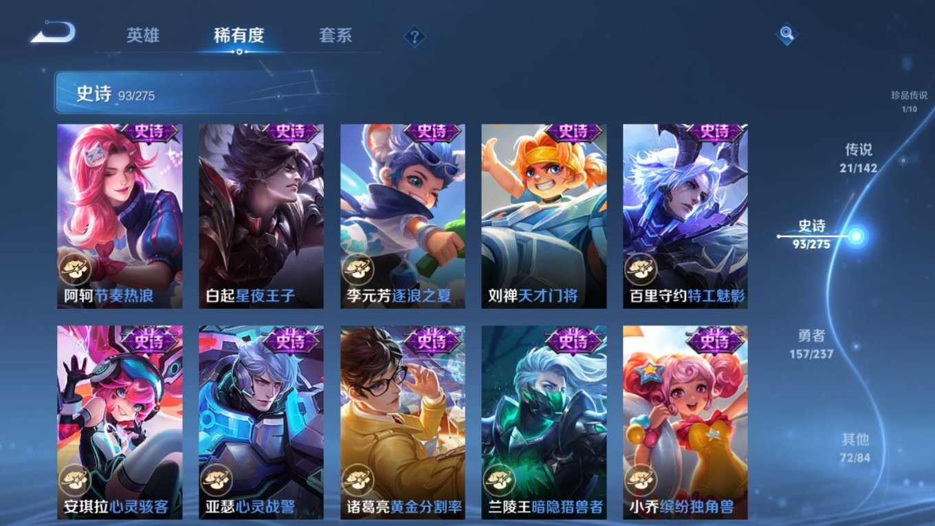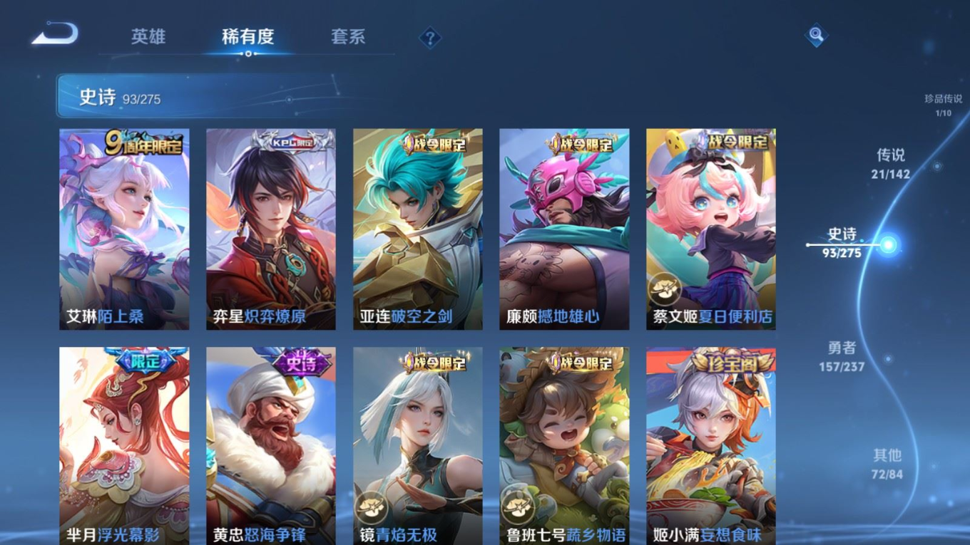 贵族等级:v8皮肤数:345传说品质21 生肖限定9 情人节限定1 荣耀典藏1 珍品传说1 英雄数:127