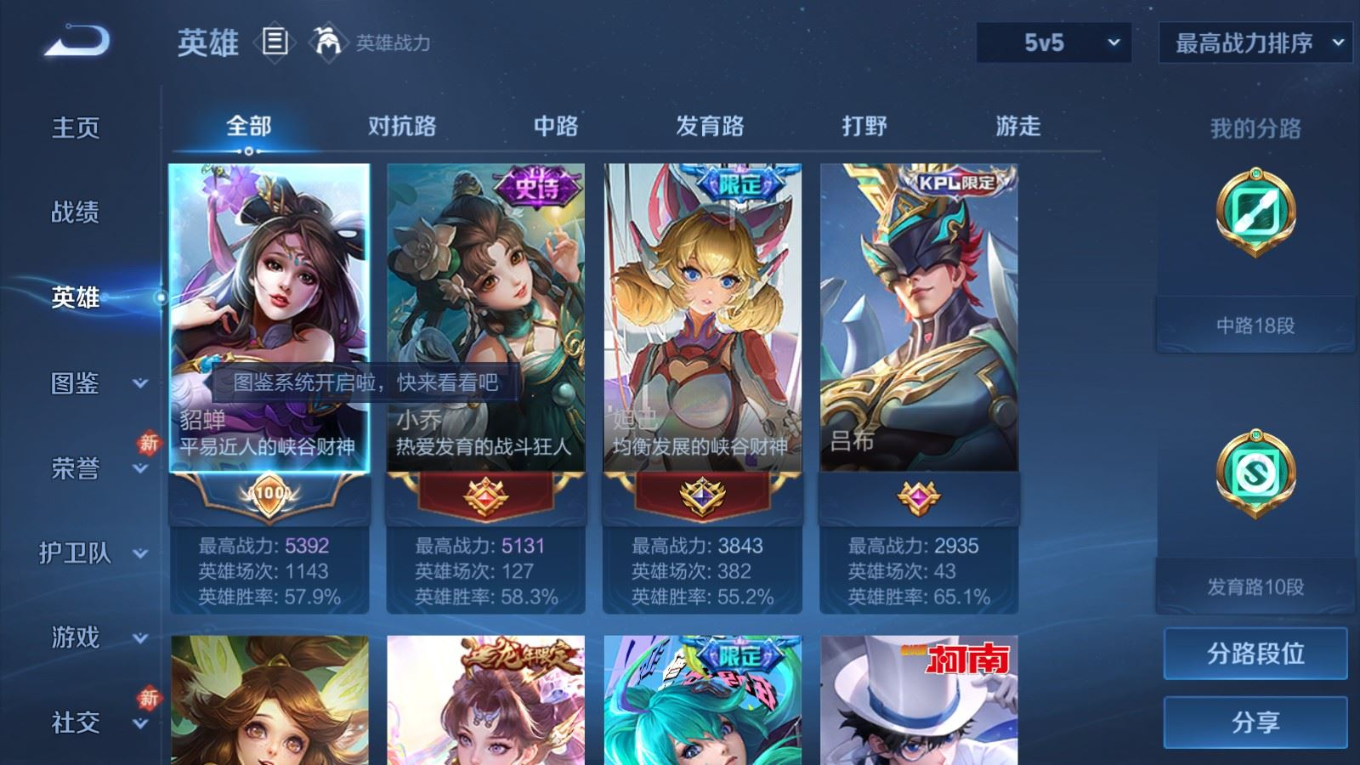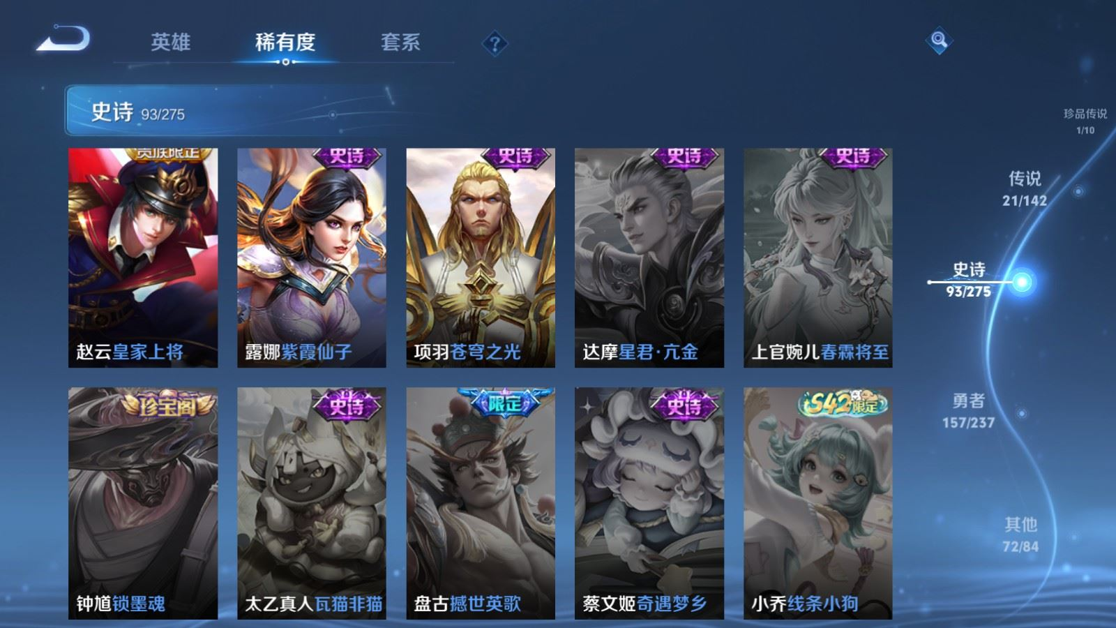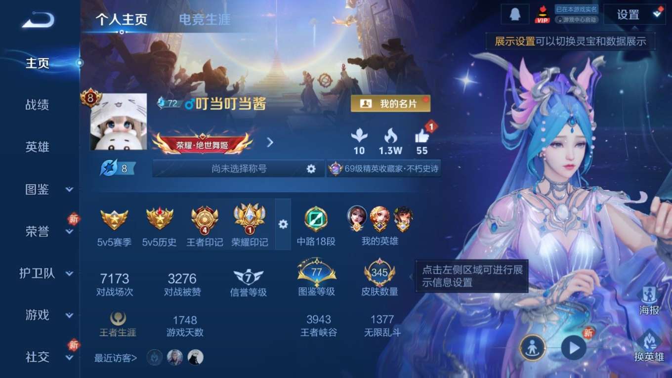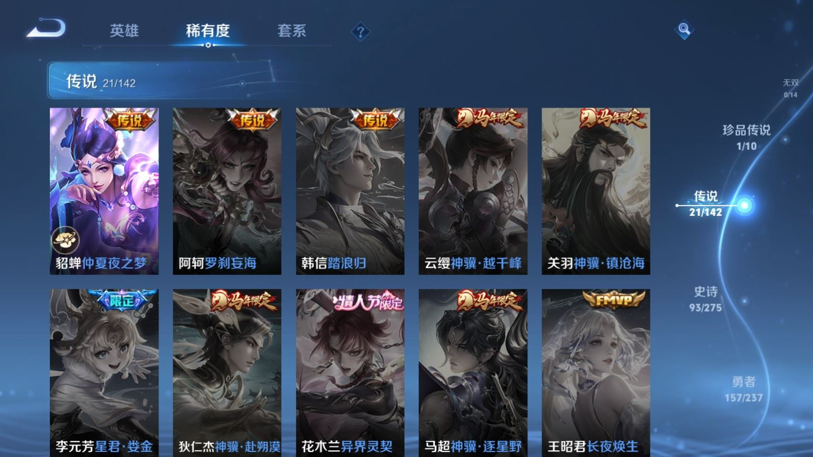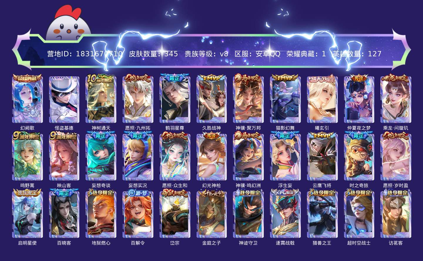 贵族等级:v8皮肤数:345传说品质21 生肖限定9 情人节限定1 荣耀典藏1 珍品传说1 英雄数:127