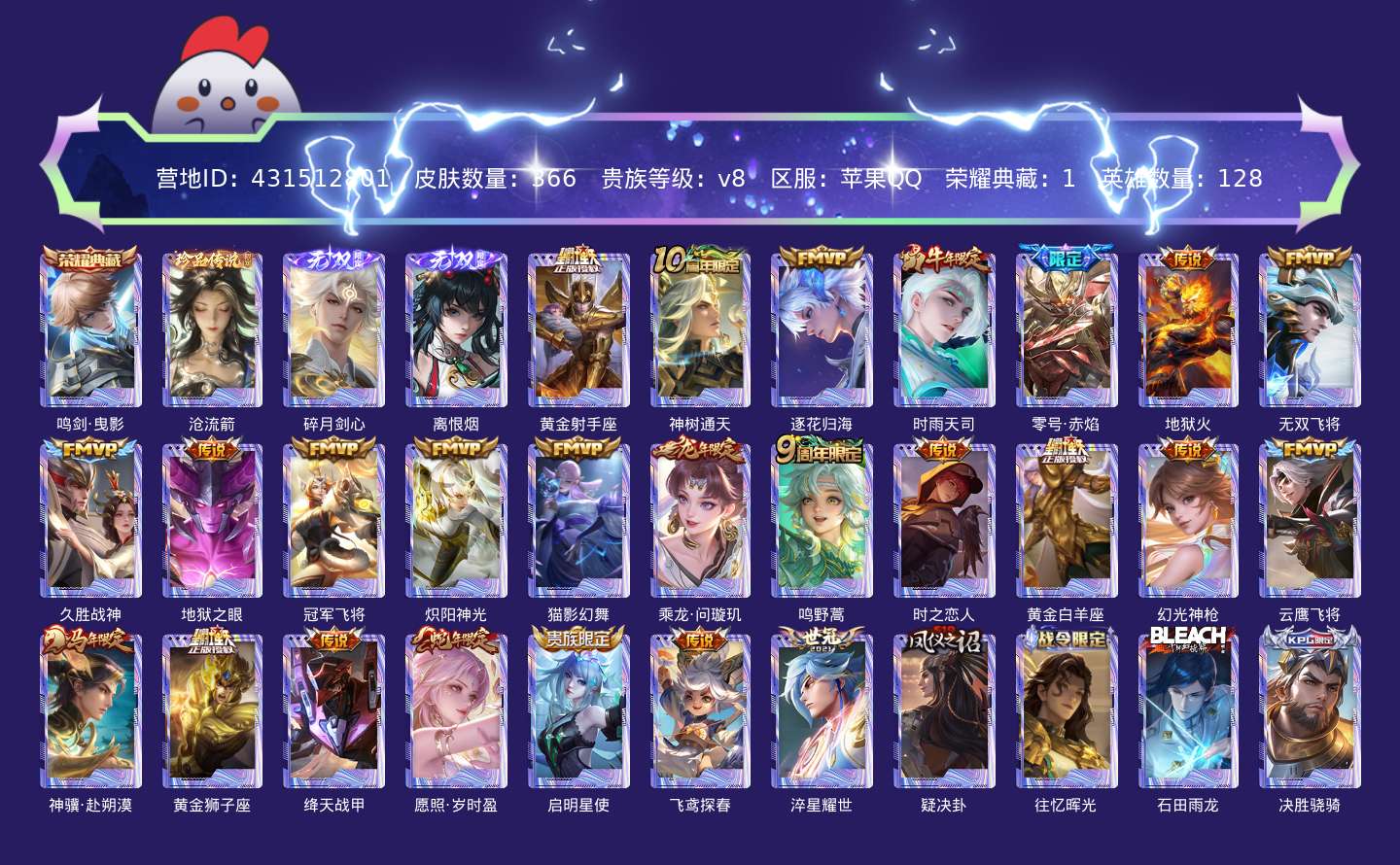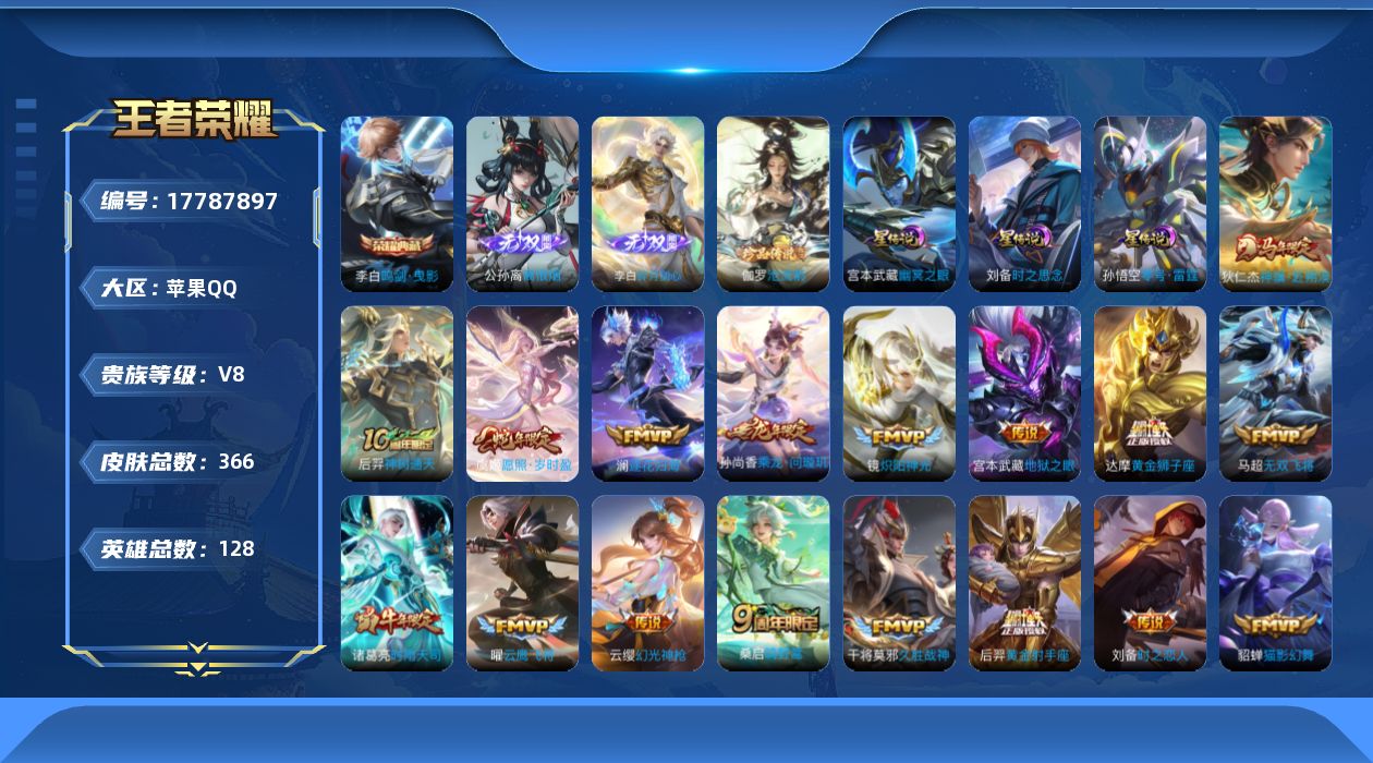 贵族等级:v8皮肤数:366传说品质25 生肖限定5 情人节限定2 荣耀典藏1 无双2 珍品传说1 英雄数:128