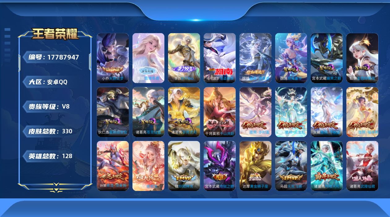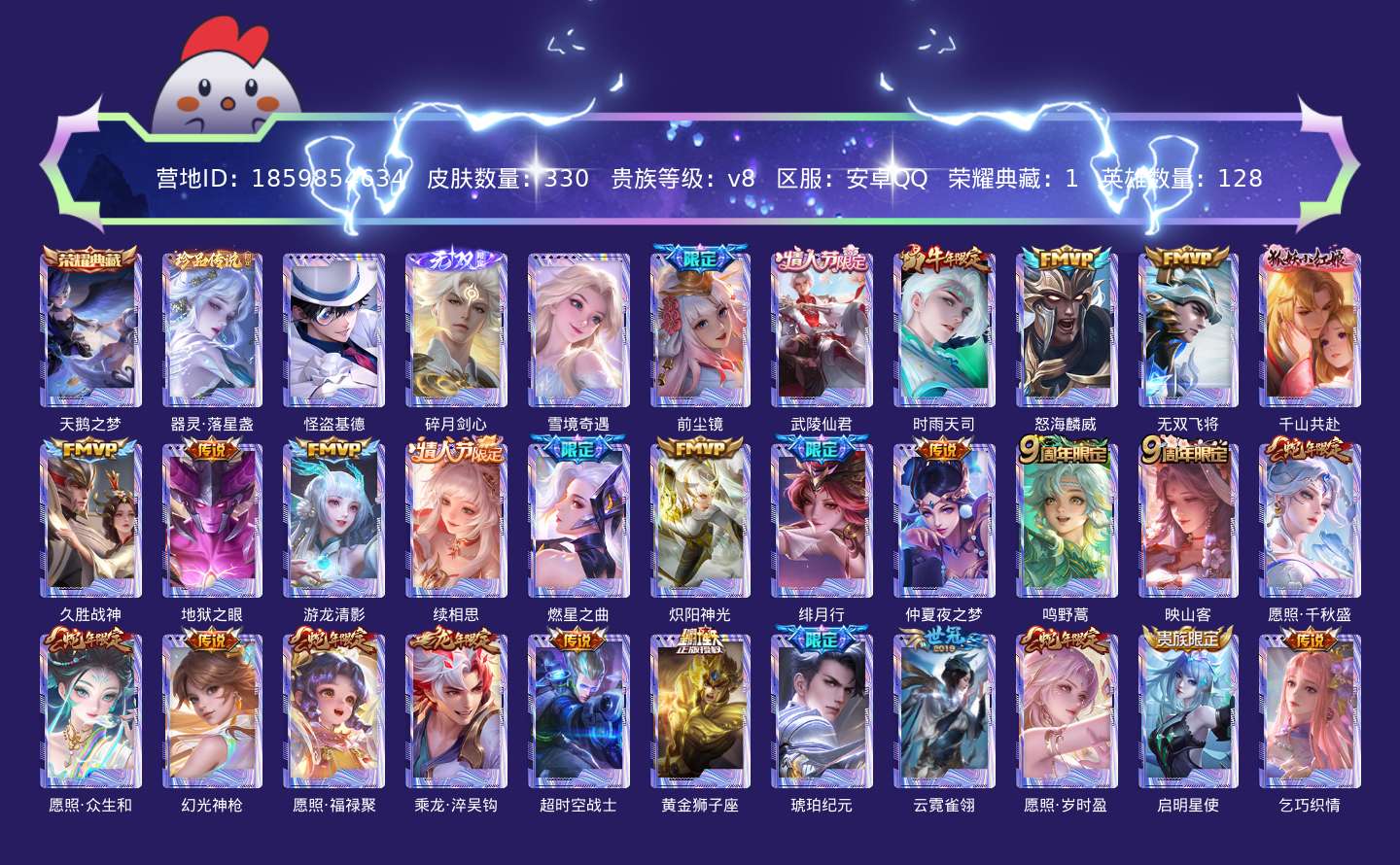 传说品质_娜可露露_前尘镜传说品质_诸葛亮_武陵仙君传说品质_诸葛亮_时雨天司传说品质_吕布_怒海麟威传说品质_马超_无双飞将传说品质_干将莫邪_千山共赴传说品质_干将莫邪_久胜战神传说品质_宫本武藏_地狱之眼传说品质_西施_游龙清影传说品质_西施_续相思传说品质_花木兰_燃星之曲传说品质_镜_炽阳神光传说品质_不知火舞_绯月行传说品质_貂蝉_仲夏夜之梦传说品质_桑启_鸣野蒿传说品质_王昭君_映山客传说品质_女娲_愿照·千秋盛传说品质_妲己_愿照·众生和传说品质_云缨_幻光神枪传说品质_蔡文姬_愿照·福禄聚传说品质_孙策_乘龙·淬吴钩传说品质_狄仁杰_超时空战士传说品质_达摩_黄金狮子座传说品质_铠_琥珀纪元传说品质_虞姬_云霓雀翎传说品质_虞姬_愿照·岁时盈传说品质_虞姬_启明星使传说品质_王昭君_乞巧织情