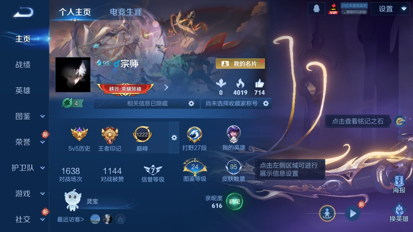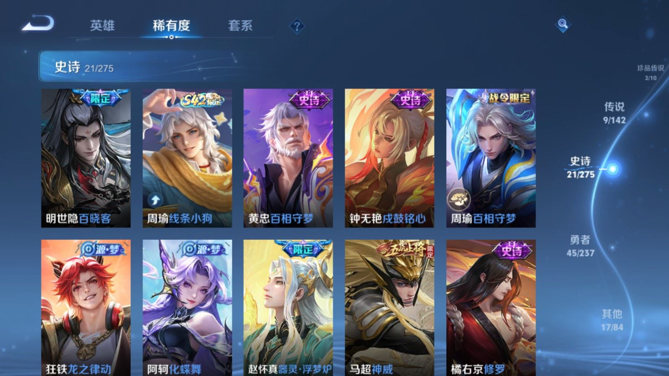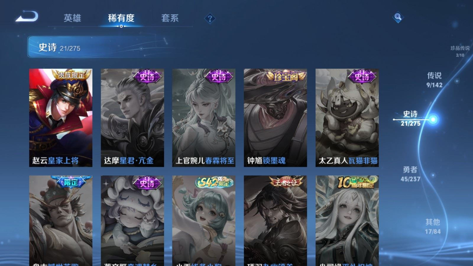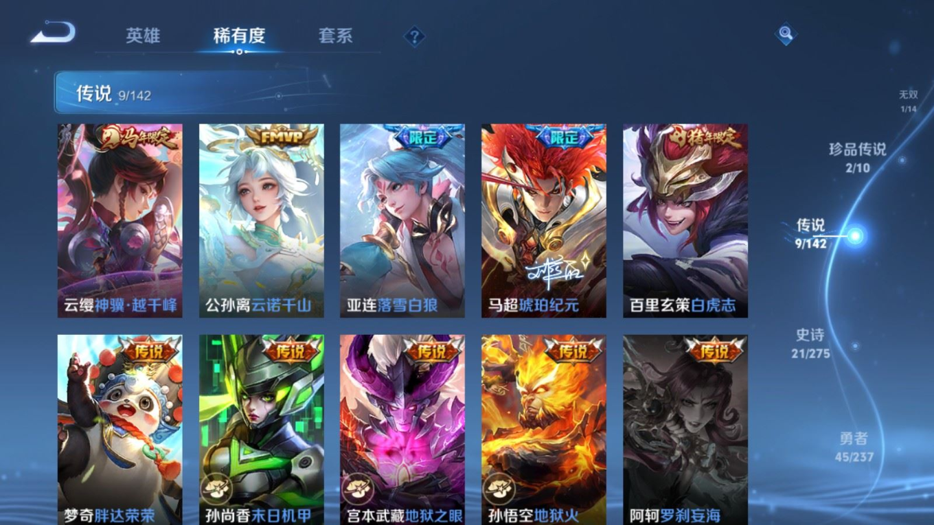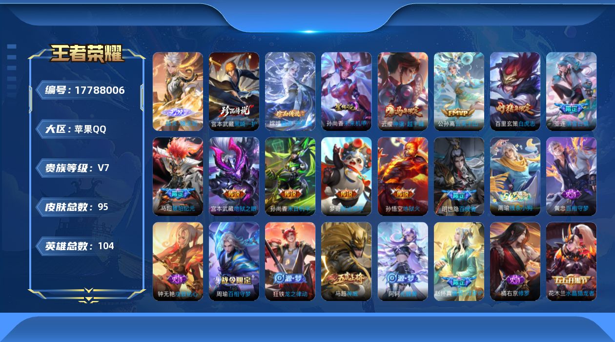 贵族等级:v7皮肤数:95传说品质9 珍品传说2 生肖限定2 无双1 英雄数:104