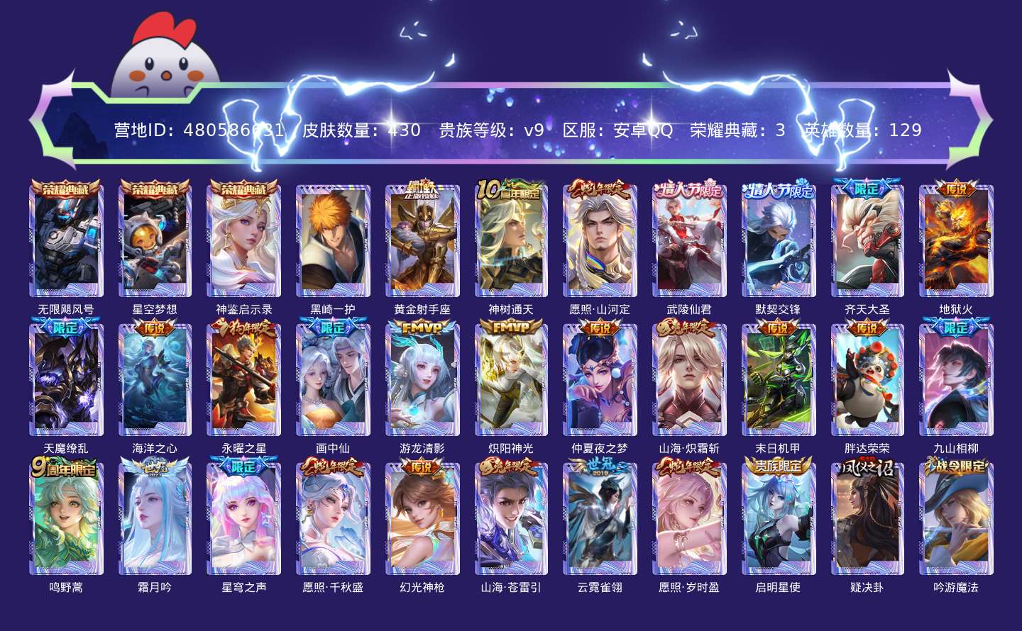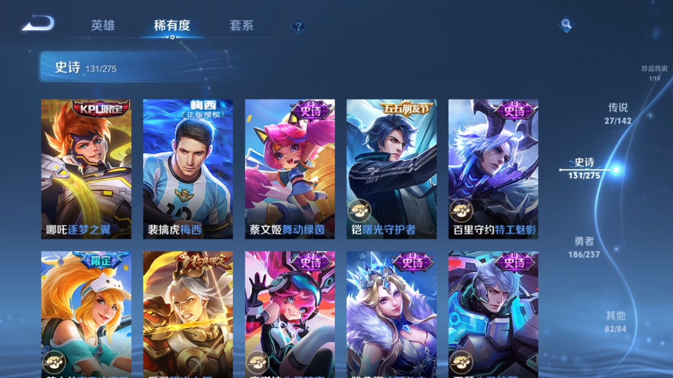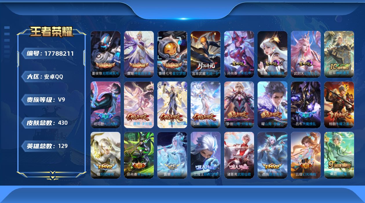 贵族等级:v9皮肤数:430生肖限定10 传说品质27 情人节限定4 珍品传说1 荣耀典藏3 英雄数:129
