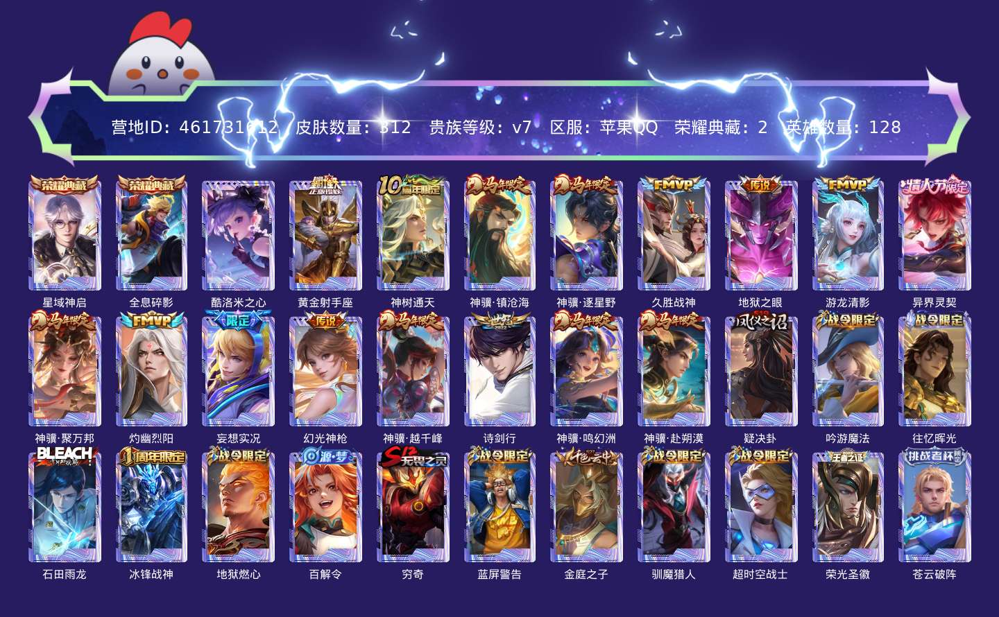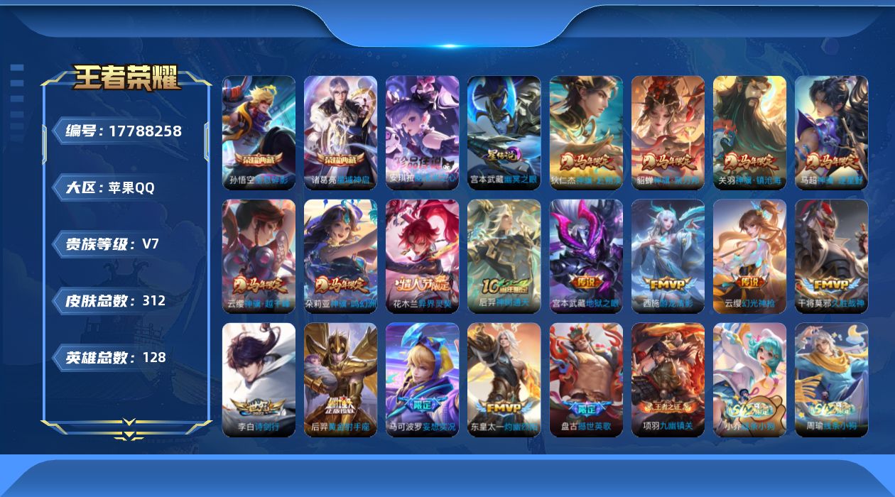 贵族等级:v7皮肤数:312传说品质16 生肖限定7 荣耀典藏2 情人节限定1 珍品传说1 英雄数:128