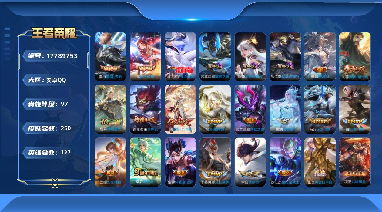 贵族等级:v7皮肤数:250传说品质17 生肖限定6 珍品传说1 荣耀典藏2 英雄数:127