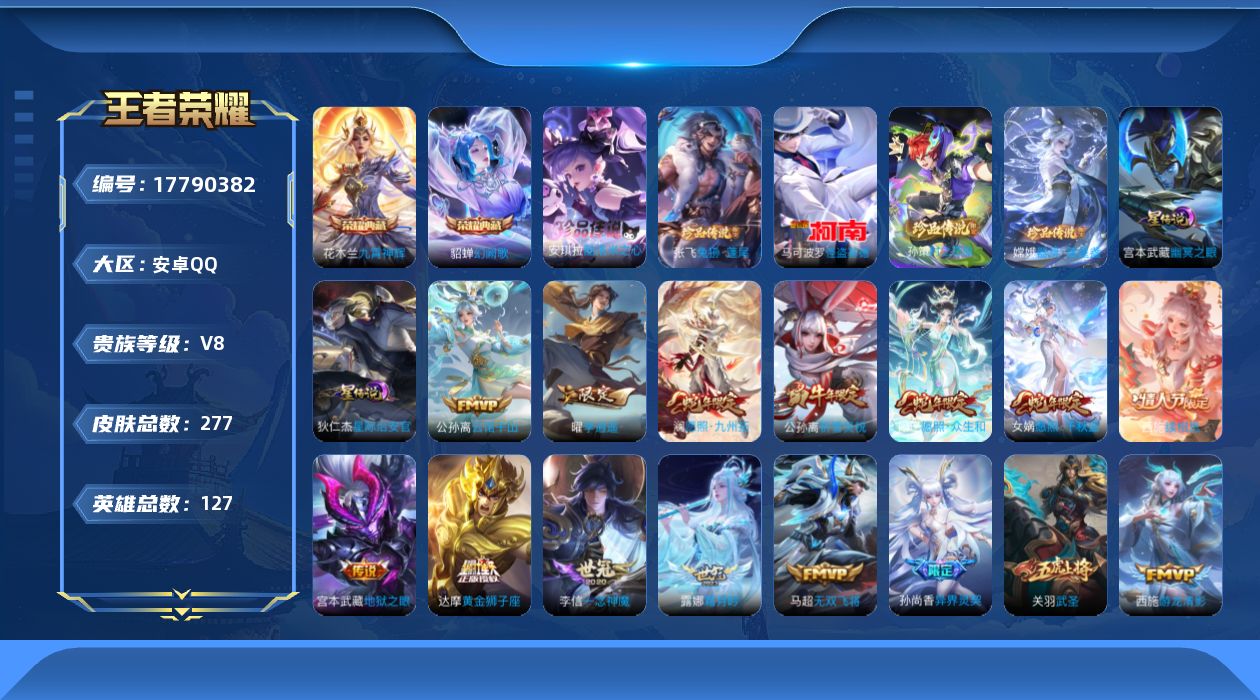 贵族等级:v8皮肤数:277传说品质27 生肖限定4 情人节限定2 荣耀典藏2 珍品传说5 英雄数:127