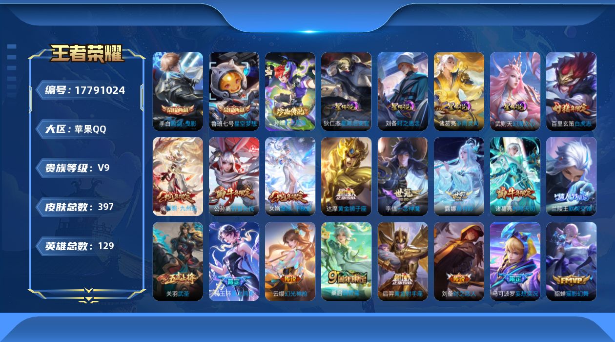 贵族等级:v9皮肤数:397生肖限定9 传说品质25 情人节限定4 荣耀典藏2 珍品传说1 英雄数:129