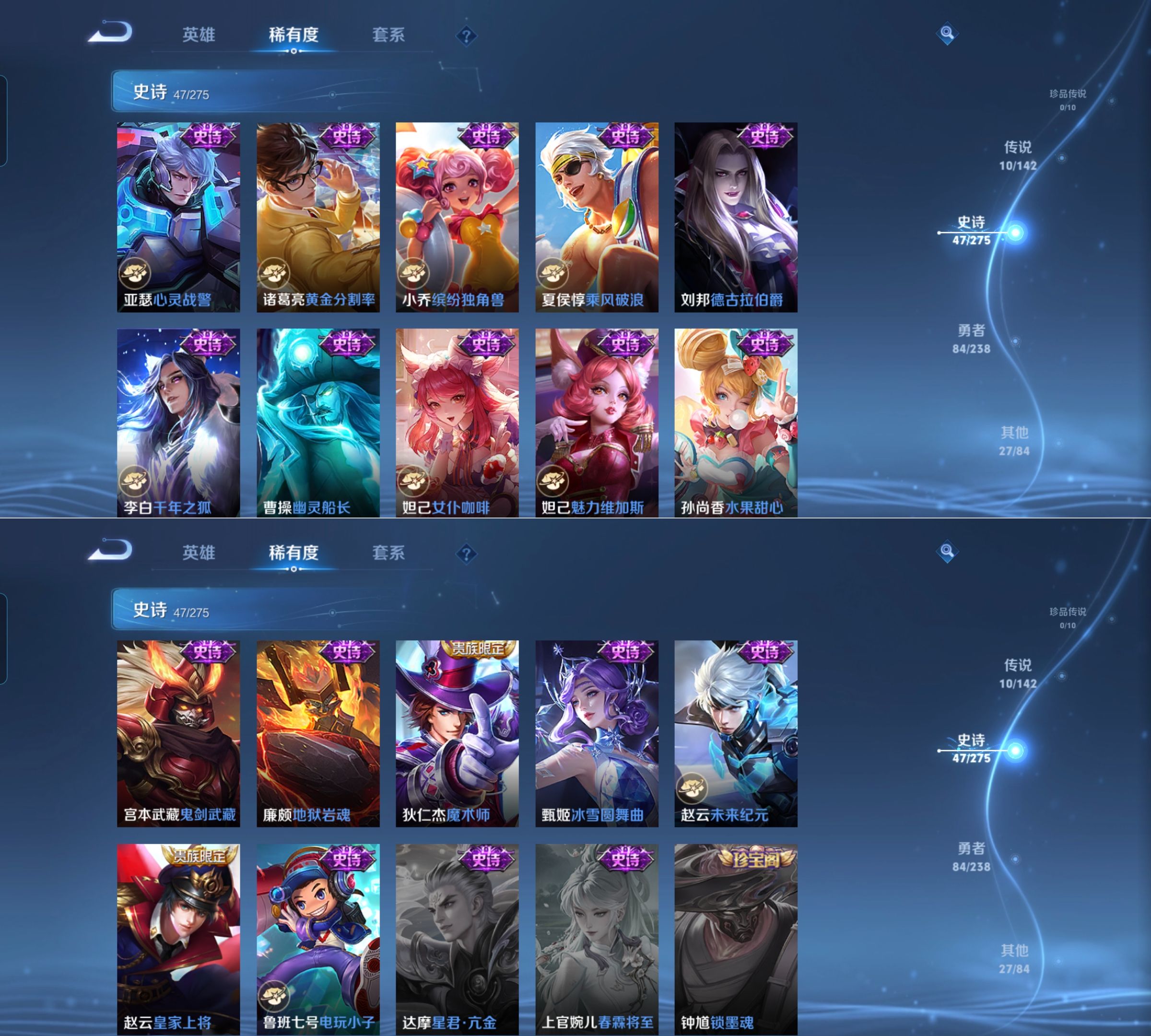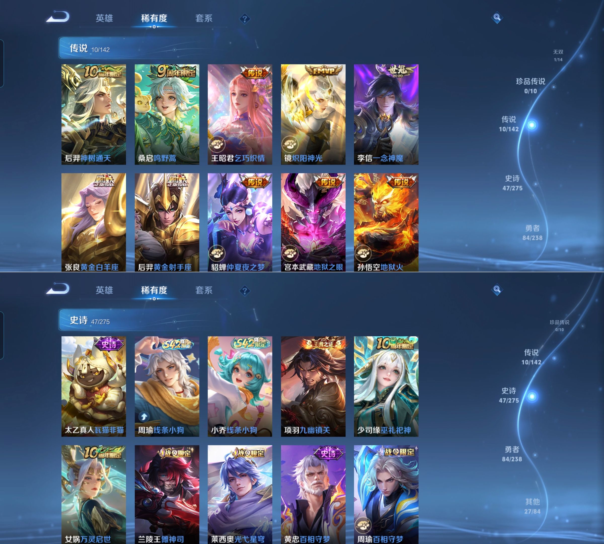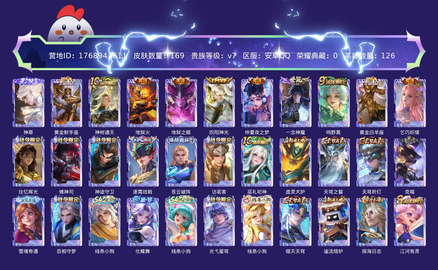 贵族等级:v7皮肤数:169传说品质10 无双1 英雄数:126