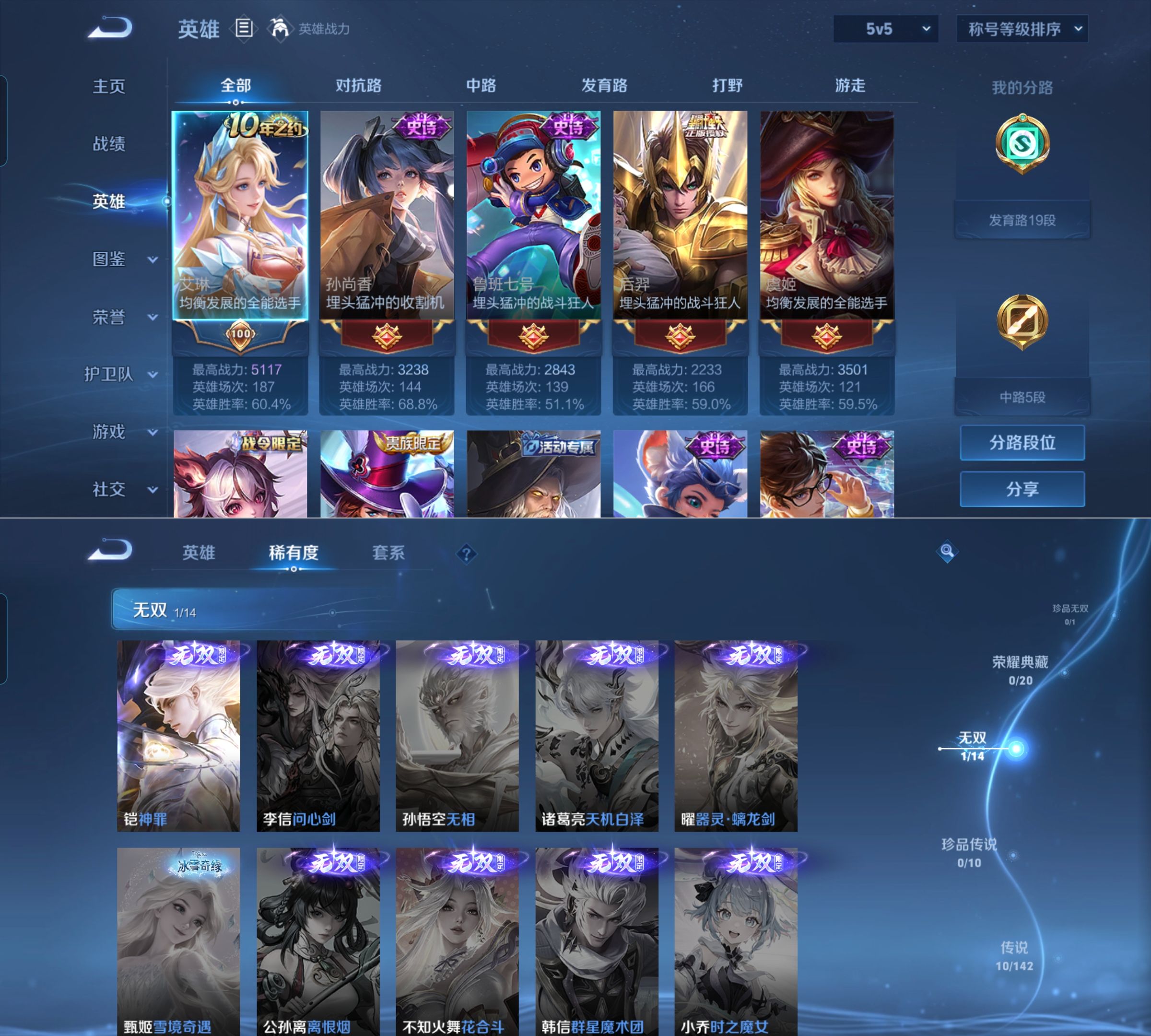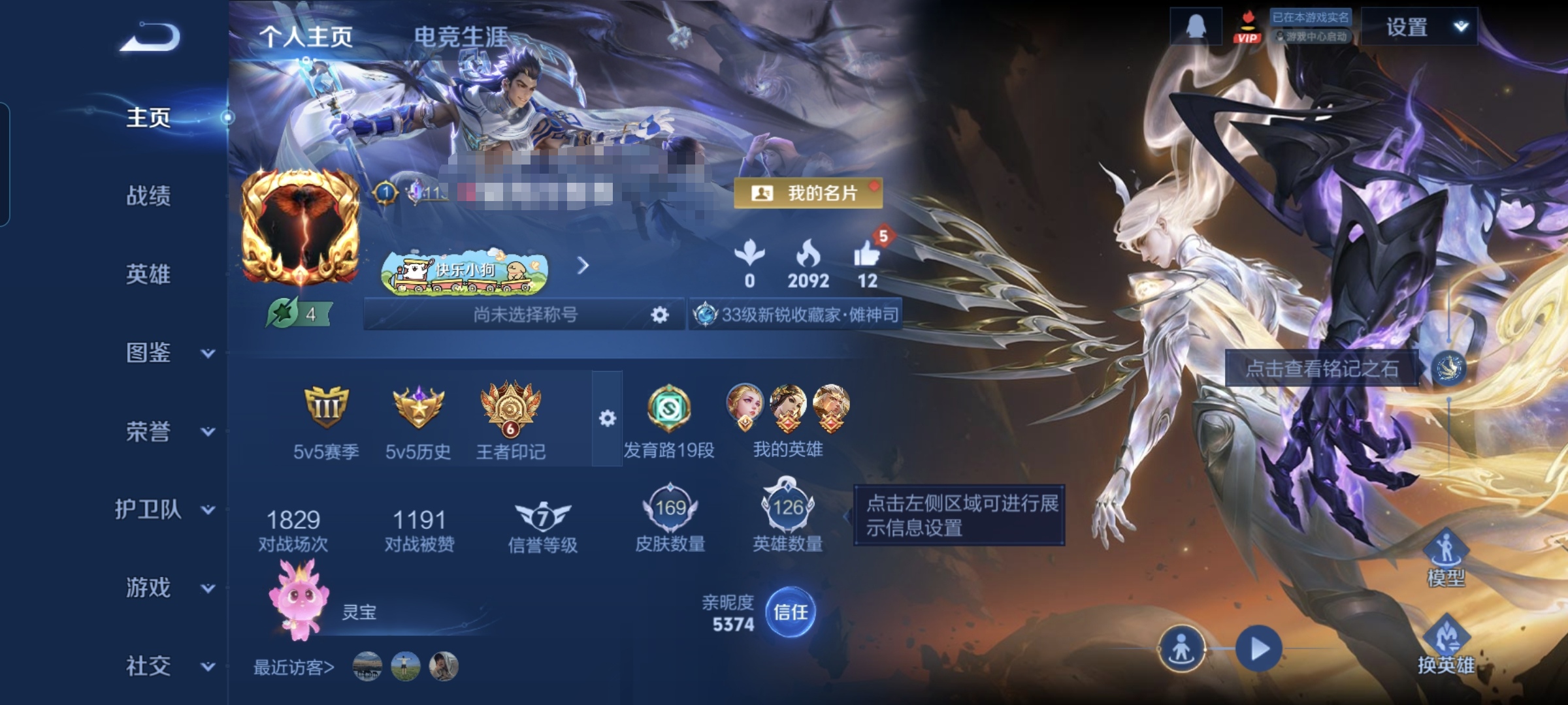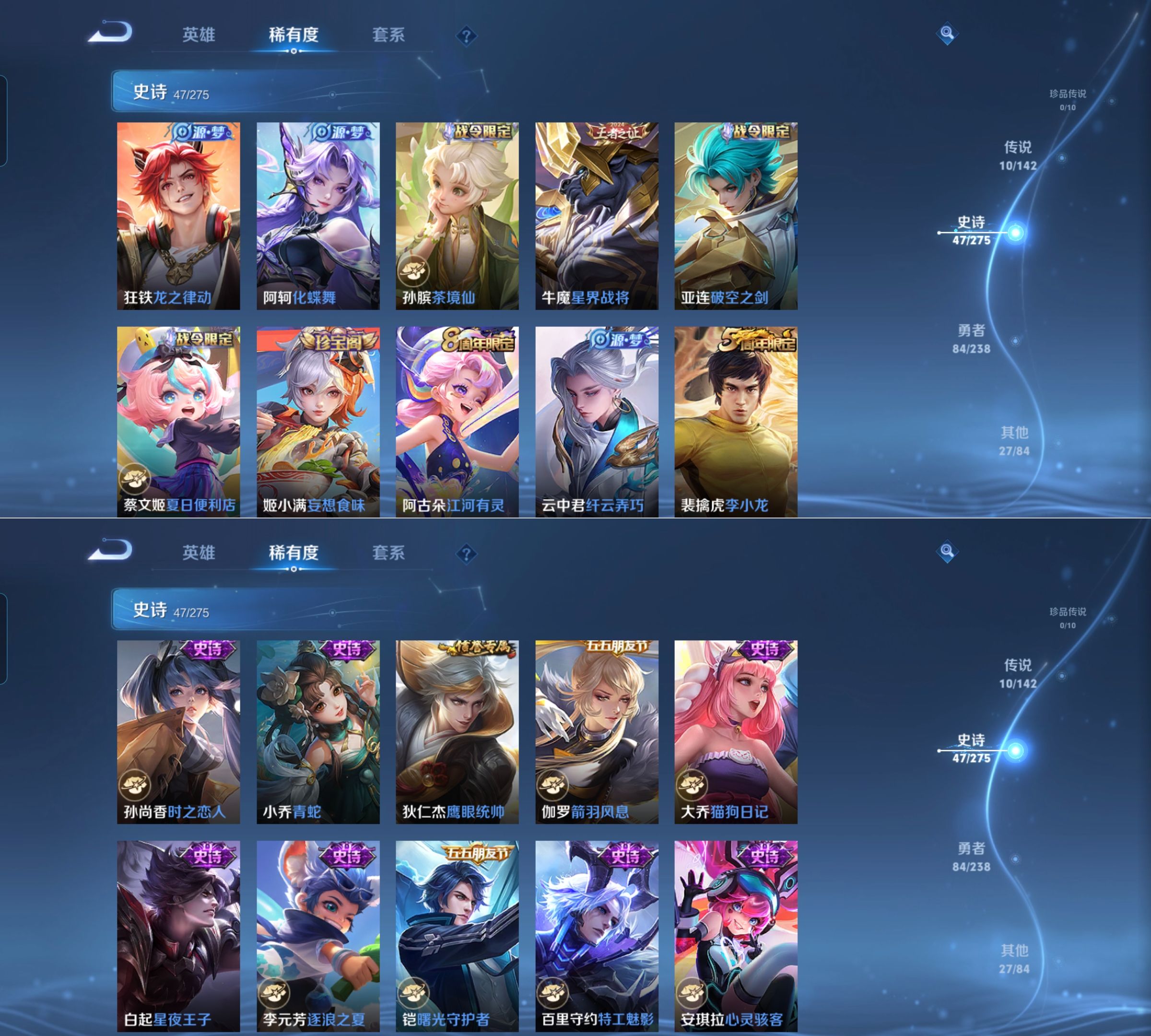贵族等级:v7皮肤数:169传说品质10 无双1 英雄数:126