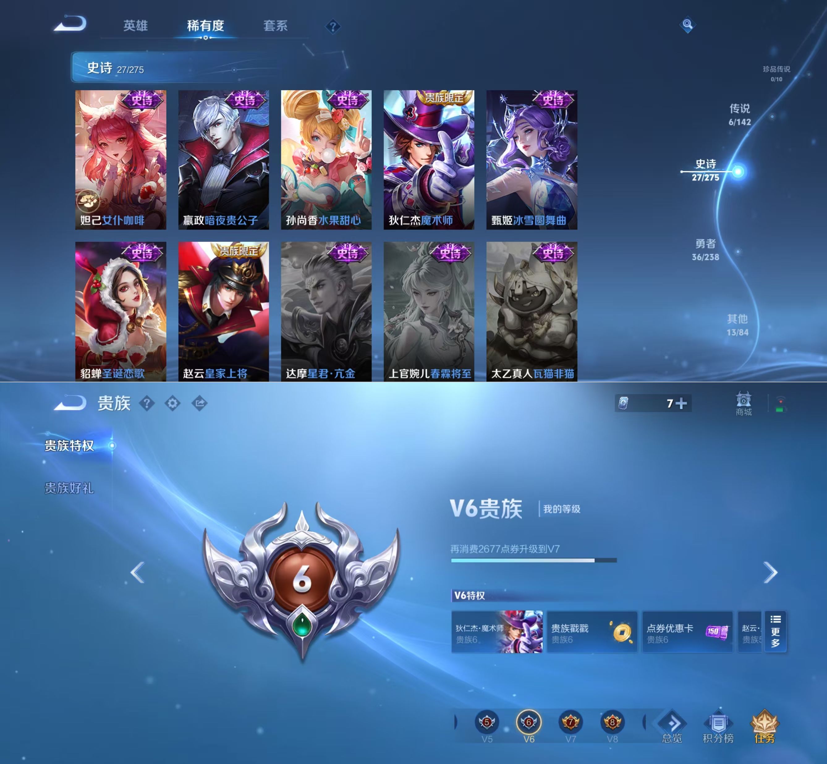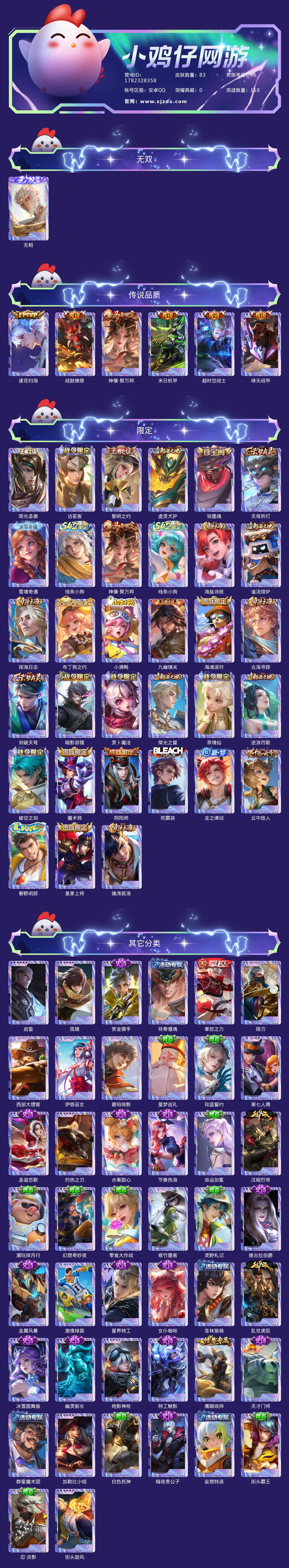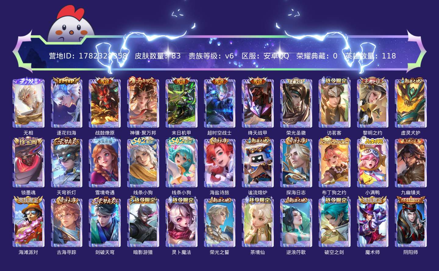 贵族等级:v6皮肤数:83传说品质6 无双1 生肖限定1 英雄数:118