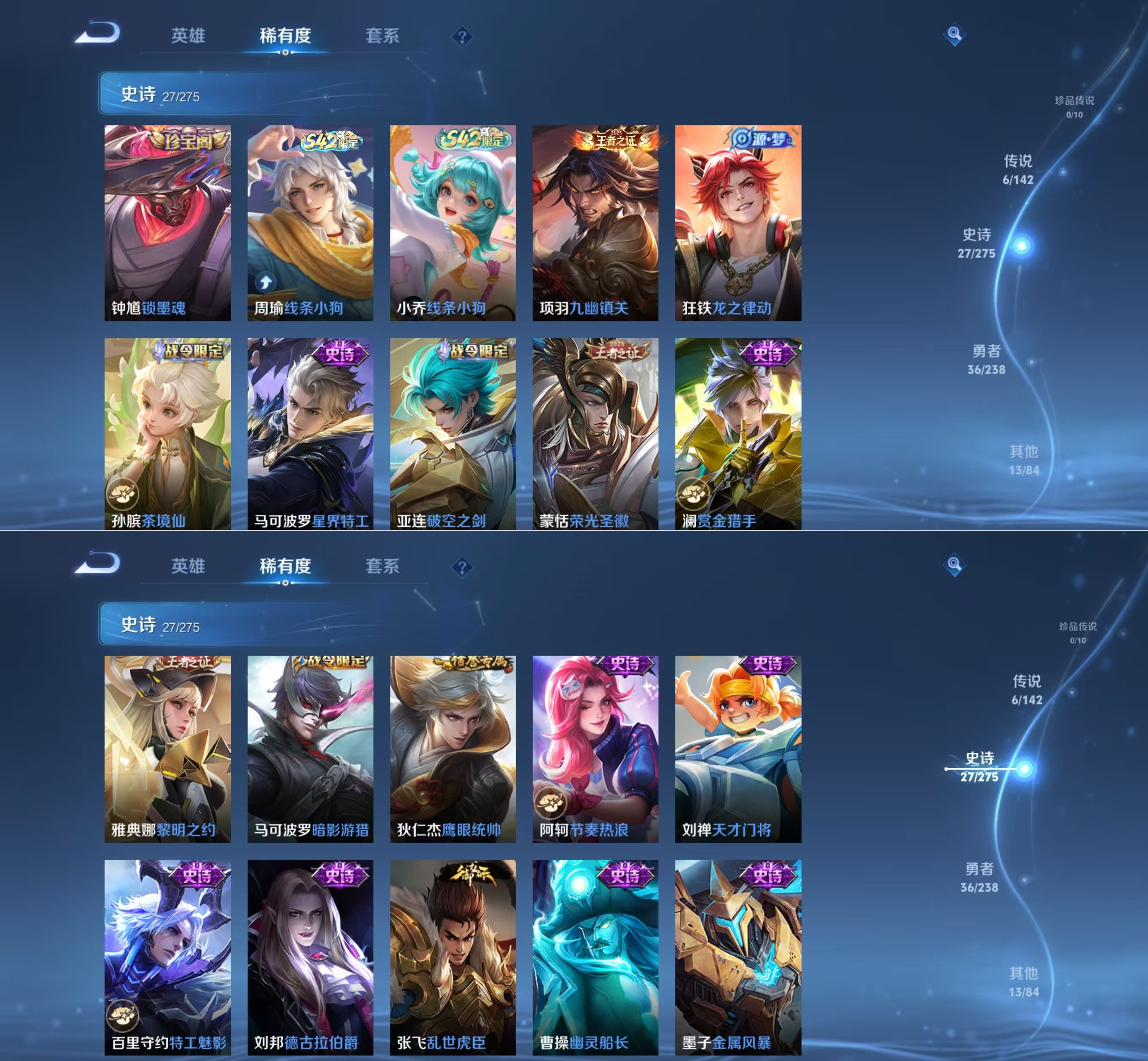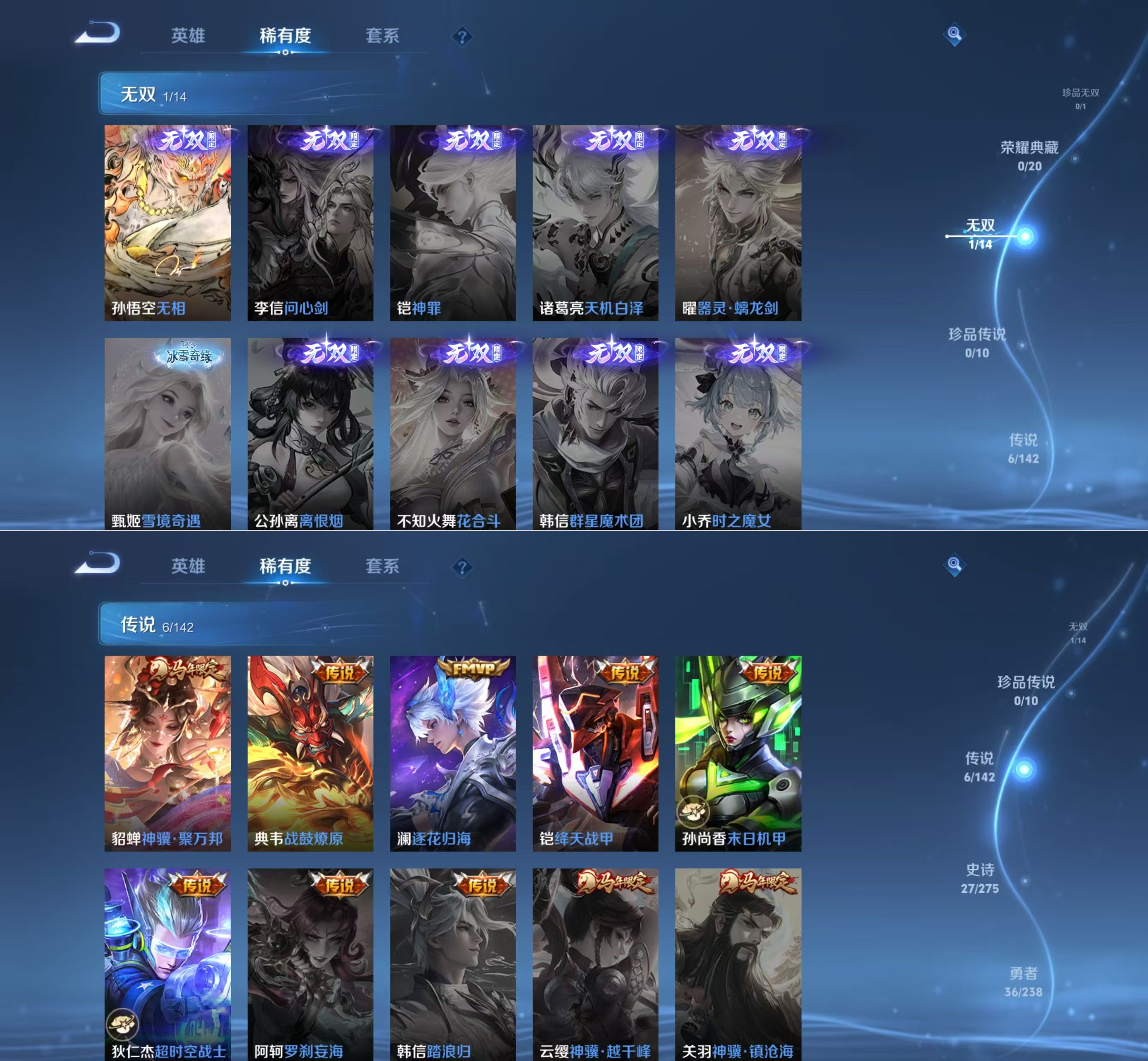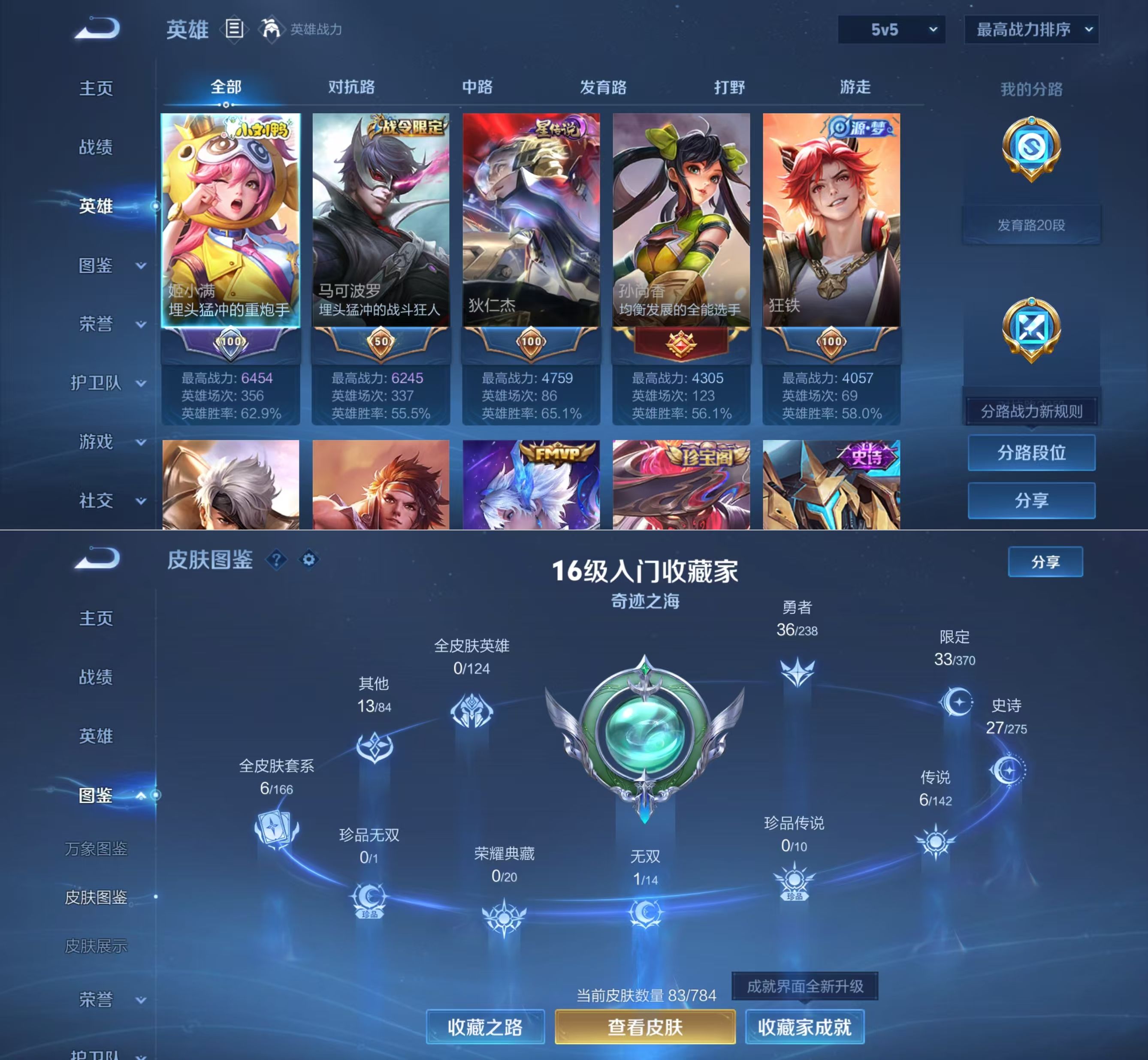 贵族等级:v6皮肤数:83传说品质6 无双1 生肖限定1 英雄数:118