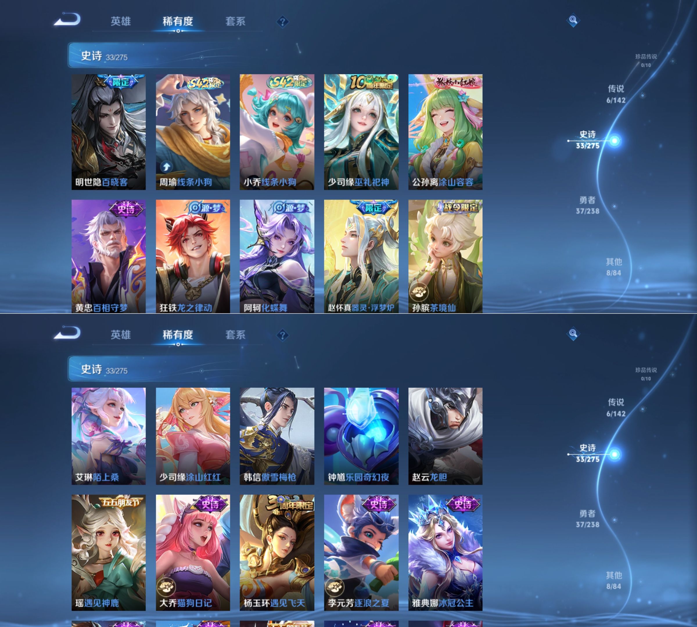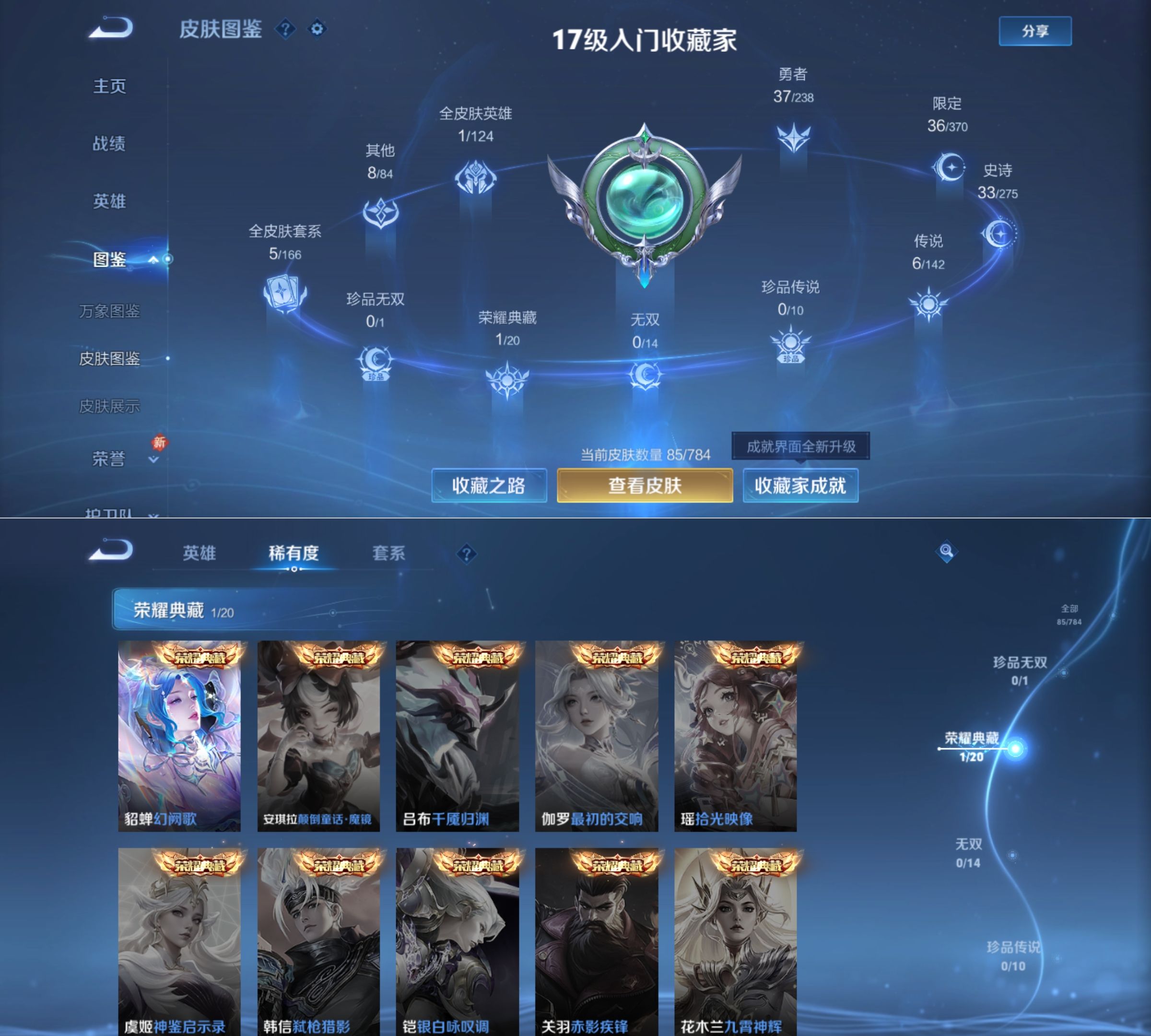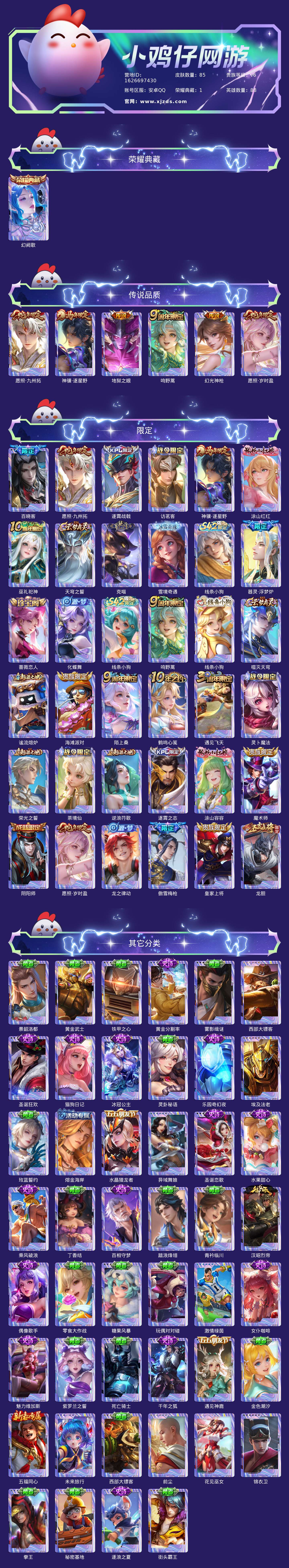 贵族等级:v6皮肤数:85传说品质6 生肖限定3 荣耀典藏1 英雄数:88