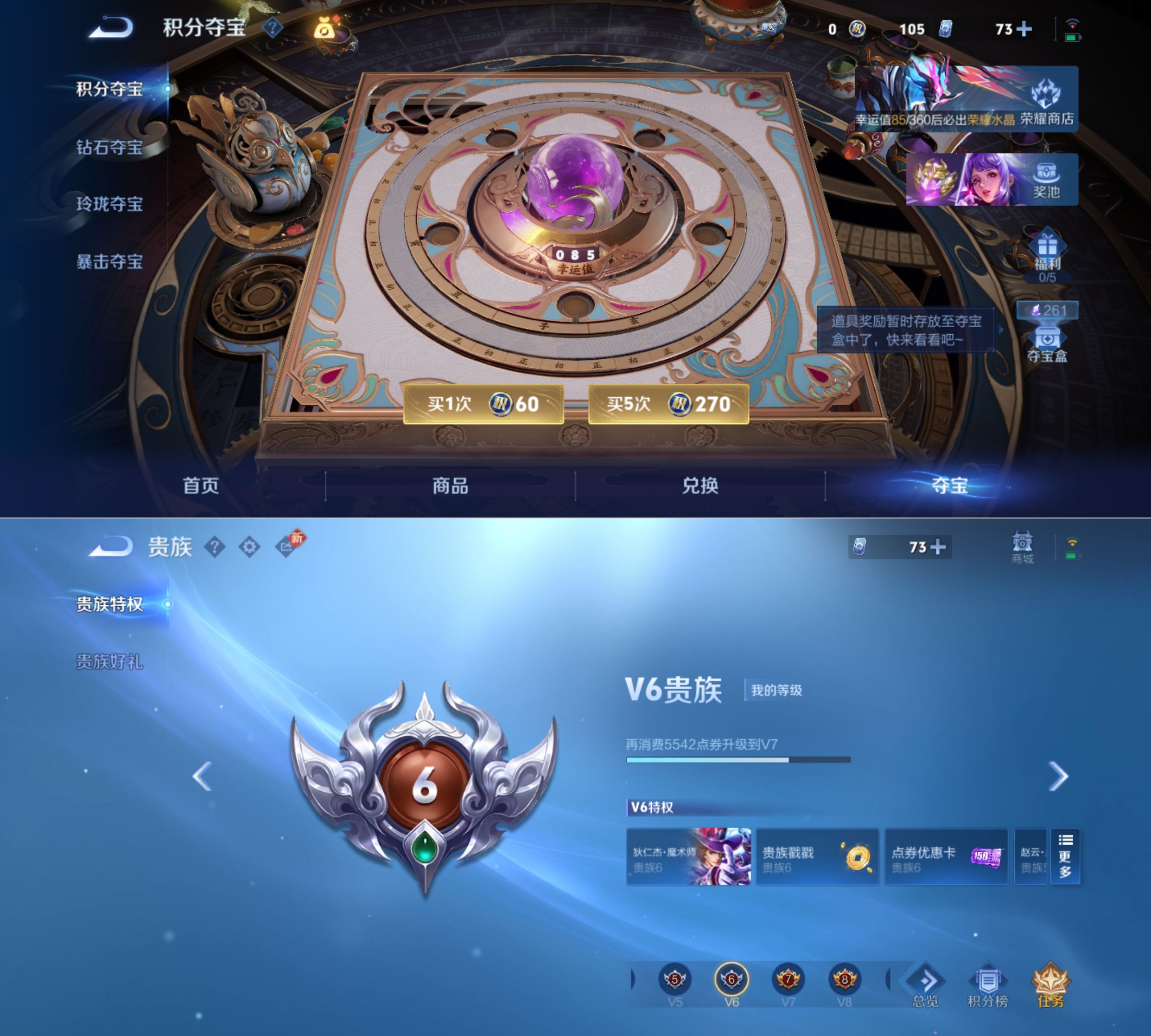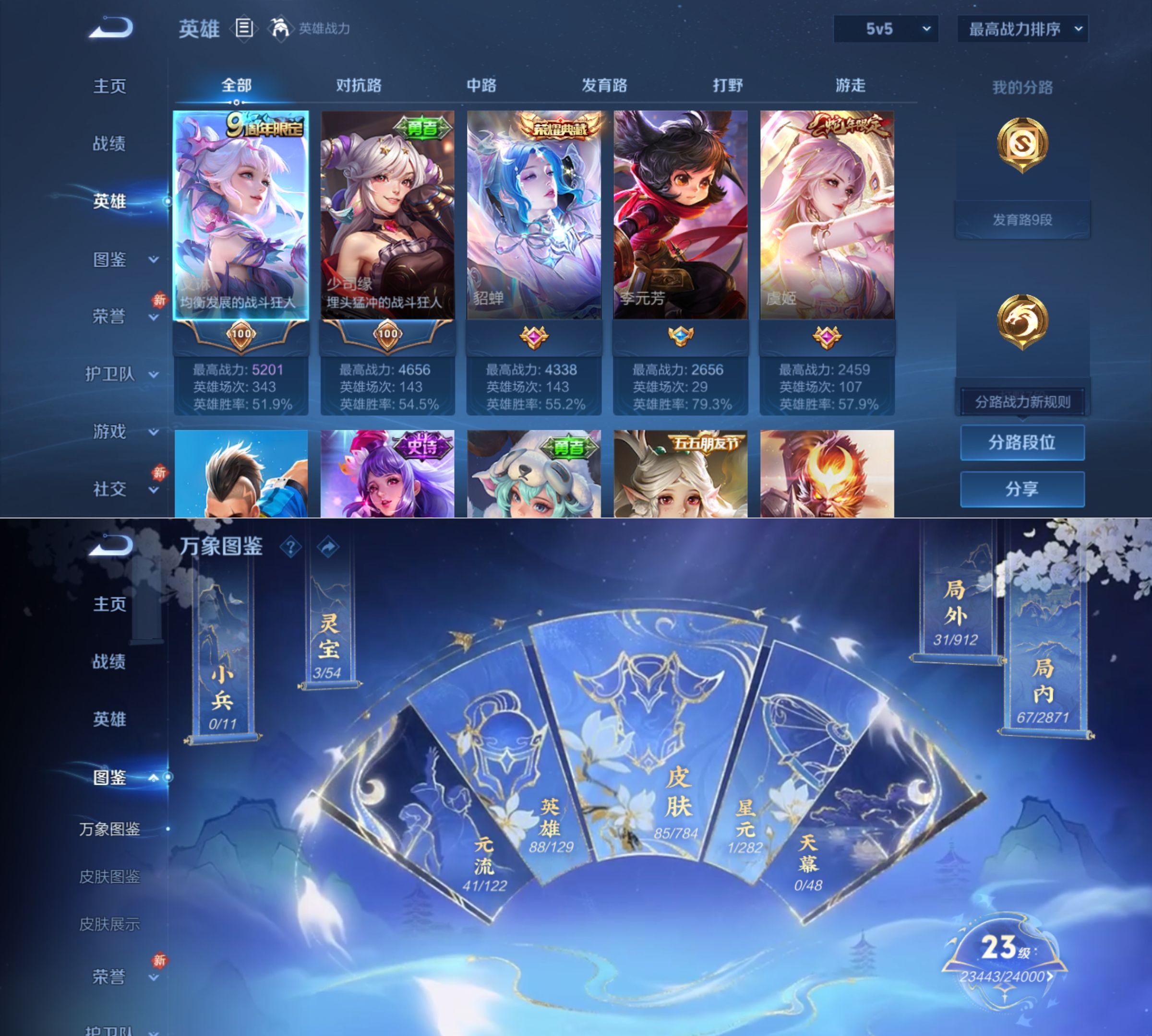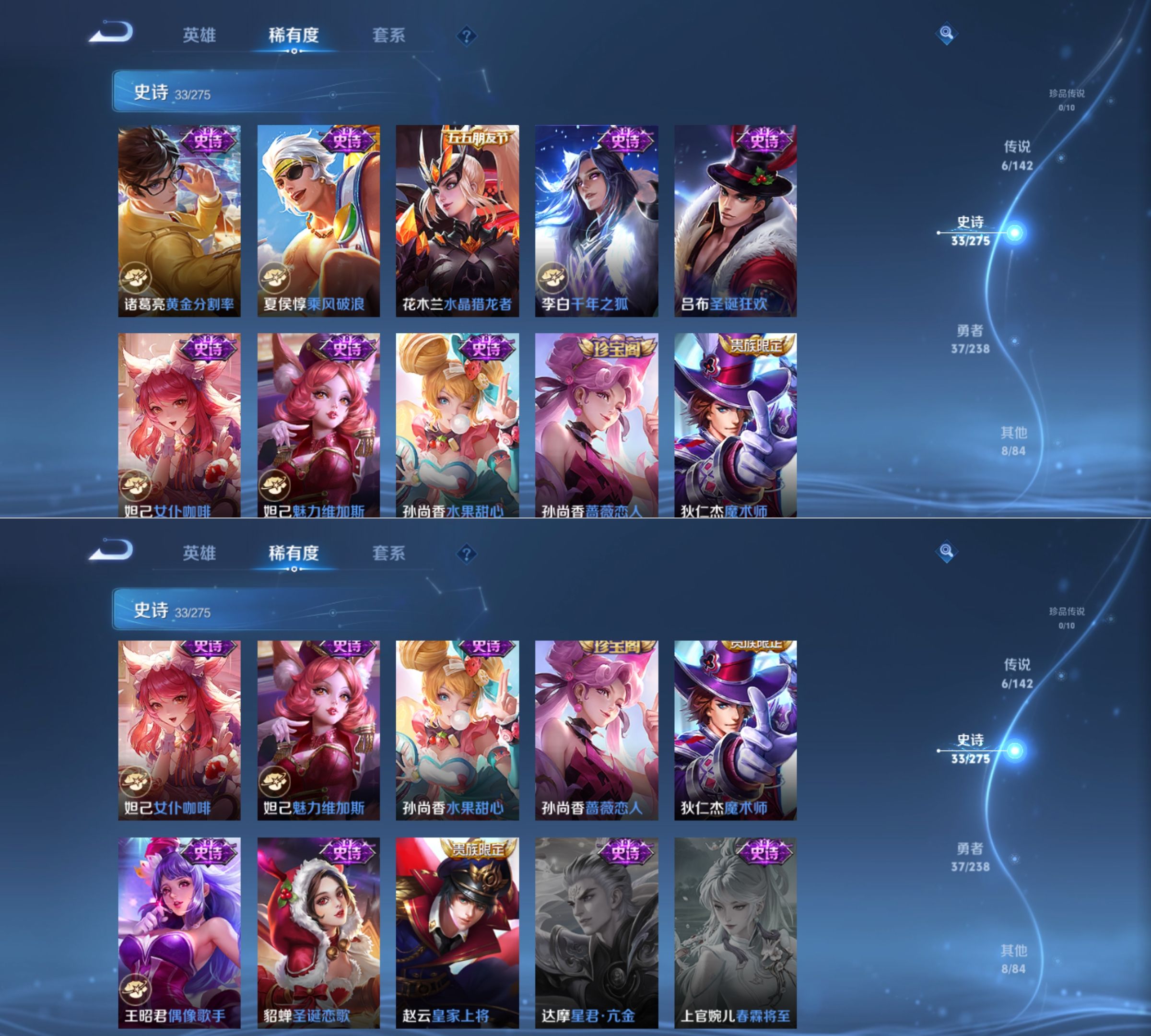 贵族等级:v6皮肤数:85传说品质6 生肖限定3 荣耀典藏1 英雄数:88