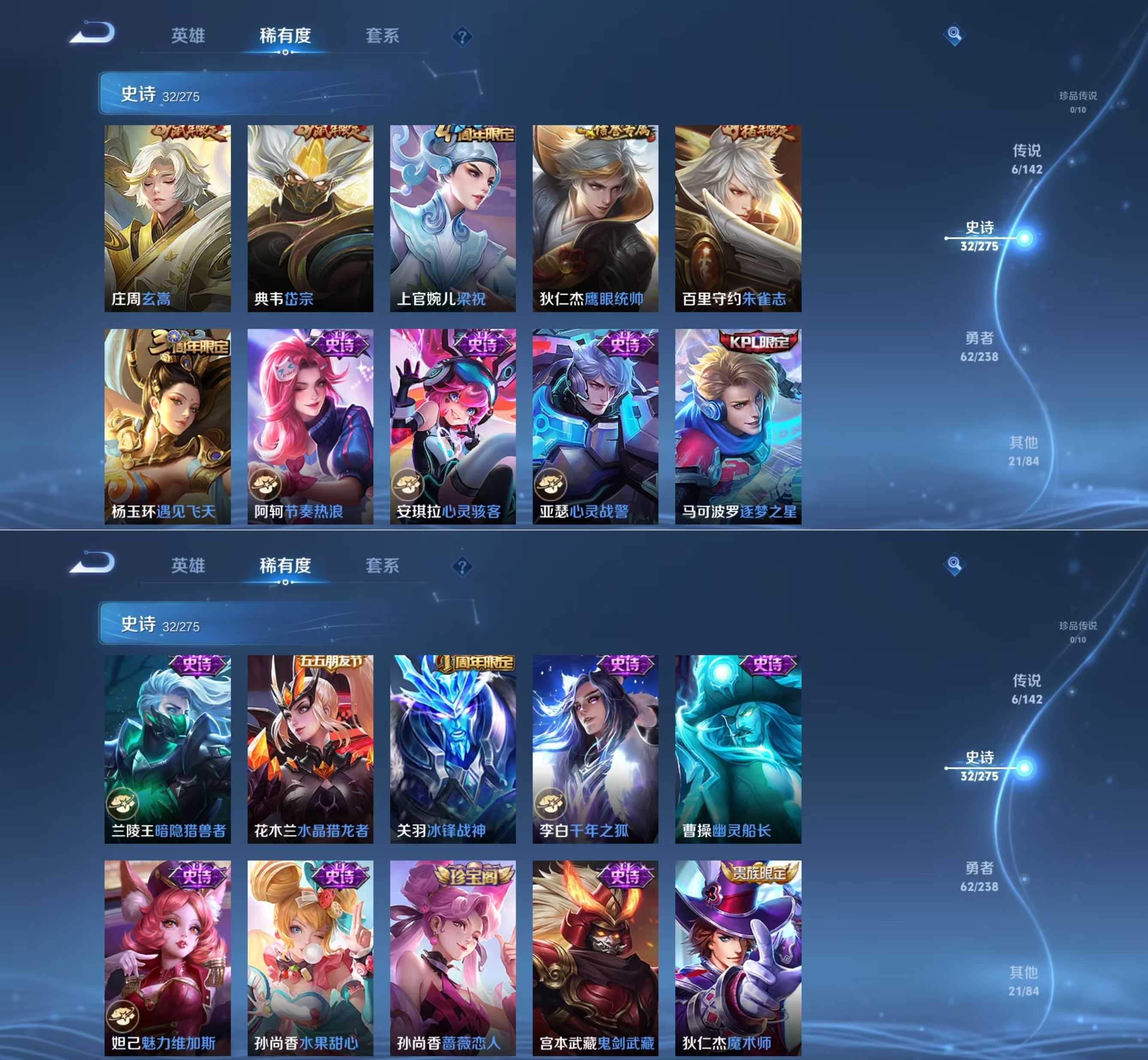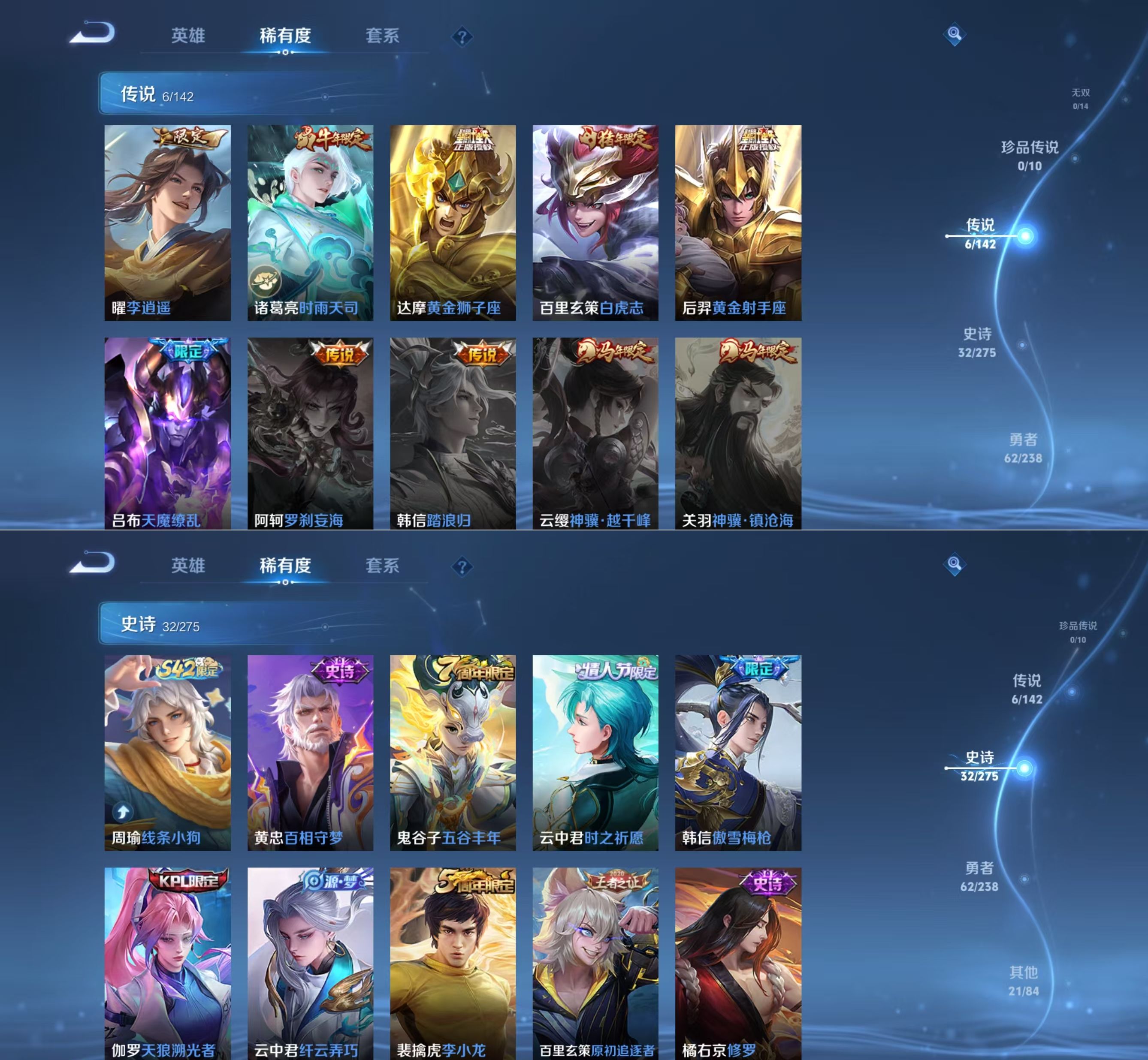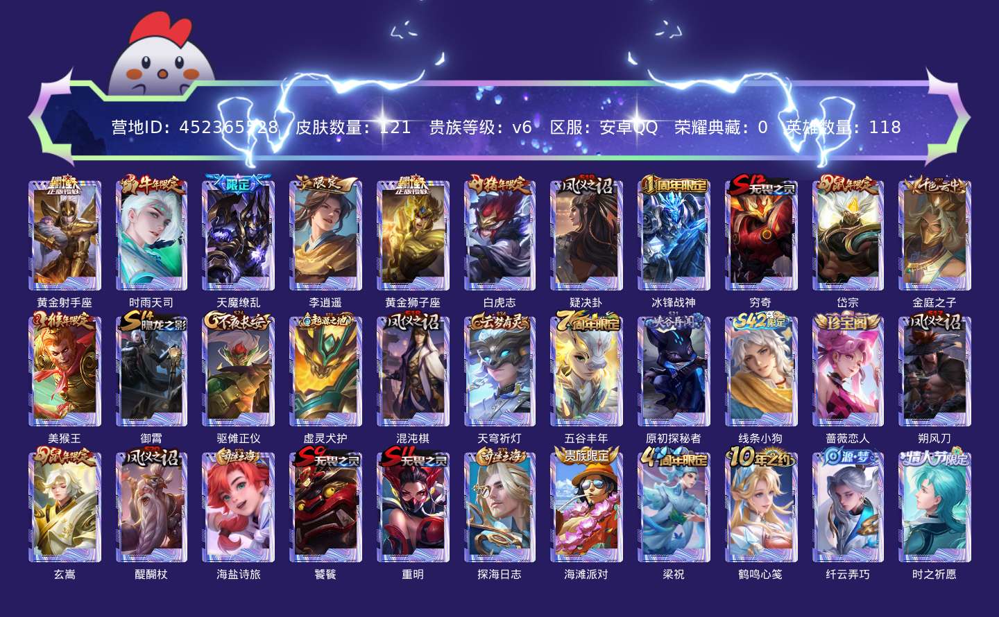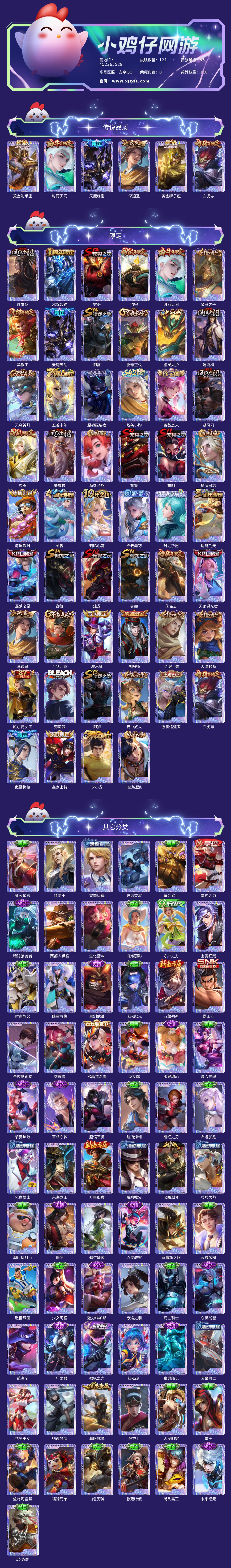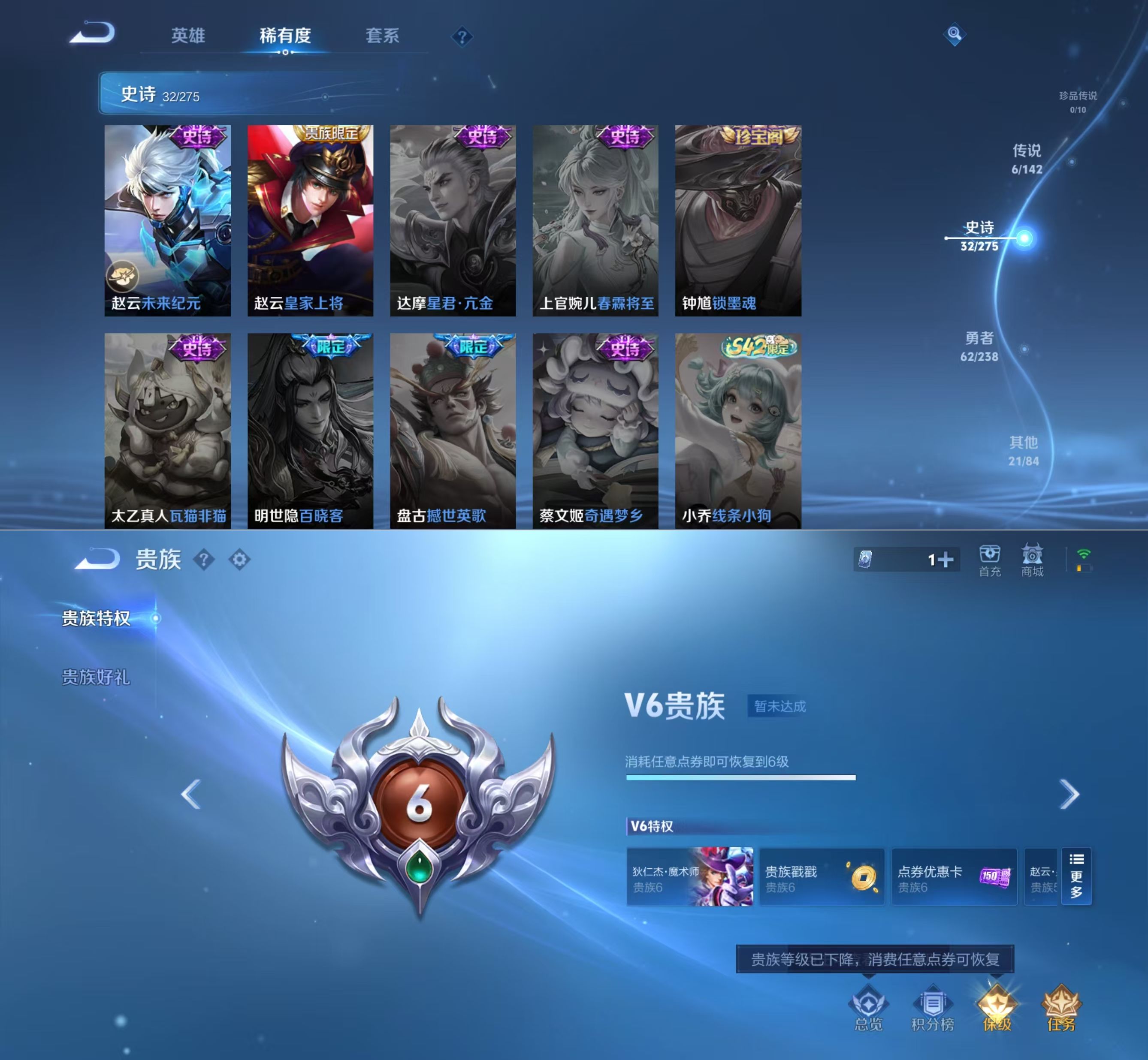 贵族等级:v6皮肤数:121传说品质6 生肖限定6 情人节限定1 英雄数:118