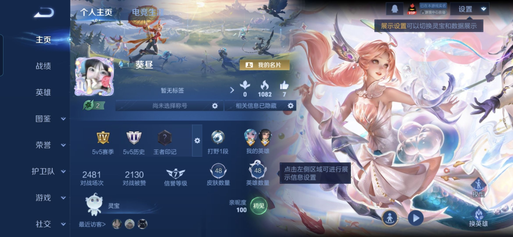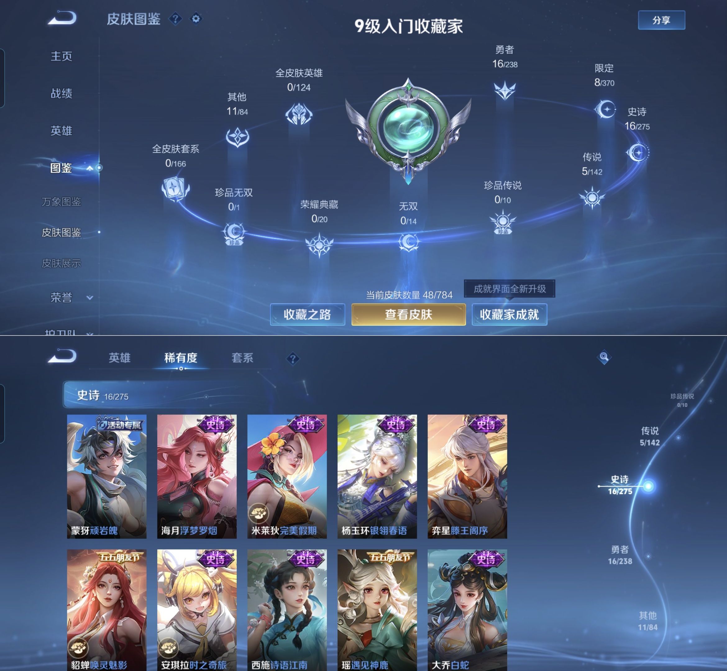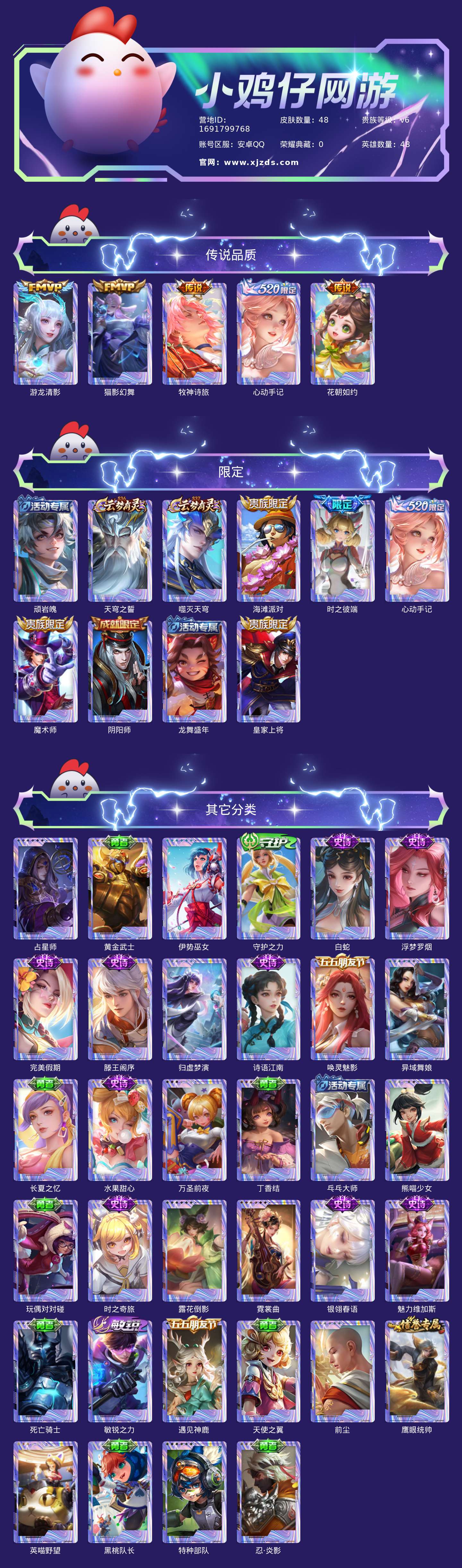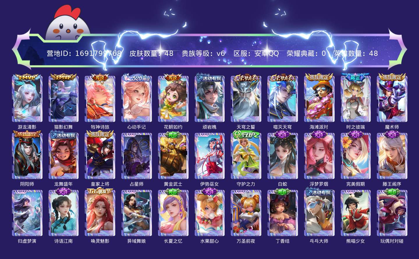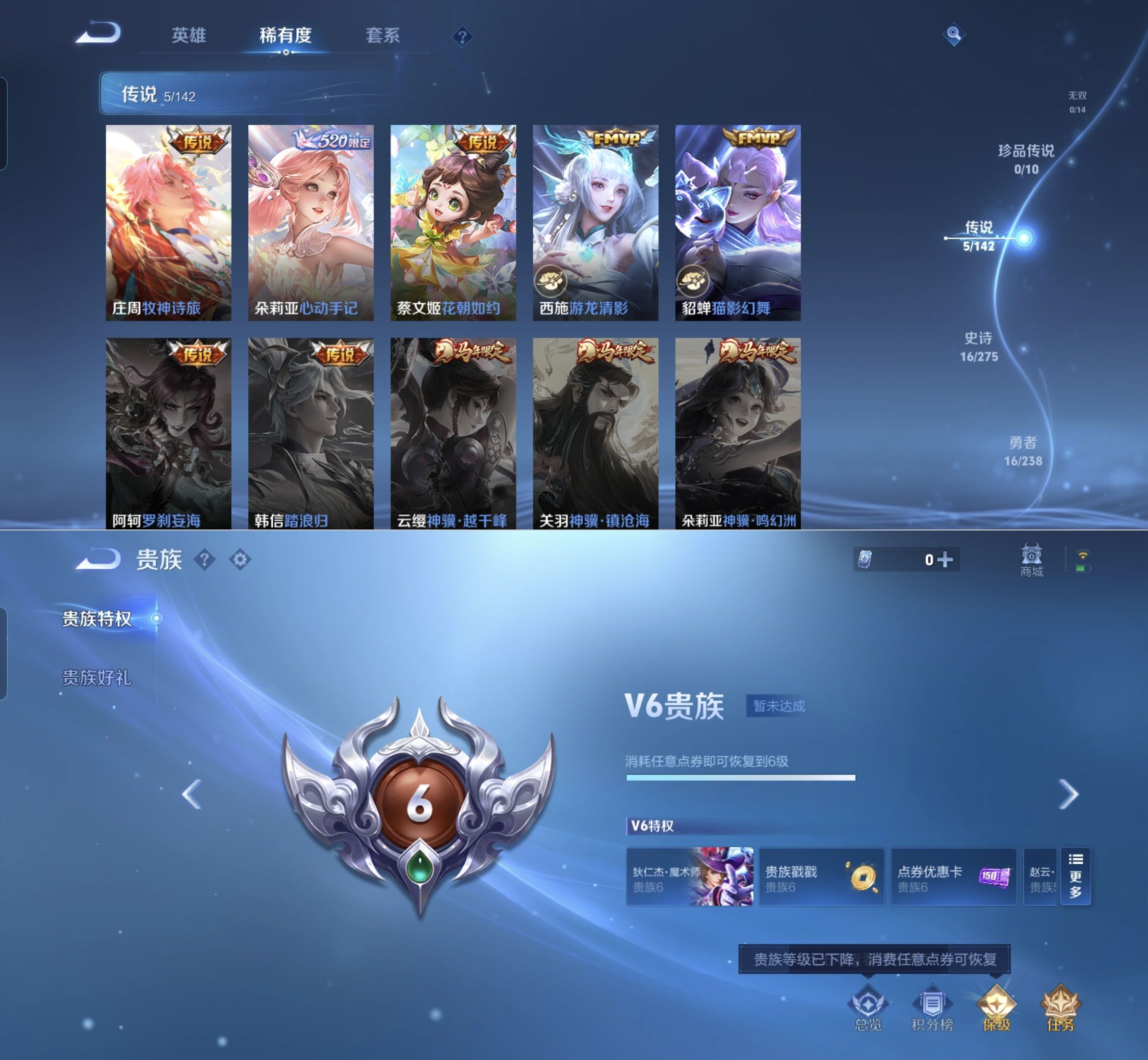 贵族等级:v6皮肤数:48传说品质5 英雄数:48