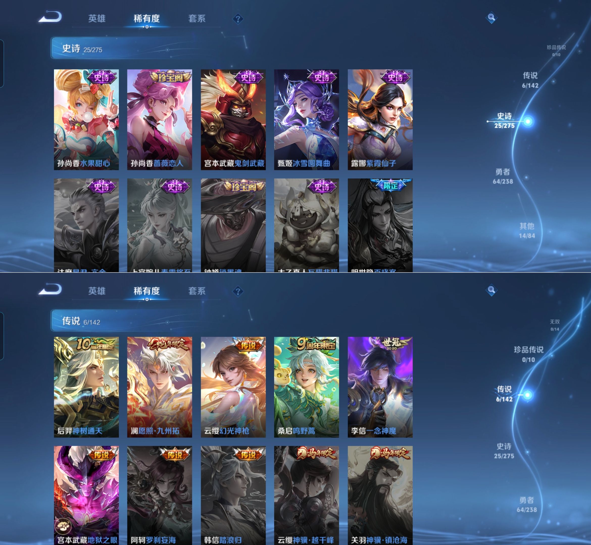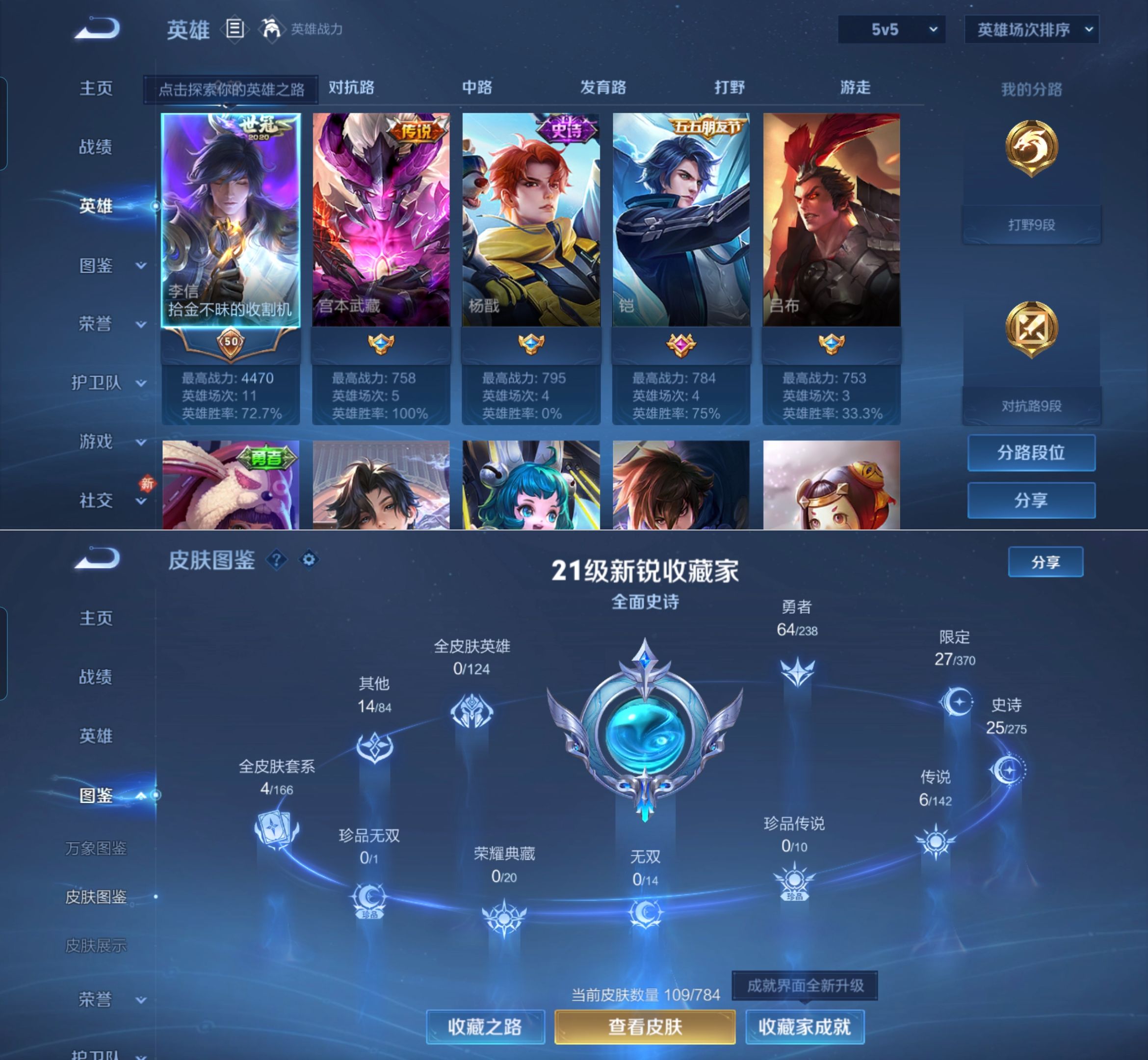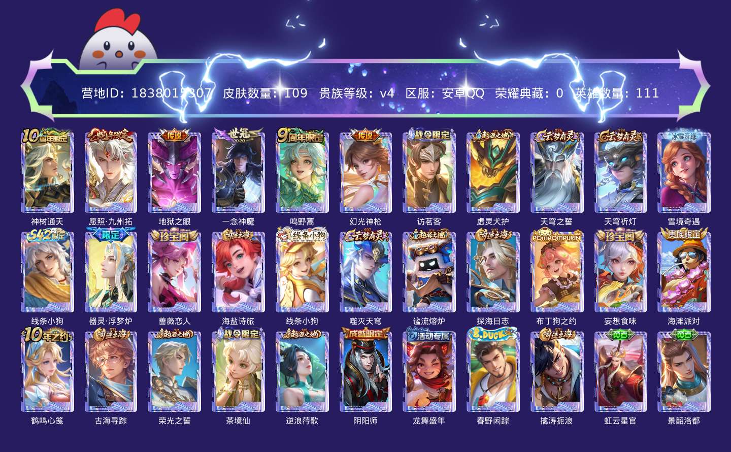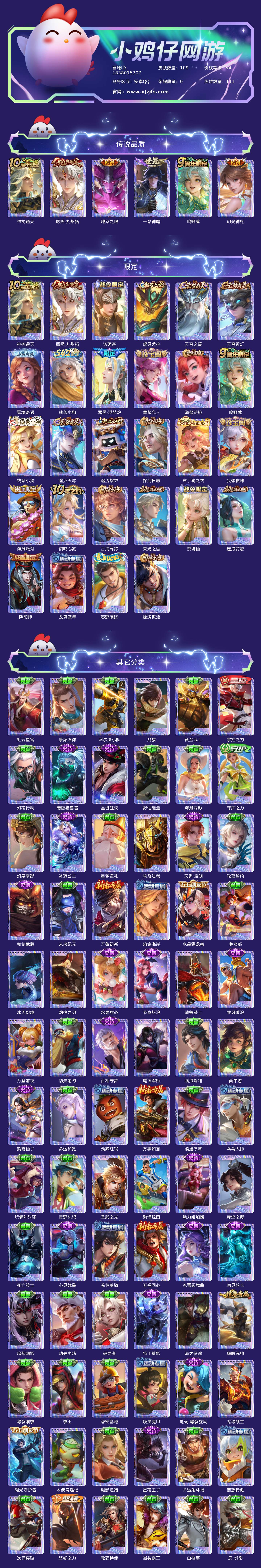 贵族等级:v4皮肤数:109传说品质6 生肖限定1 英雄数:111