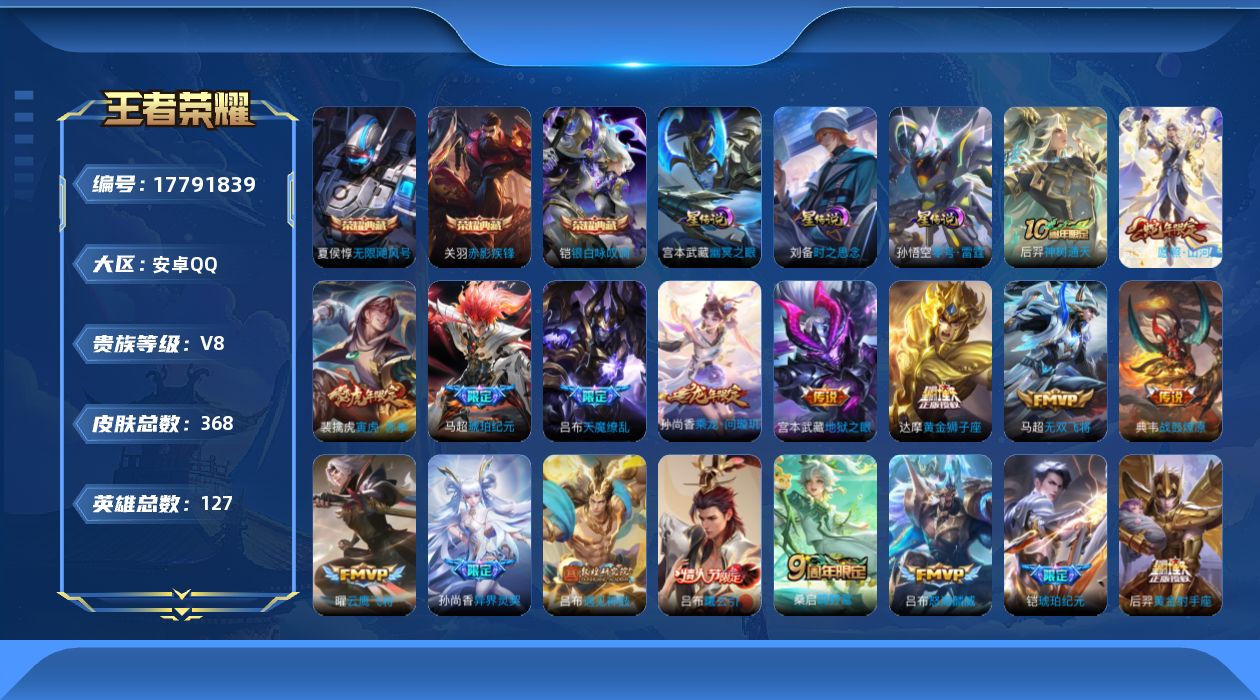 贵族等级:v8皮肤数:368传说品质25 荣耀典藏3 生肖限定6 情人节限定1 英雄数:127