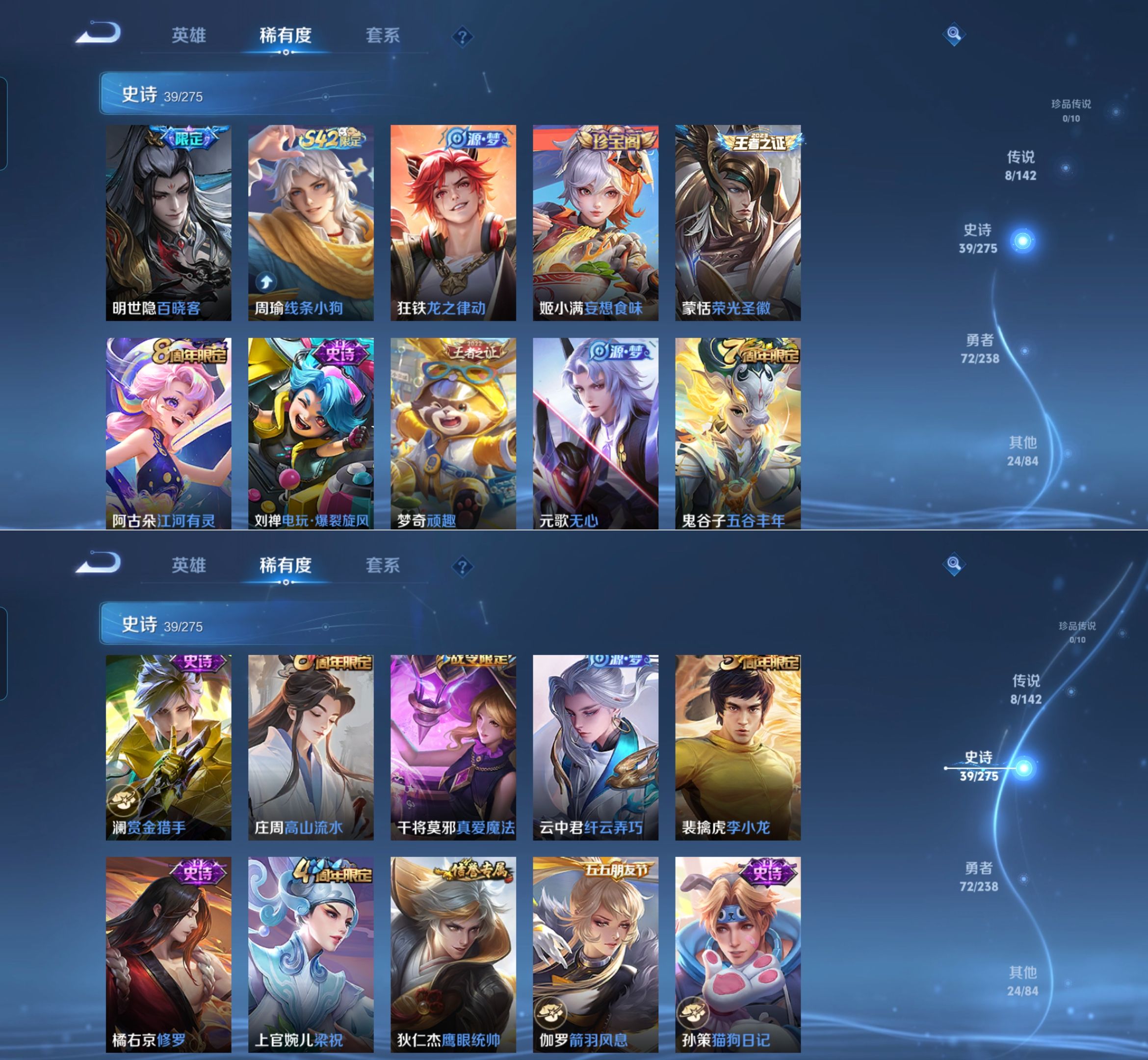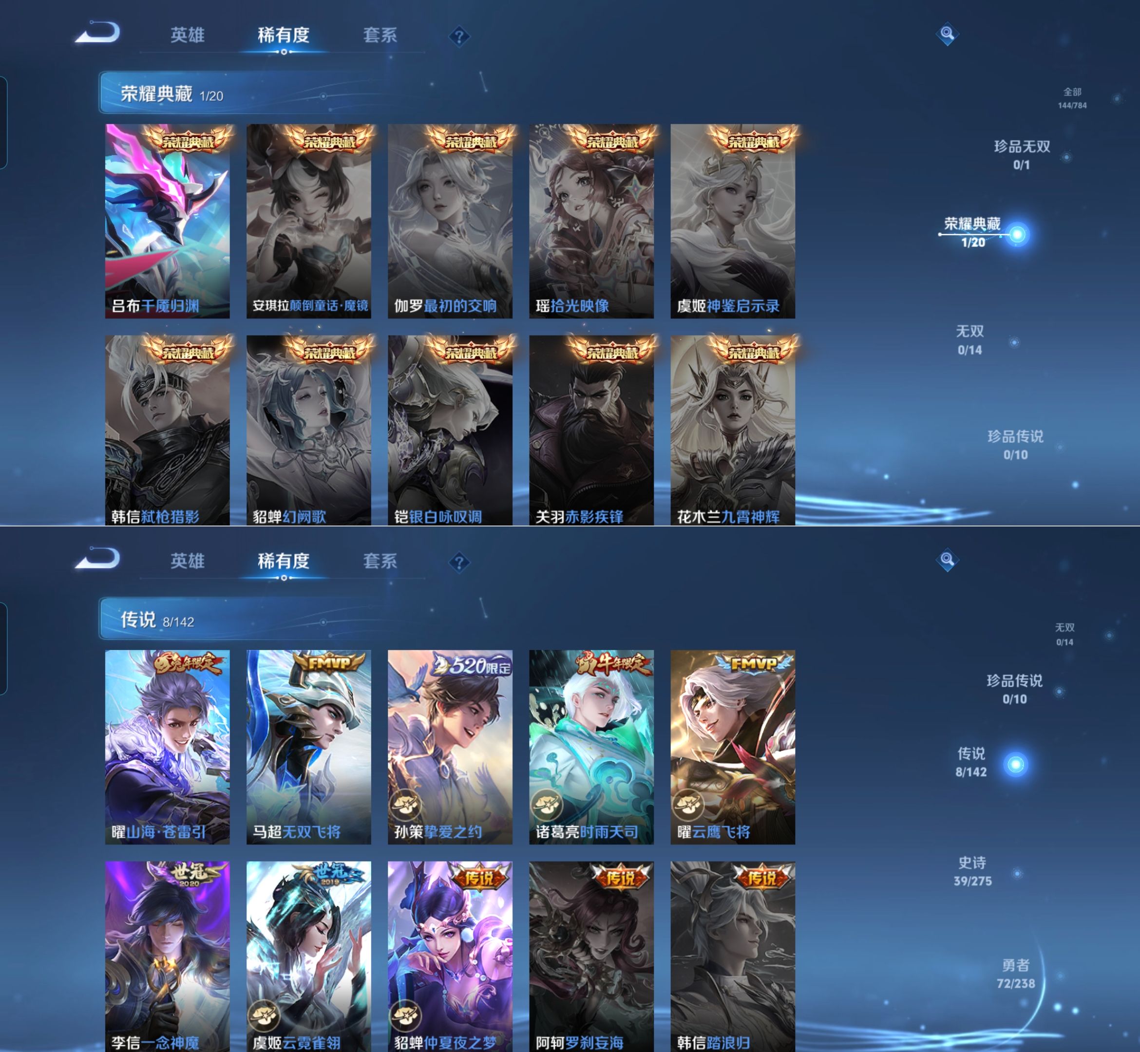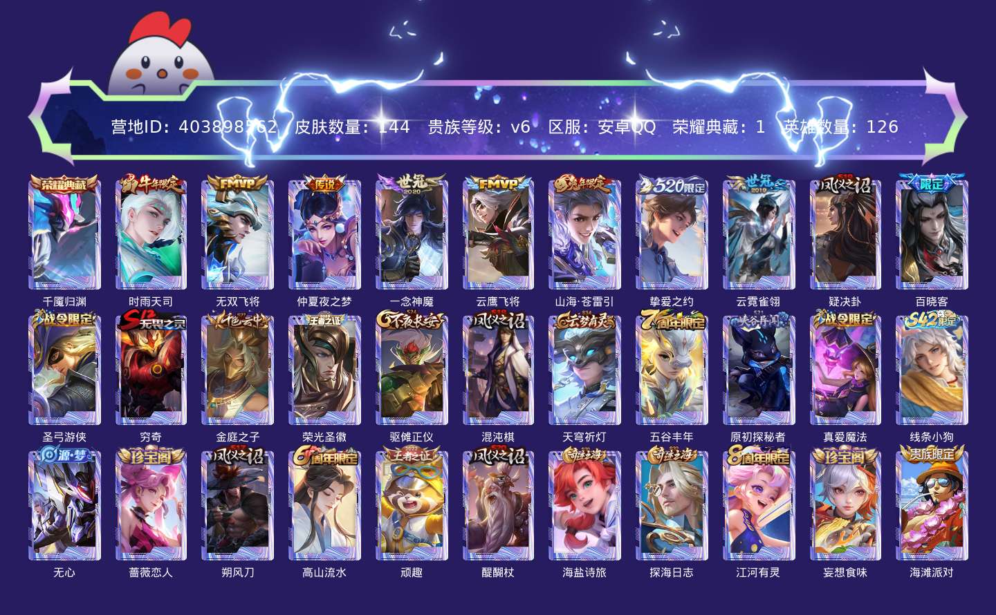 贵族等级:v6皮肤数:144传说品质8 生肖限定2 荣耀典藏1 英雄数:126