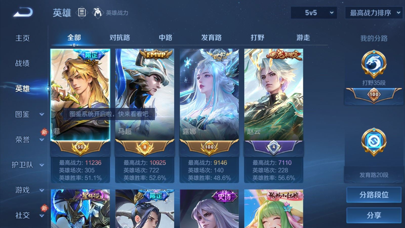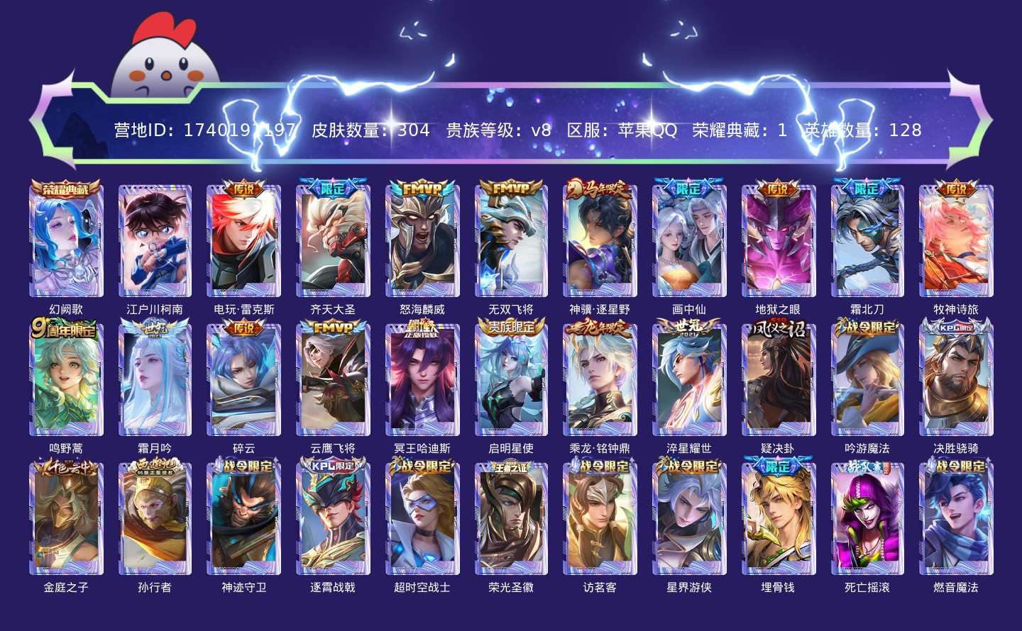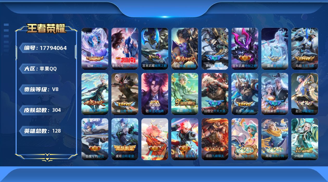 贵族等级:v8皮肤数:304传说品质17 生肖限定4 荣耀典藏1 珍品传说1 英雄数:128