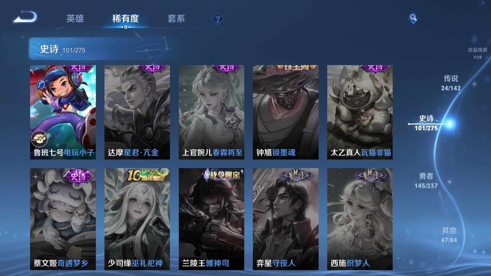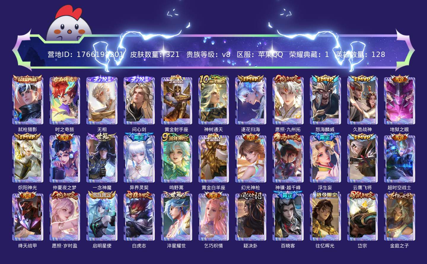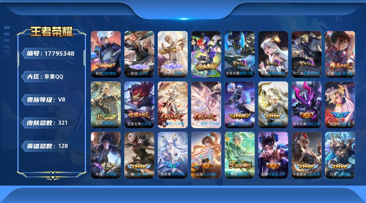 贵族等级:v8皮肤数:323传说品质24 生肖限定8 无双2 珍品传说1 荣耀典藏1 英雄数:128