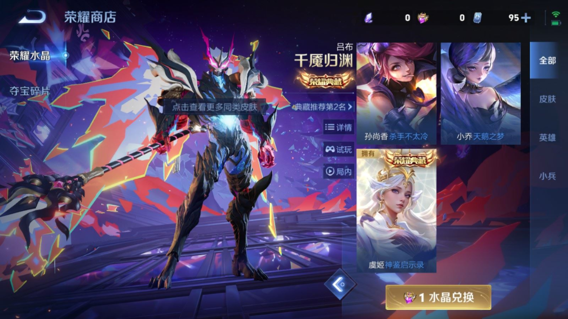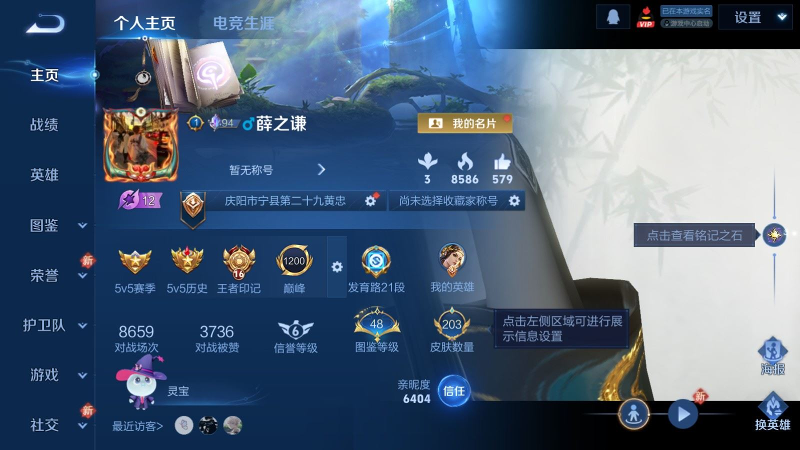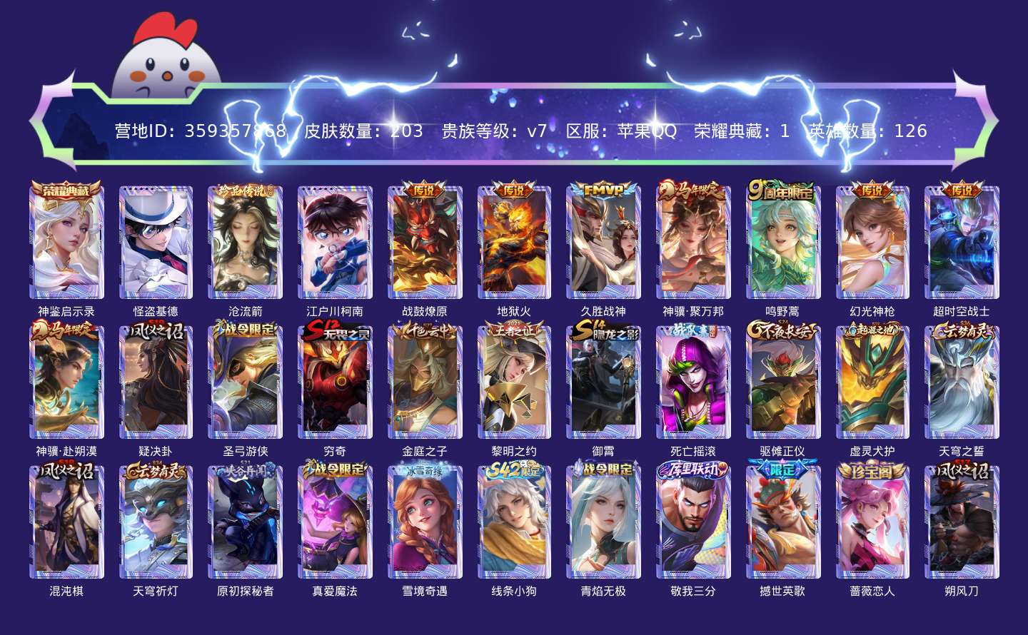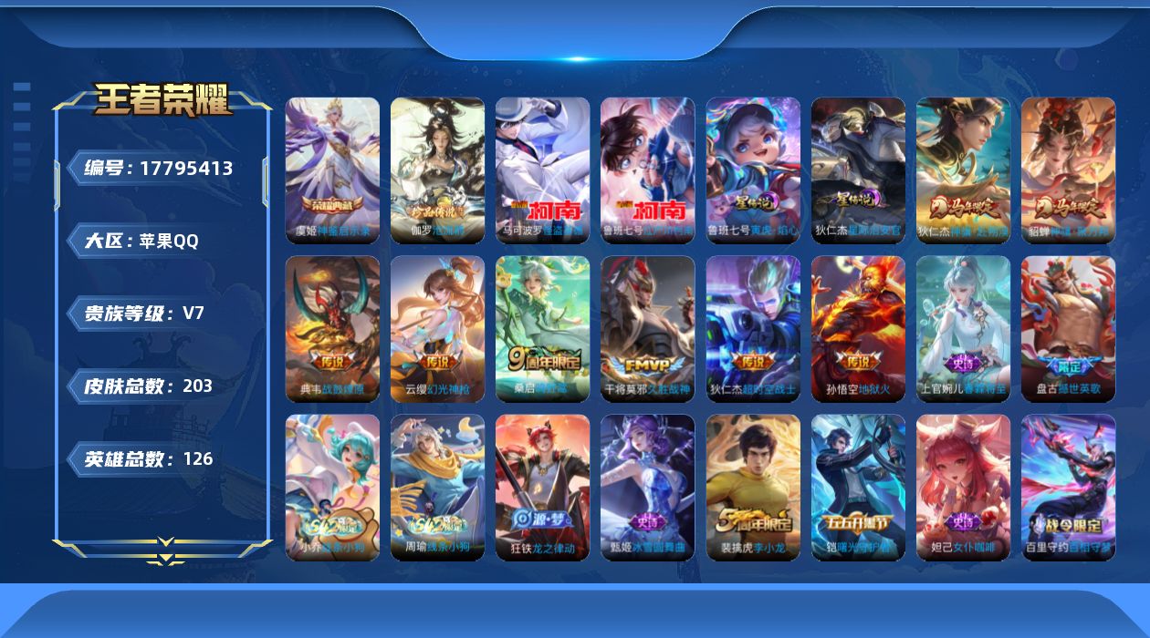 贵族等级:v7皮肤数:203传说品质8 生肖限定2 珍品传说3 荣耀典藏1 英雄数:126