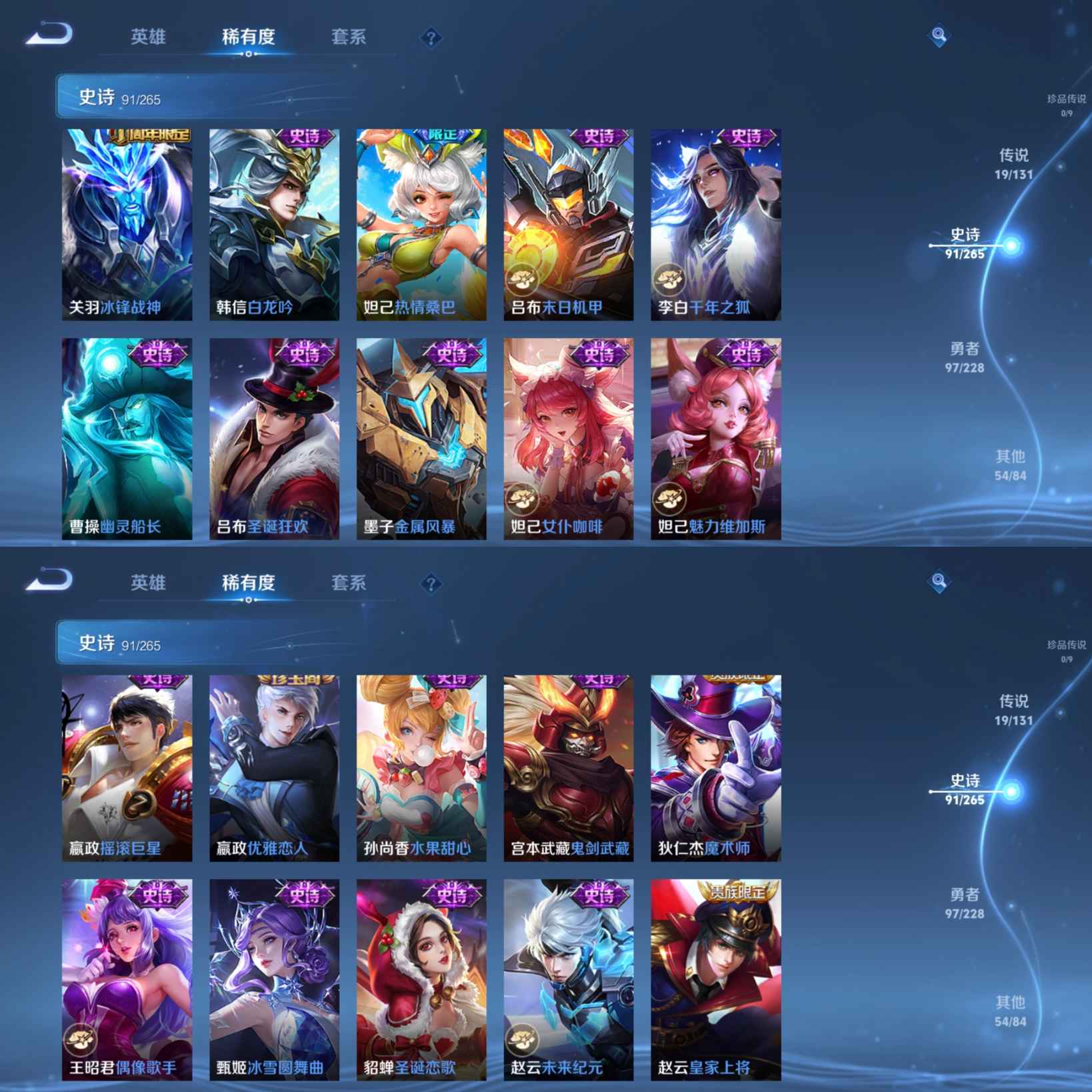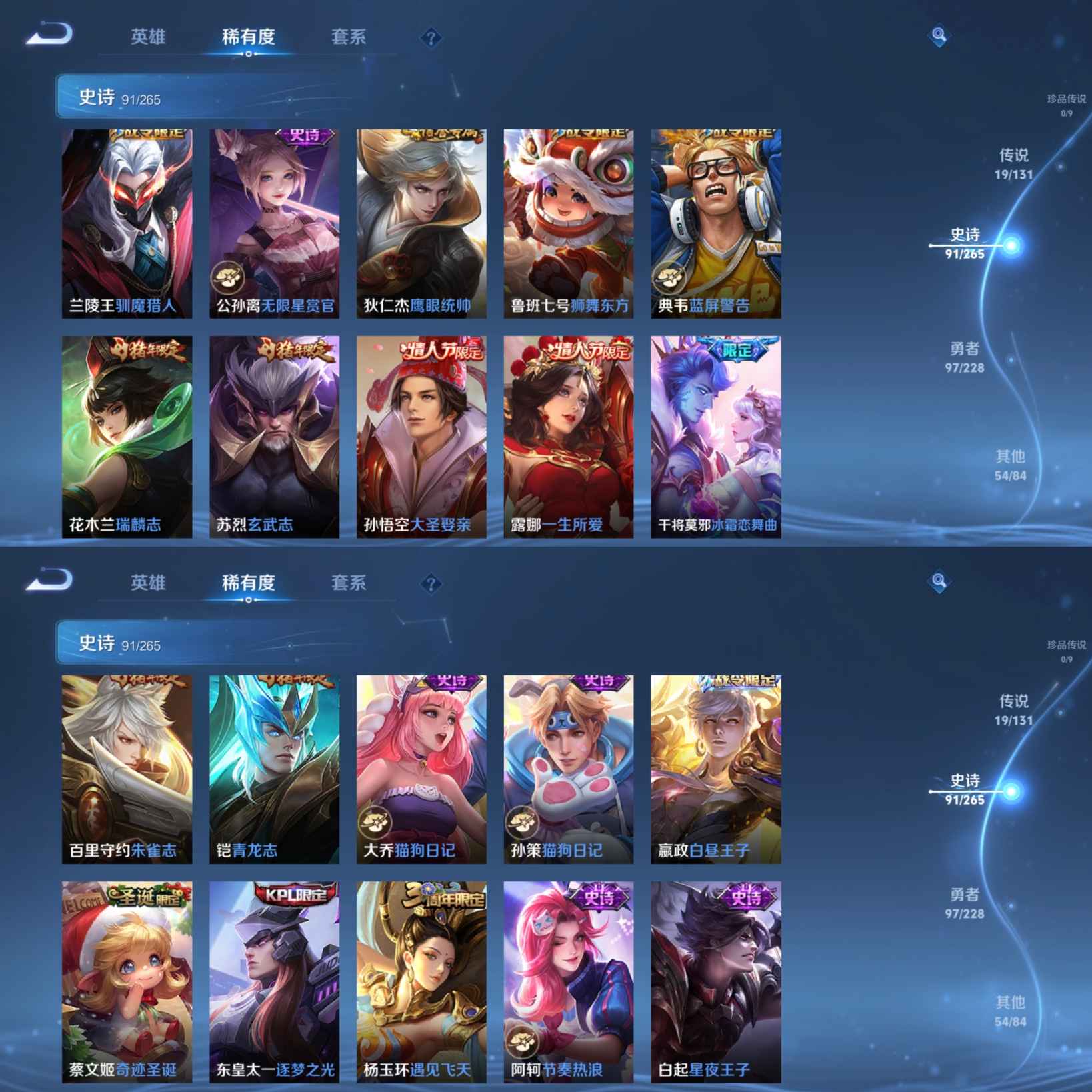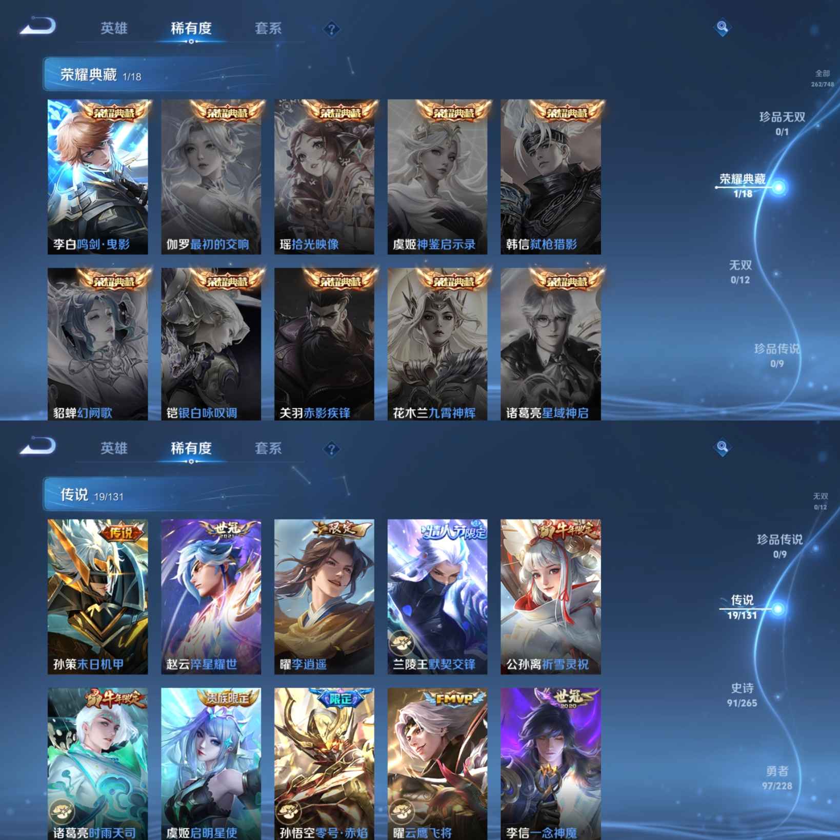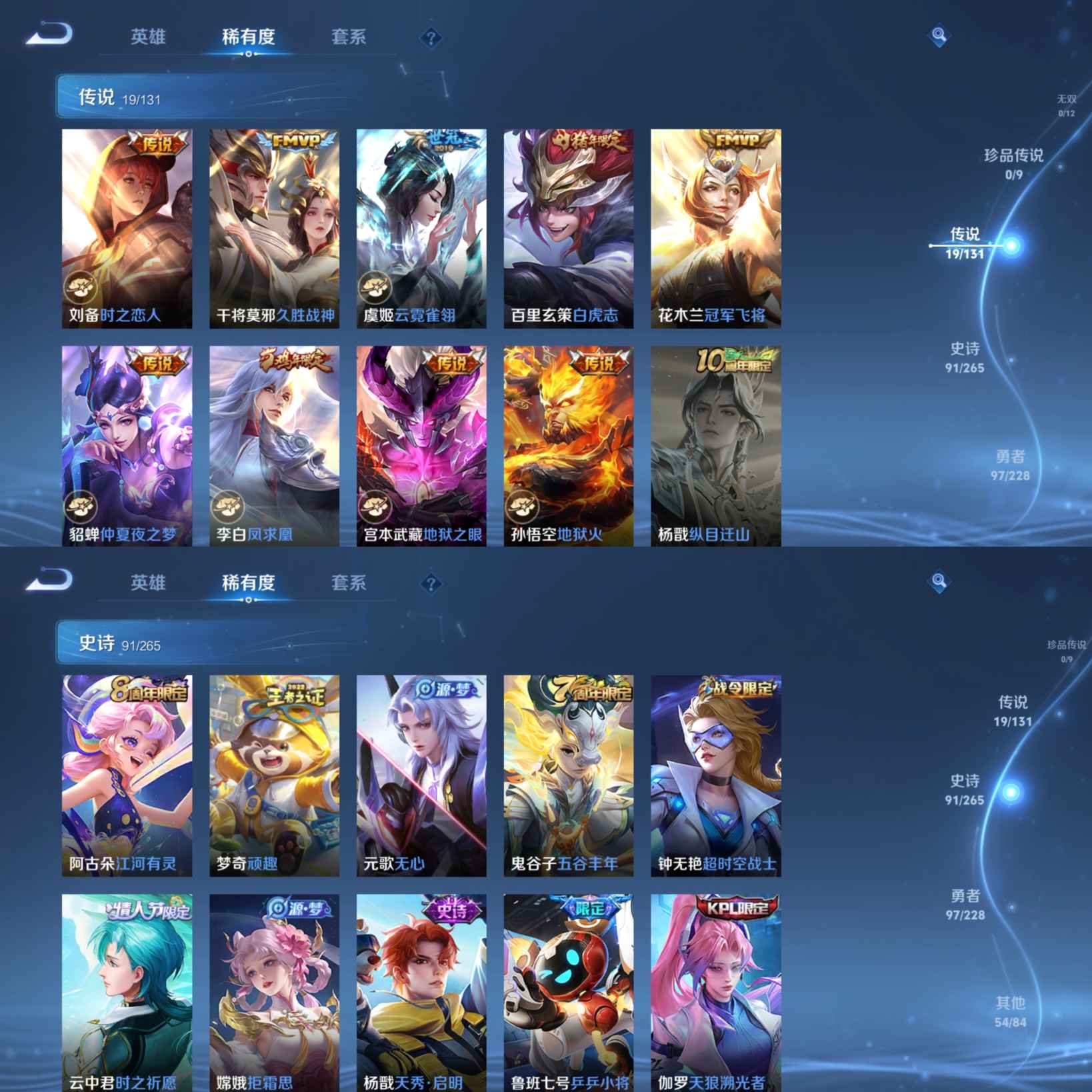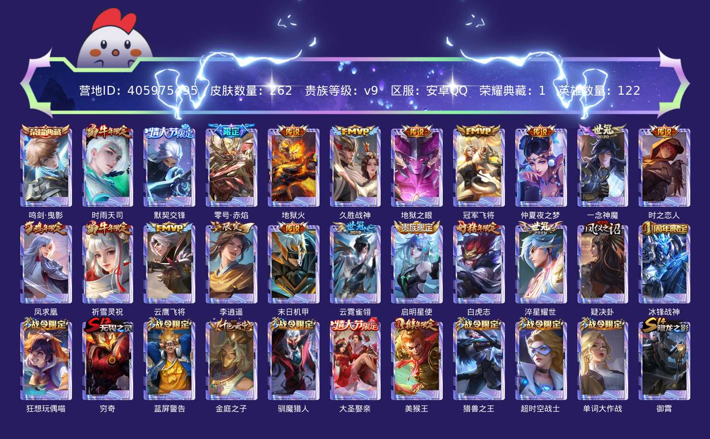 贵族等级:v9皮肤数:262传说品质19 生肖限定10 情人节限定5 荣耀典藏1 英雄数:122