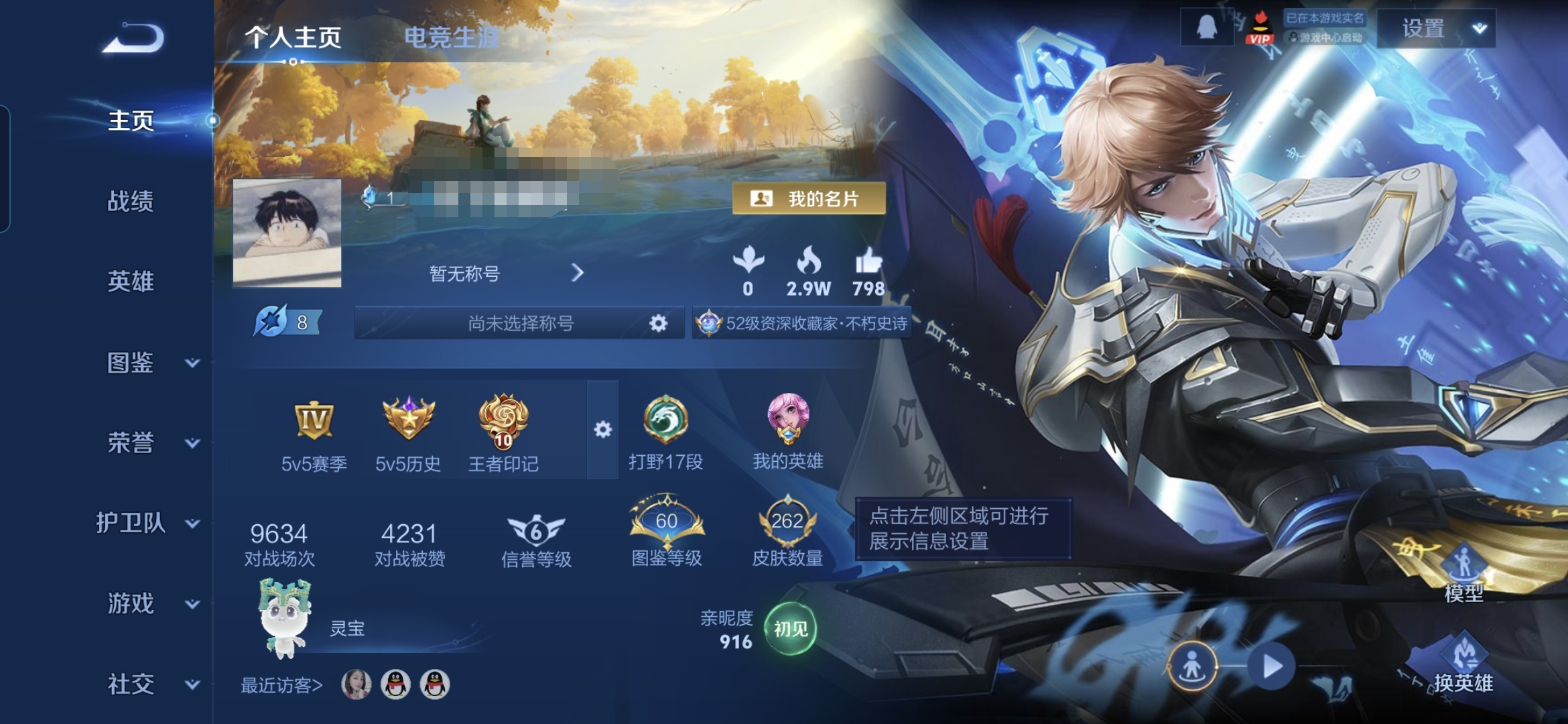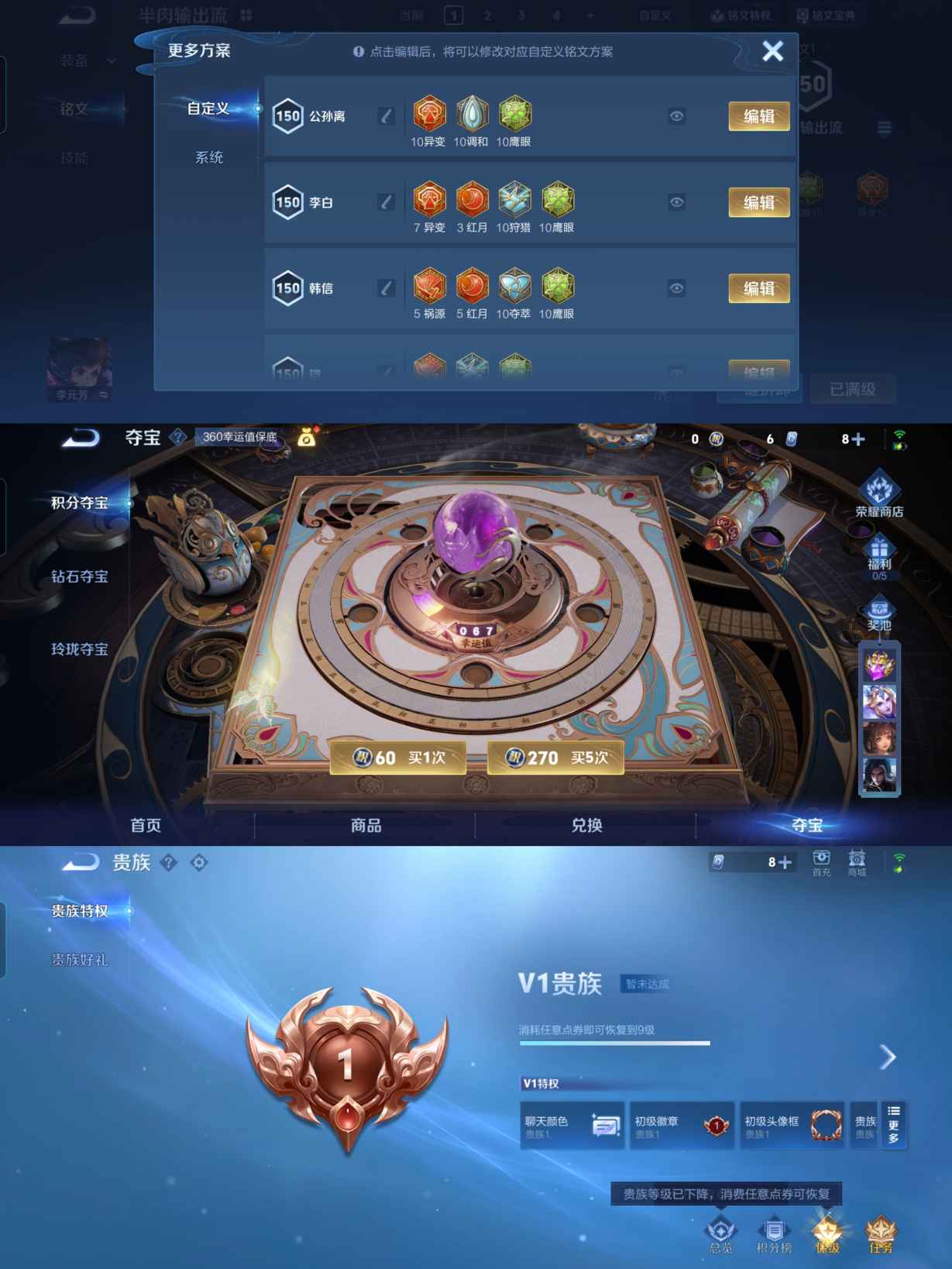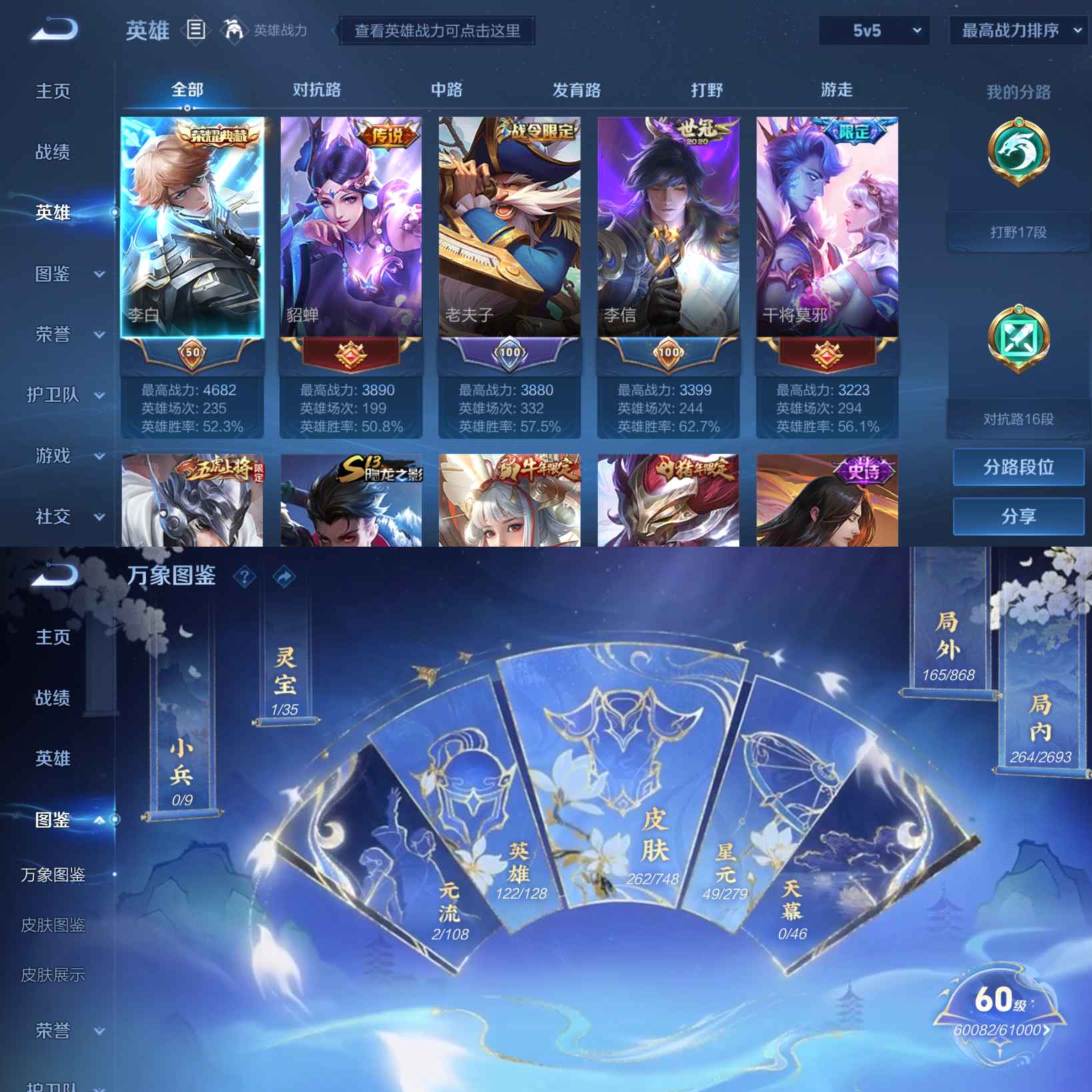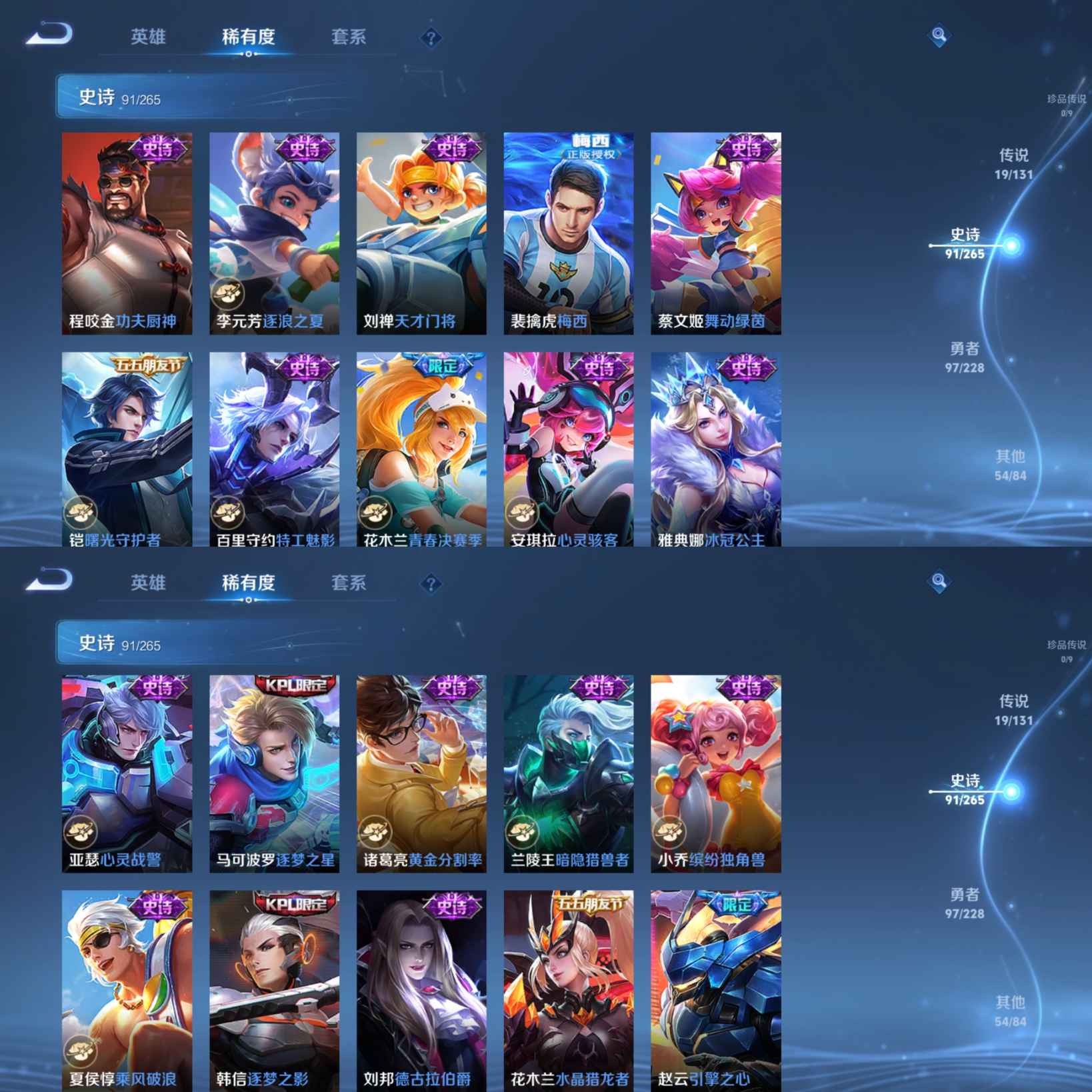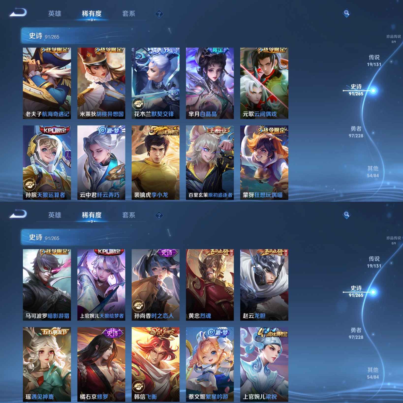贵族等级:v9皮肤数:262传说品质19 生肖限定10 情人节限定5 荣耀典藏1 英雄数:122