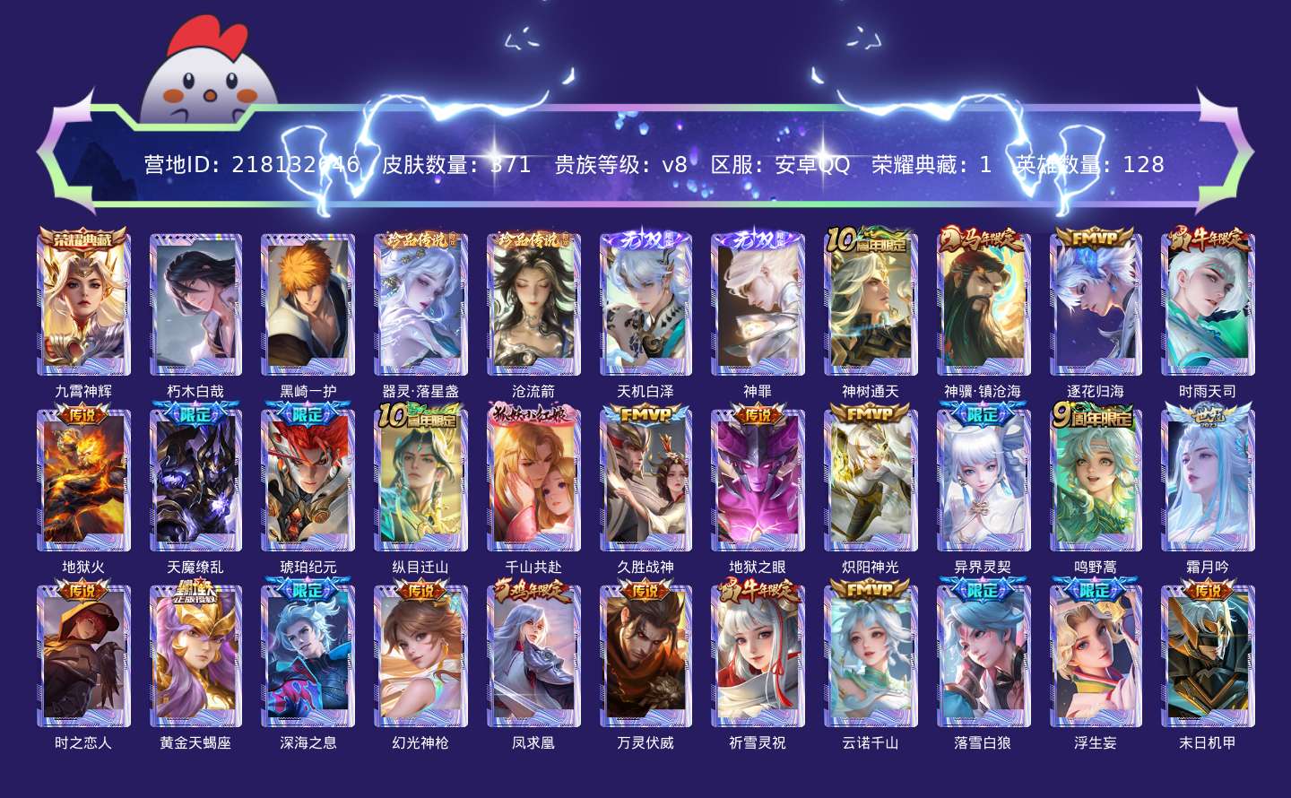 传说品质_后羿_神树通天传说品质_关羽_神骥·镇沧海传说品质_澜_逐花归海传说品质_诸葛亮_时雨天司传说品质_孙悟空_地狱火传说品质_吕布_天魔缭乱传说品质_马超_琥珀纪元传说品质_杨戬_纵目迁山传说品质_干将莫邪_千山共赴传说品质_干将莫邪_久胜战神传说品质_宫本武藏_地狱之眼传说品质_镜_炽阳神光传说品质_孙尚香_异界灵契传说品质_桑启_鸣野蒿传说品质_露娜_霜月吟传说品质_刘备_时之恋人传说品质_墨子_黄金天蝎座传说品质_马可波罗_深海之息传说品质_云缨_幻光神枪传说品质_李白_凤求凰传说品质_曹操_万灵伏威传说品质_公孙离_祈雪灵祝传说品质_公孙离_云诺千山传说品质_亚连_落雪白狼传说品质_夏洛特_浮生妄传说品质_孙策_末日机甲传说品质_孙策_乘龙·淬吴钩传说品质_狄仁杰_神器·狴犴令传说品质_铠_绛天战甲传说品质_虞姬_愿照·岁时盈传说品质_虞姬_启明星使传说品质_裴擒虎_祥瑞亨通
