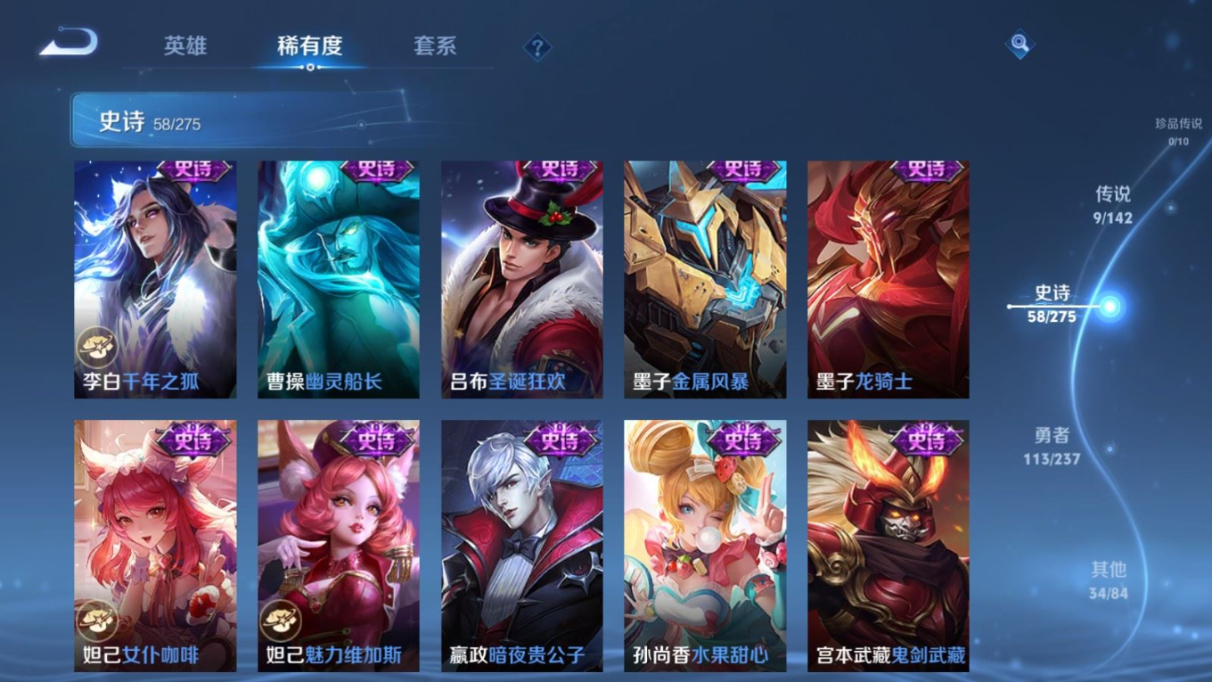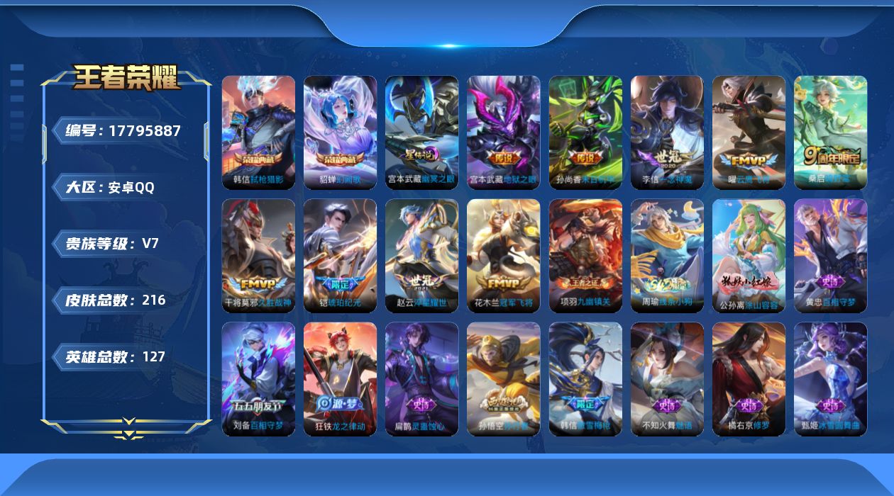 贵族等级:v7皮肤数:216传说品质9 荣耀典藏2 英雄数:127