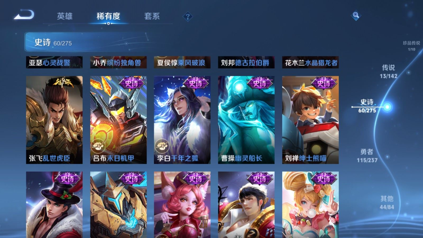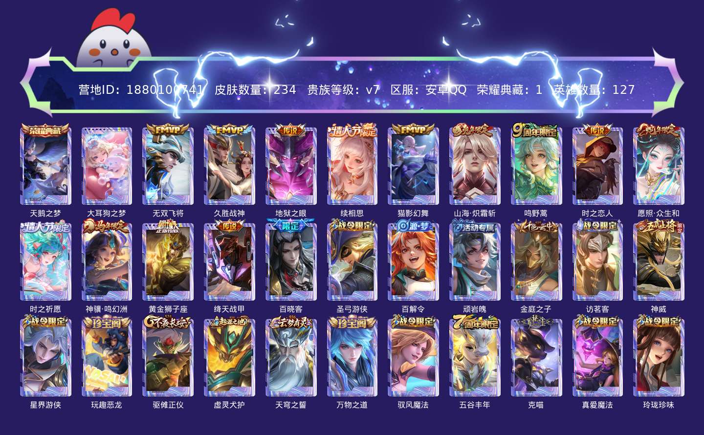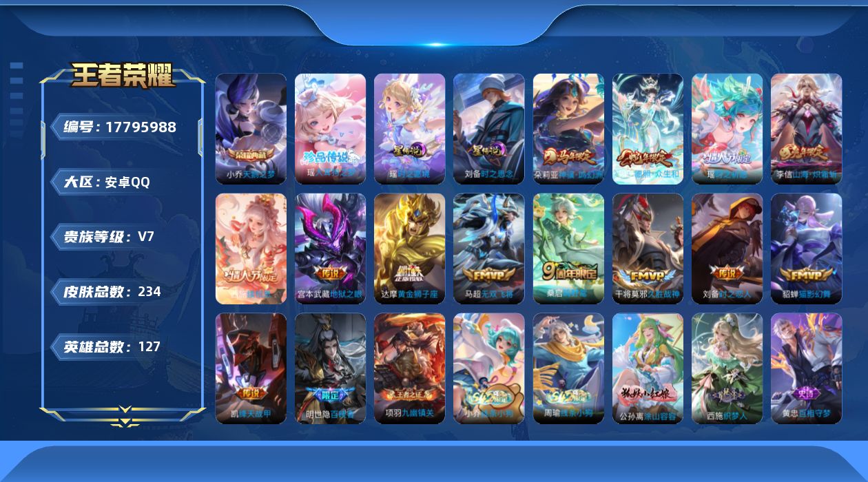 贵族等级:v7皮肤数:234传说品质13 情人节限定2 生肖限定3 荣耀典藏1 珍品传说1 英雄数:127