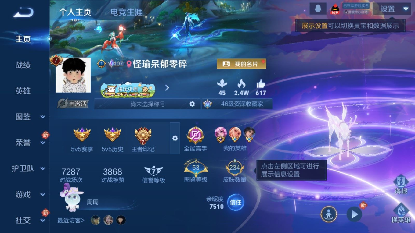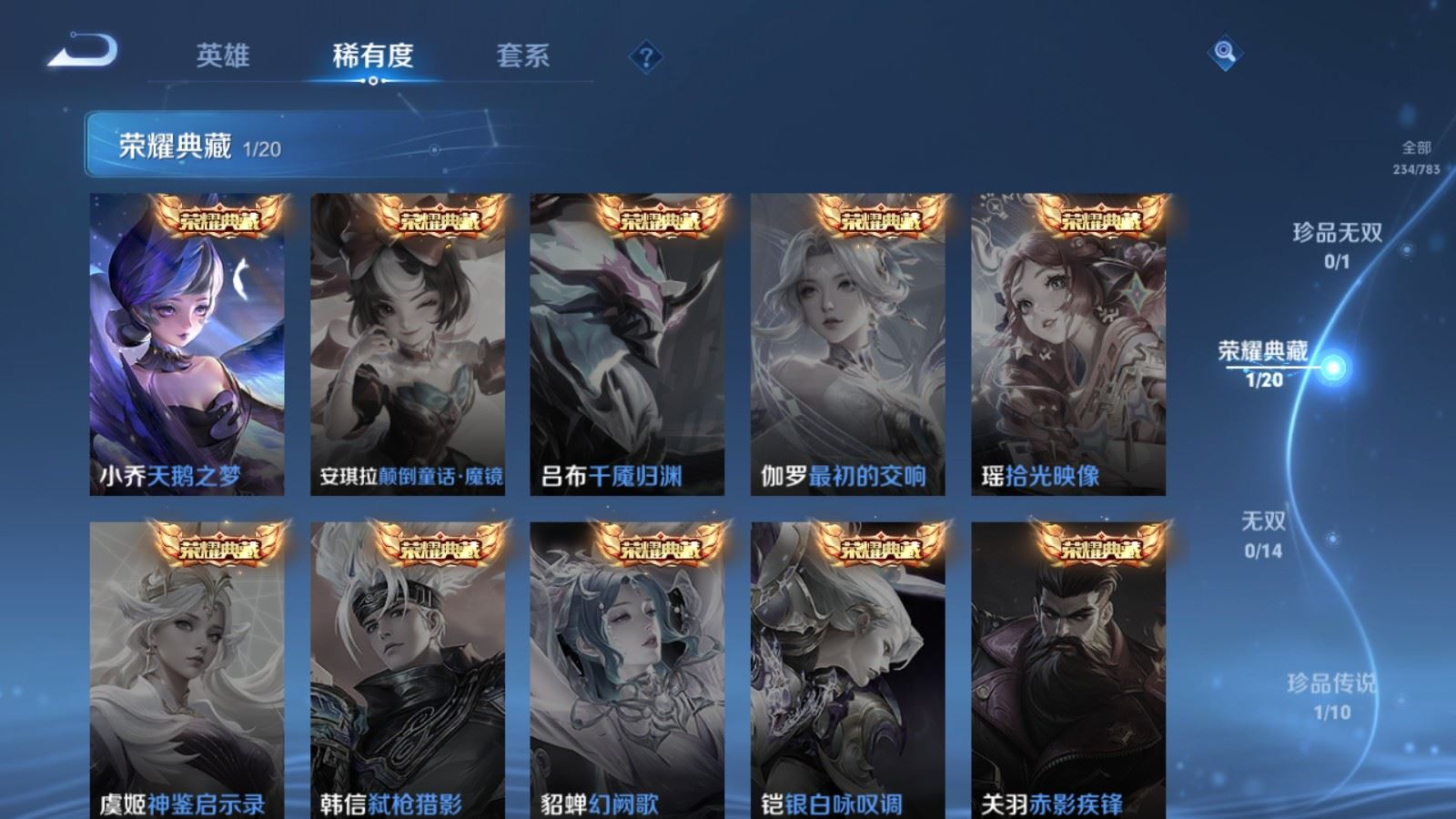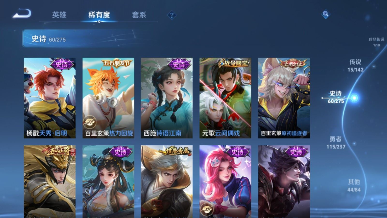 贵族等级:v7皮肤数:234传说品质13 情人节限定2 生肖限定3 荣耀典藏1 珍品传说1 英雄数:127