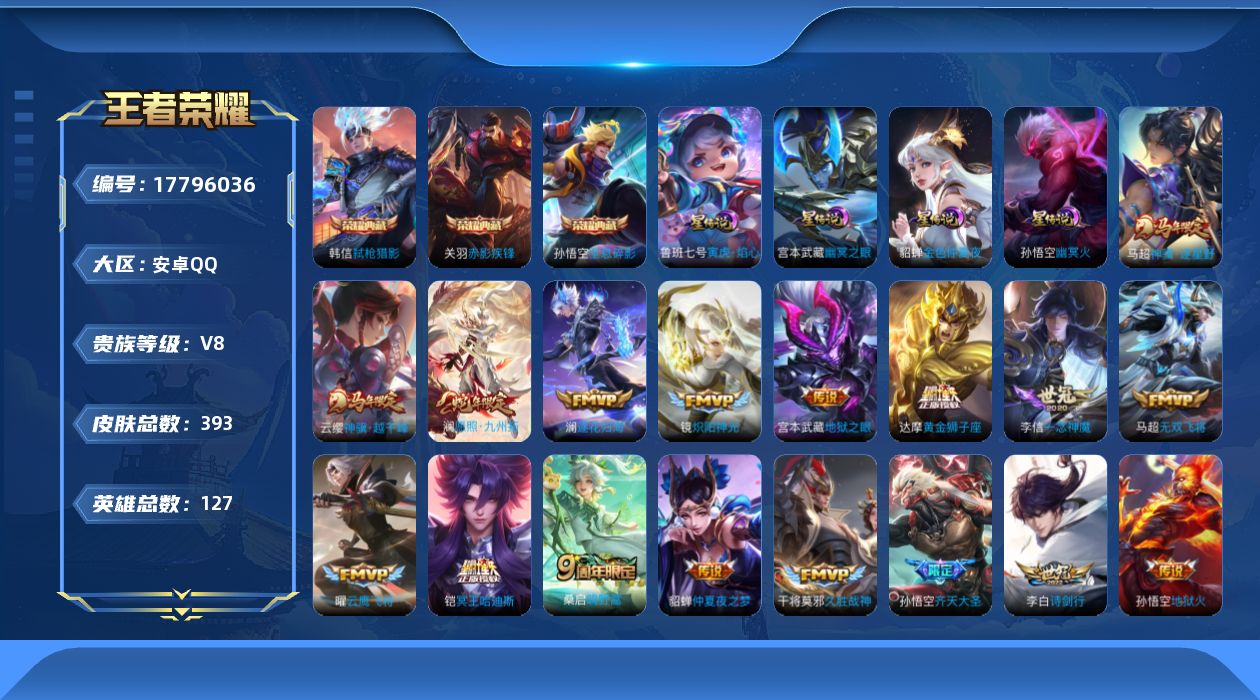贵族等级:v8皮肤数:393荣耀典藏3 传说品质19 生肖限定4 情人节限定2 英雄数:127