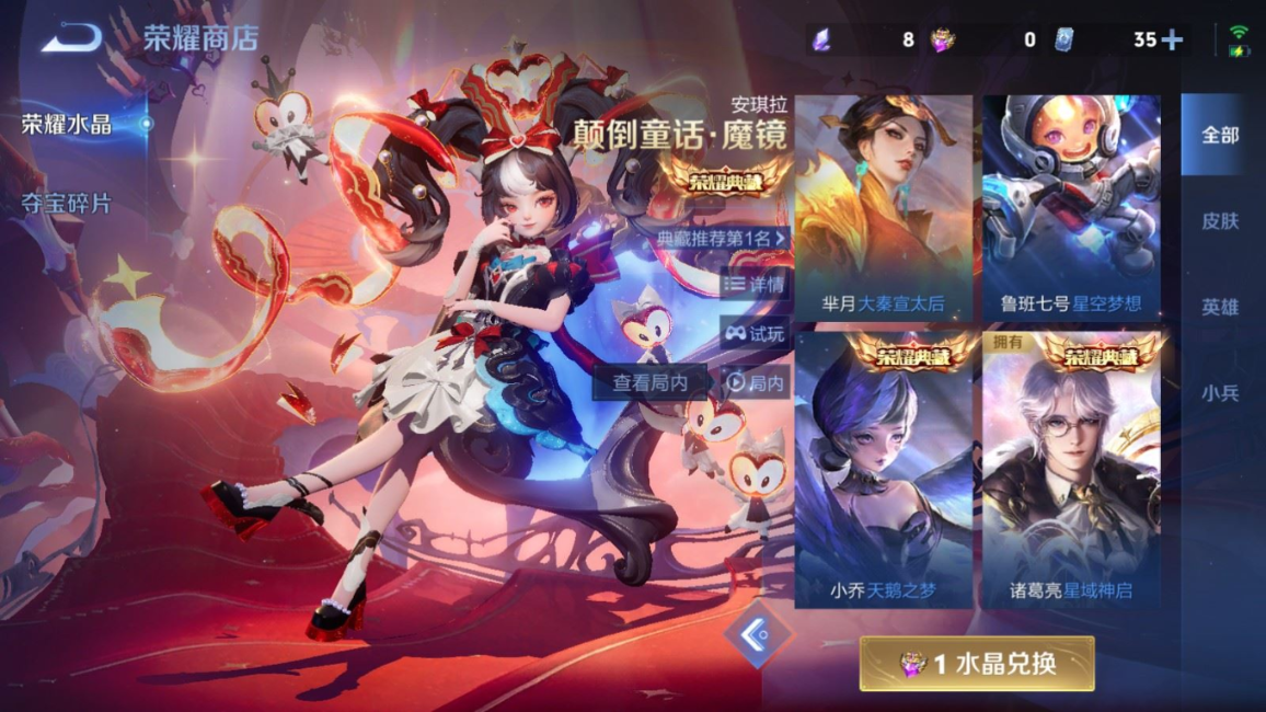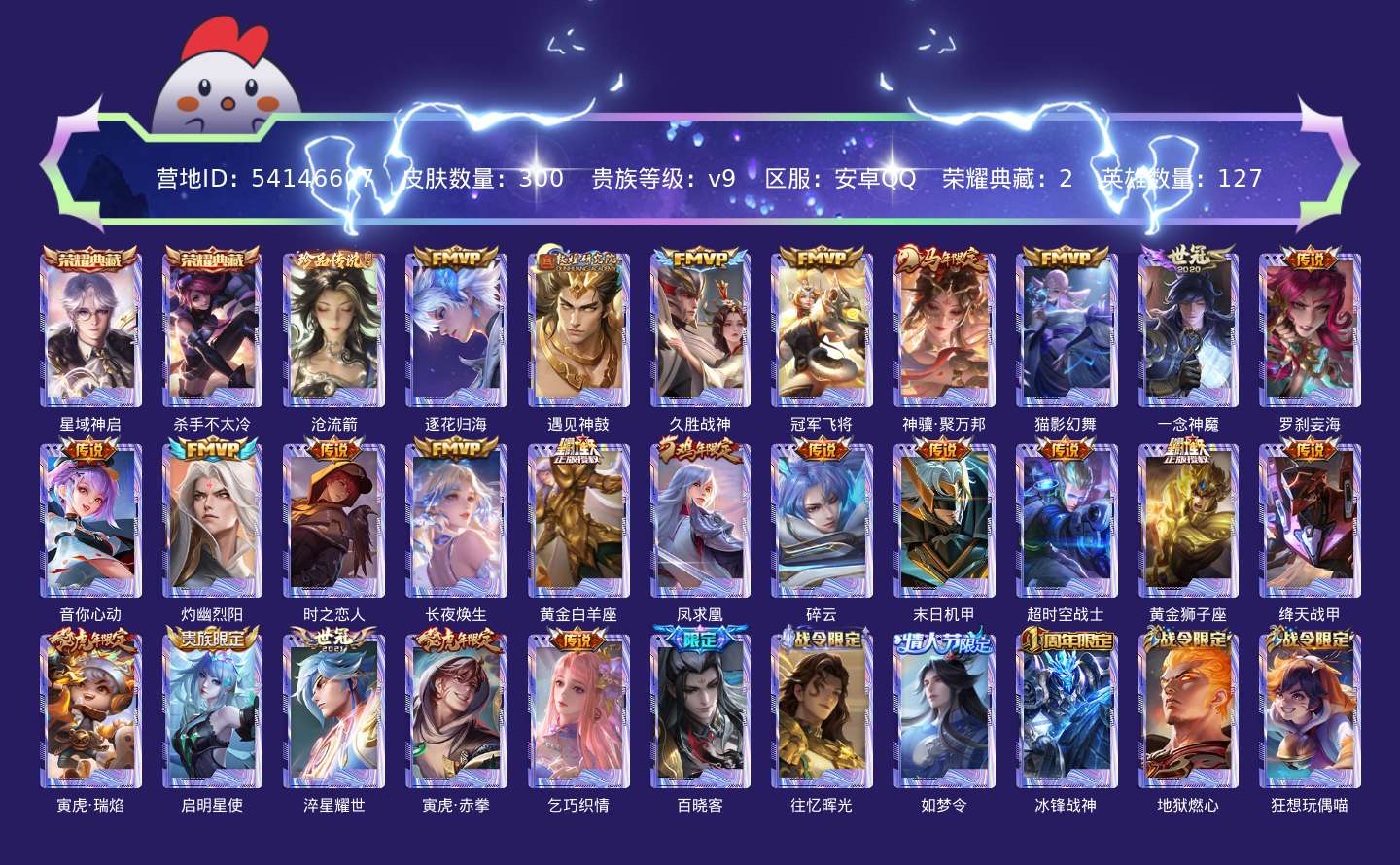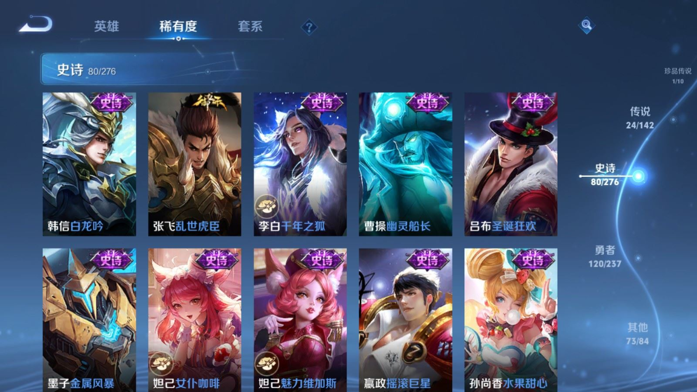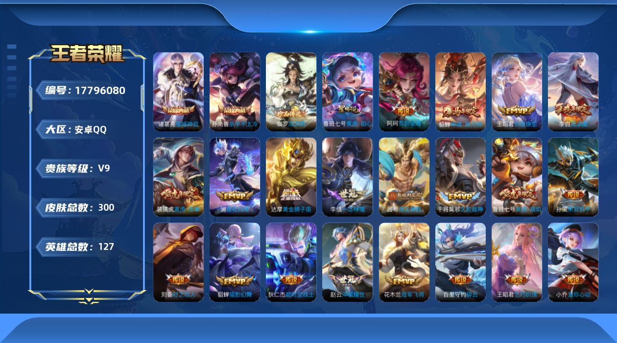 贵族等级:v9皮肤数:300情人节限定2 传说品质24 生肖限定12 荣耀典藏2 珍品传说1 英雄数:127